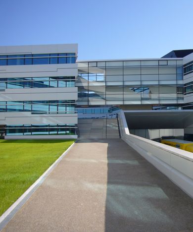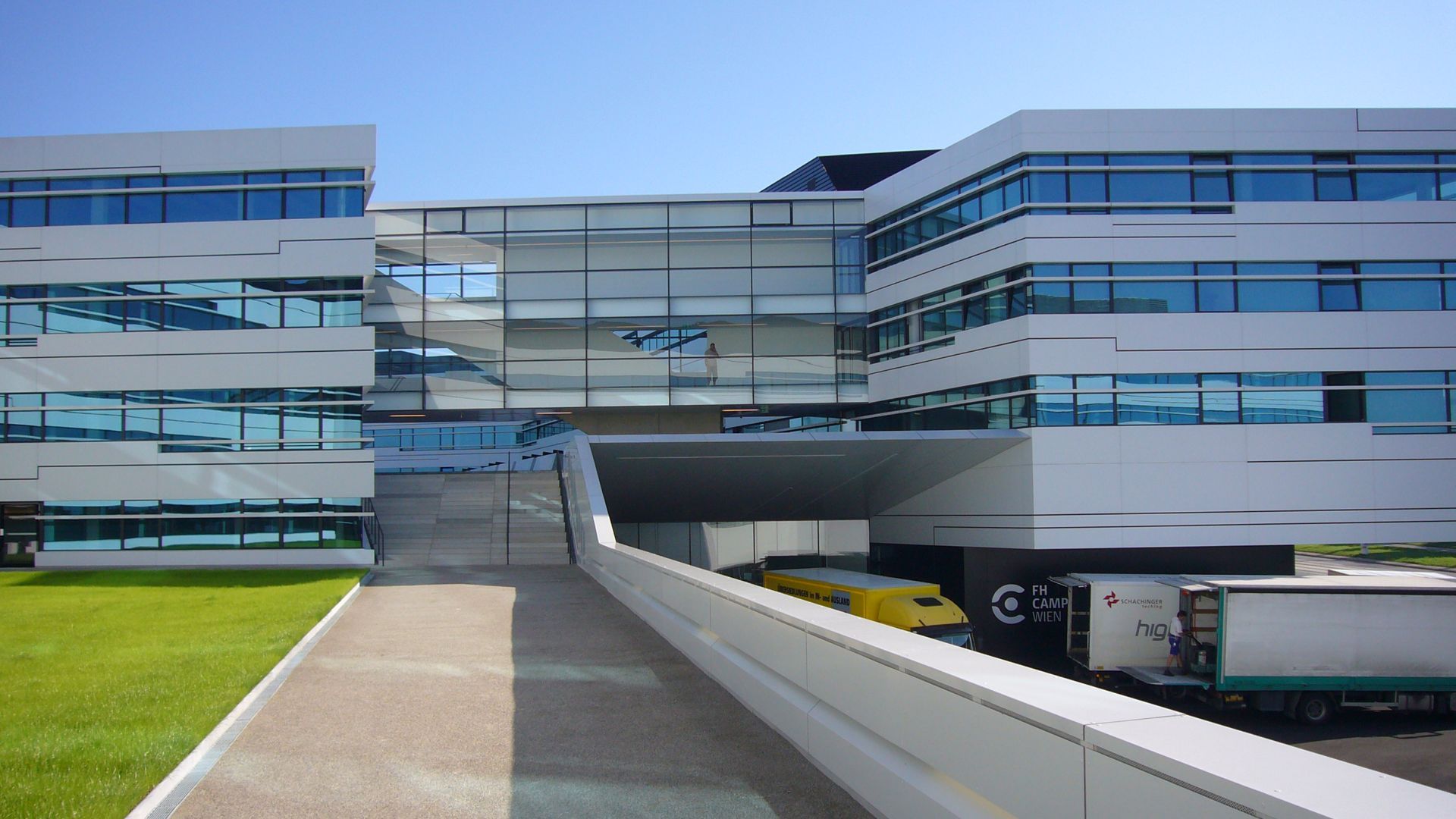 Das Projekt FH Campus Wien hat eine sehr komplexe Form im Grundriss. Es laufen über das gesamte Gebäude die Fensterbänder und Parapetverkleidungen durch. Der Architekt spielte hier mit betonten und nicht betonten Fugen.