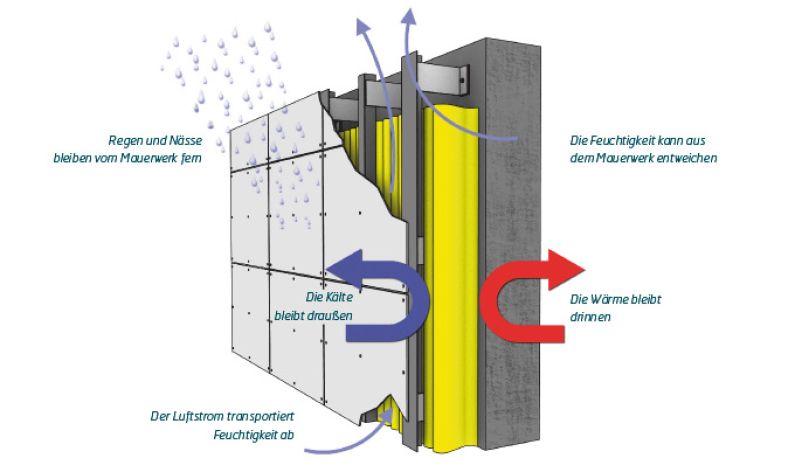 Die Dämmung (Wärme-, Kälte-, Brandschutz) und Fassadenbekleidung sind bei dem System der vorgehängten hinterlüfteten Fassade konstruktiv voneinander getrennt. Der angeordnete Hinterlüftungsraum regelt den Feuchtigkeitshaushalt im Baukörper. Dadurch ist auch ein optimales Innenraumklima sichergestellt.