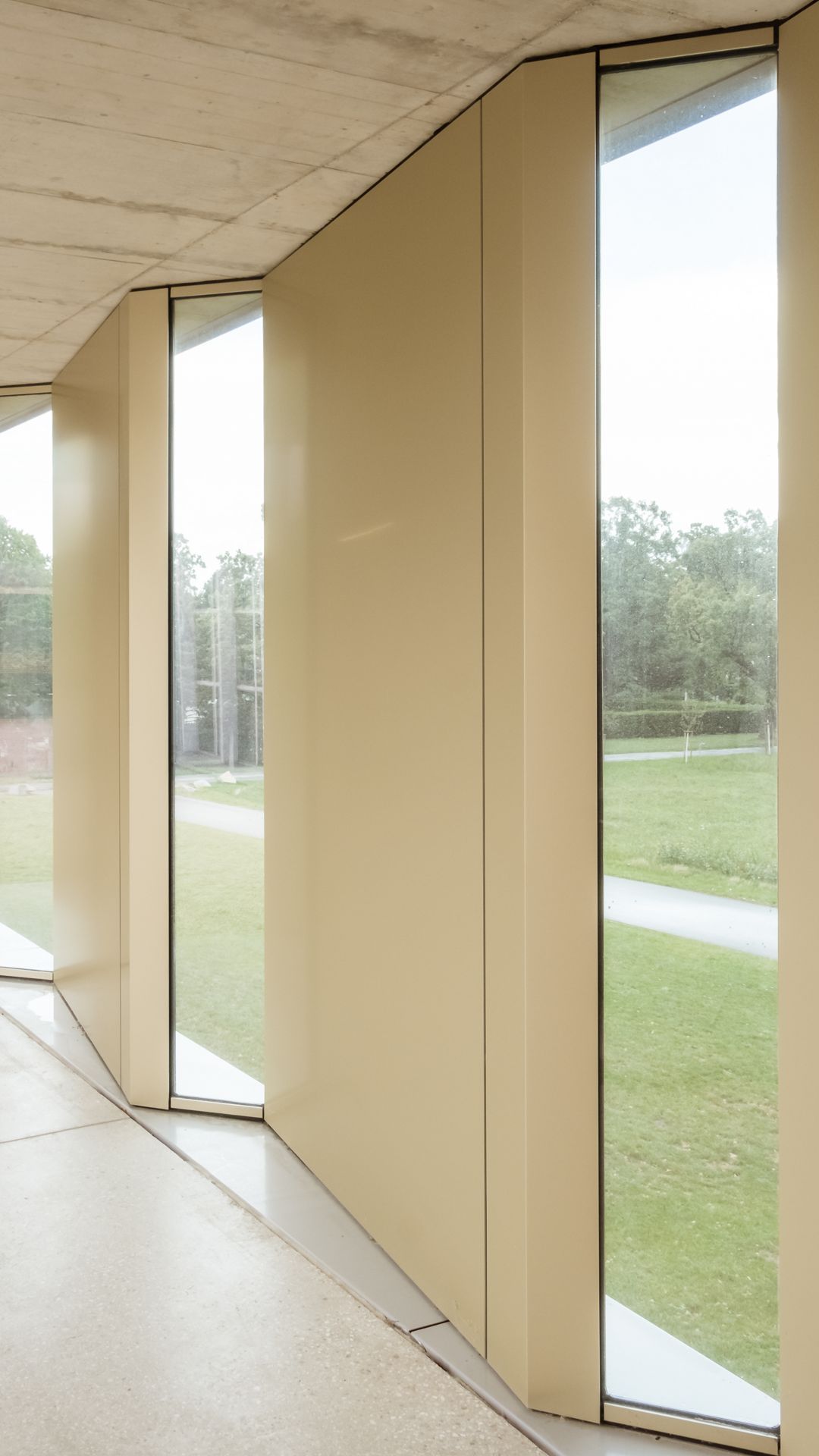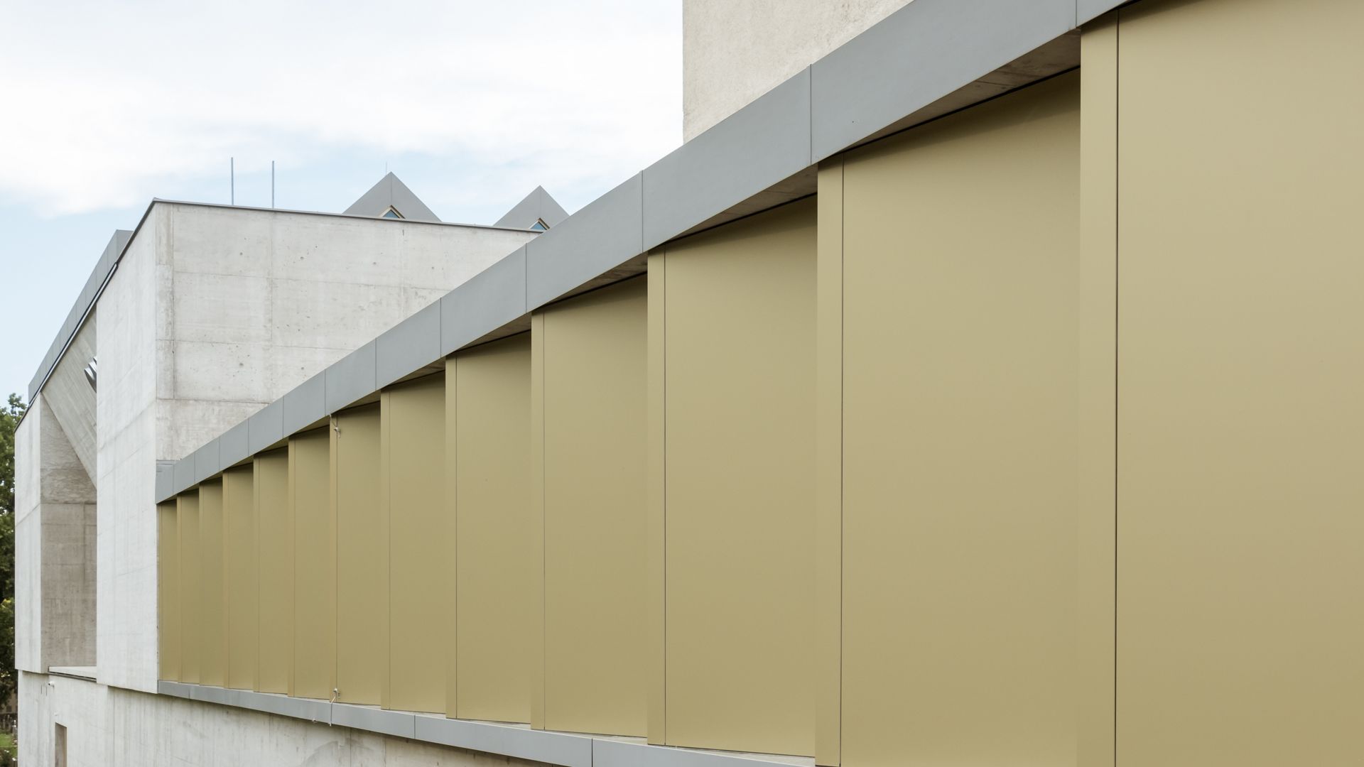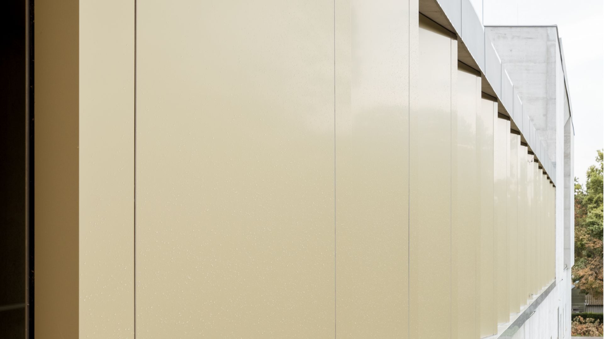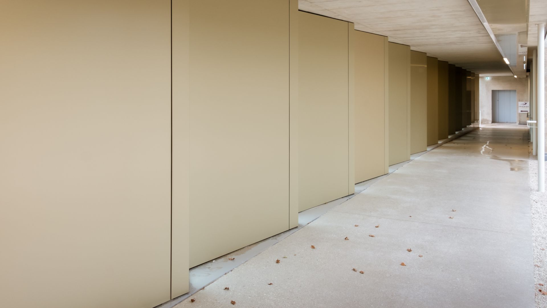 Durch die gefächerte Fassadenform und dem Wechsel von Vollmaterial zu kleinen Glasflächen, gewinnt der Gang im Krematorium an Dynamik und Helligkeit. Die exklusive Farbe verleiht dem Gebäude zusätzlich einen edlen Charakter.