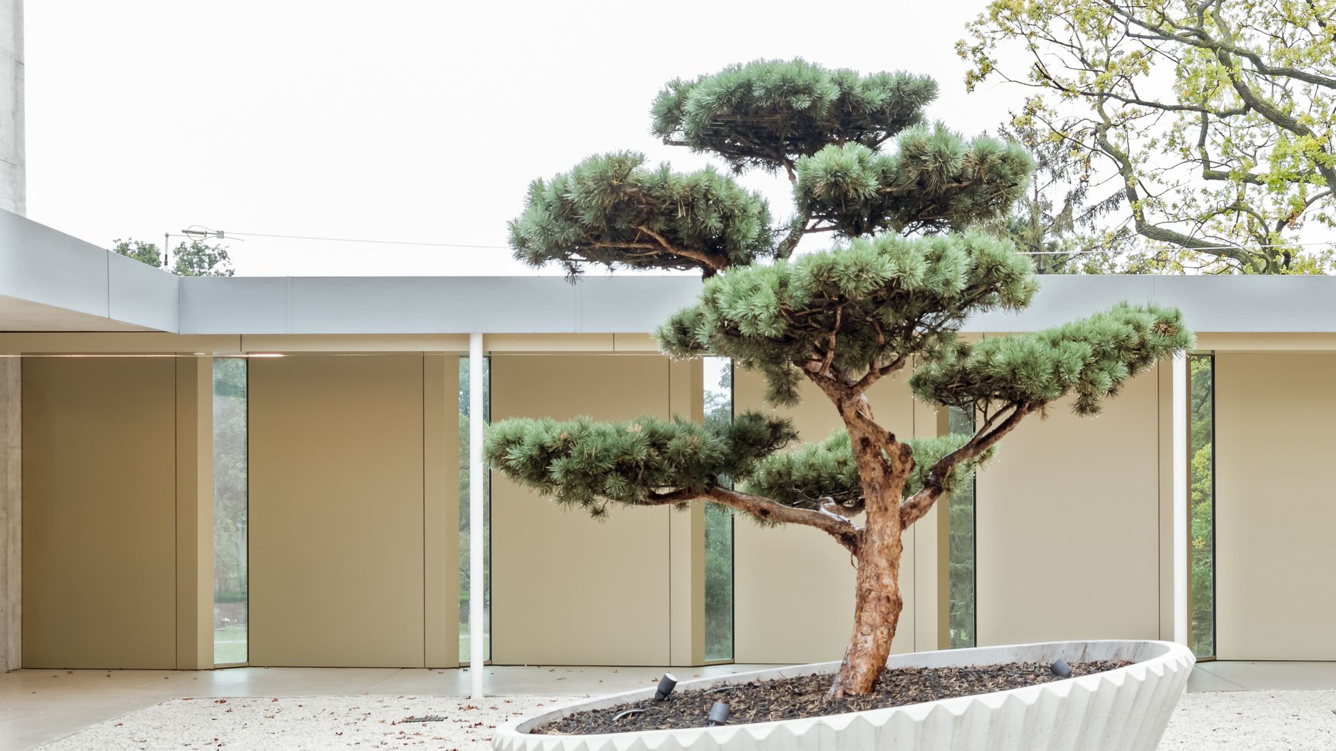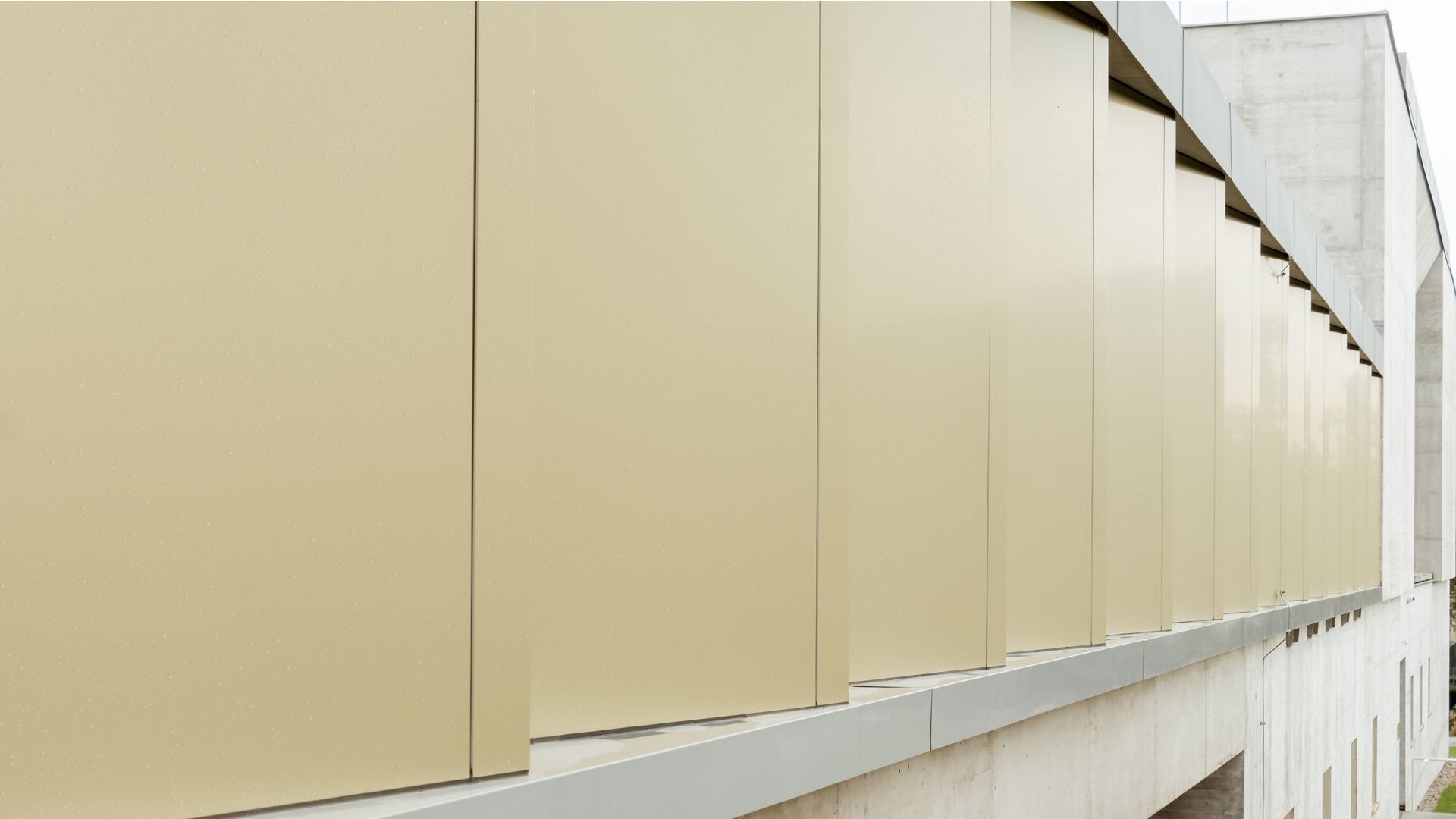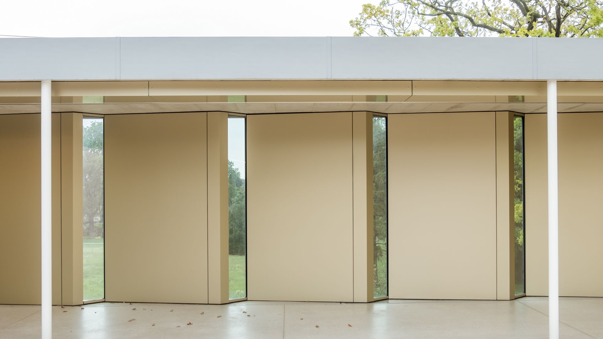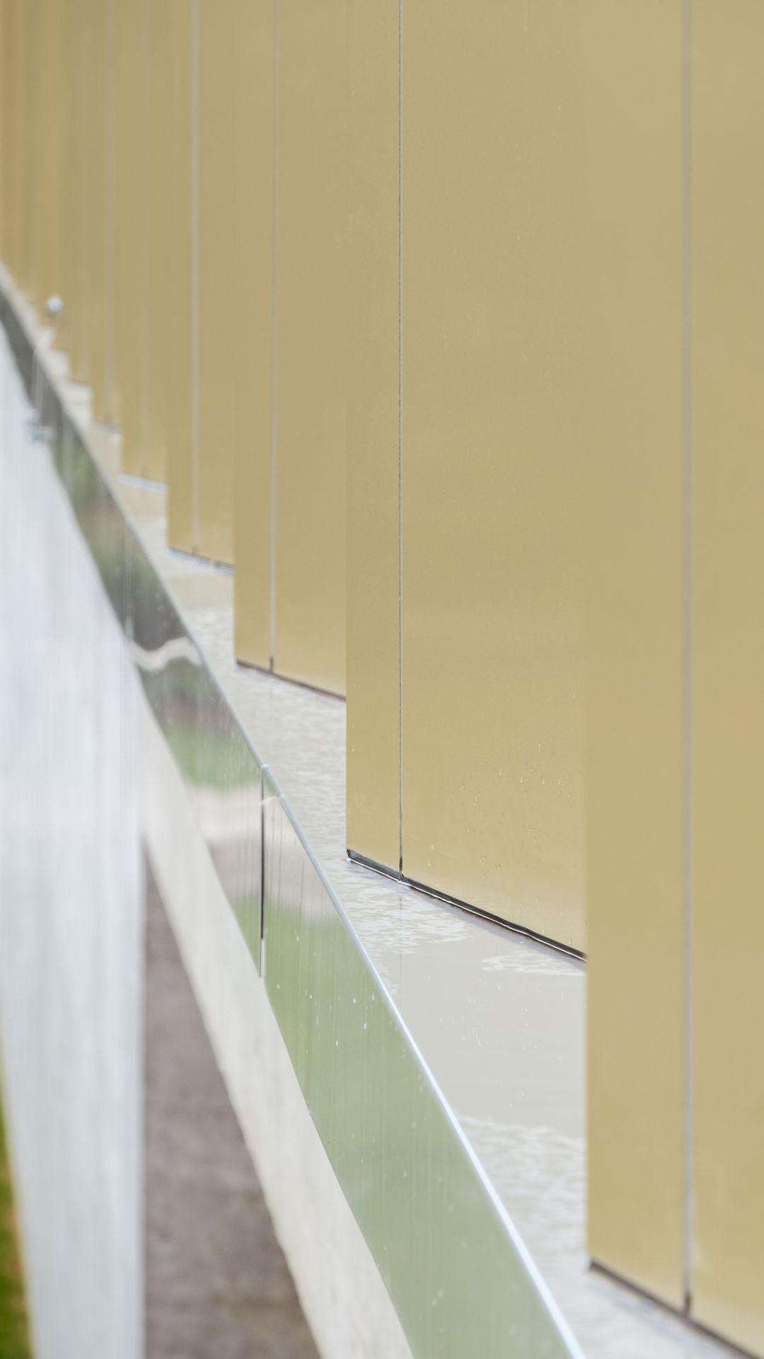 Durch die gefächerte Fassadenform und dem Wechsel von Vollmaterial zu kleinen Glasflächen, gewinnt der Gang im Krematorium an Dynamik und Helligkeit. Die exklusive Farbe verleiht dem Gebäude zusätzlich einen edlen Charakter.