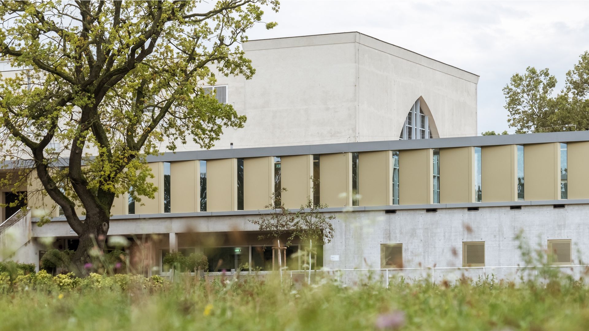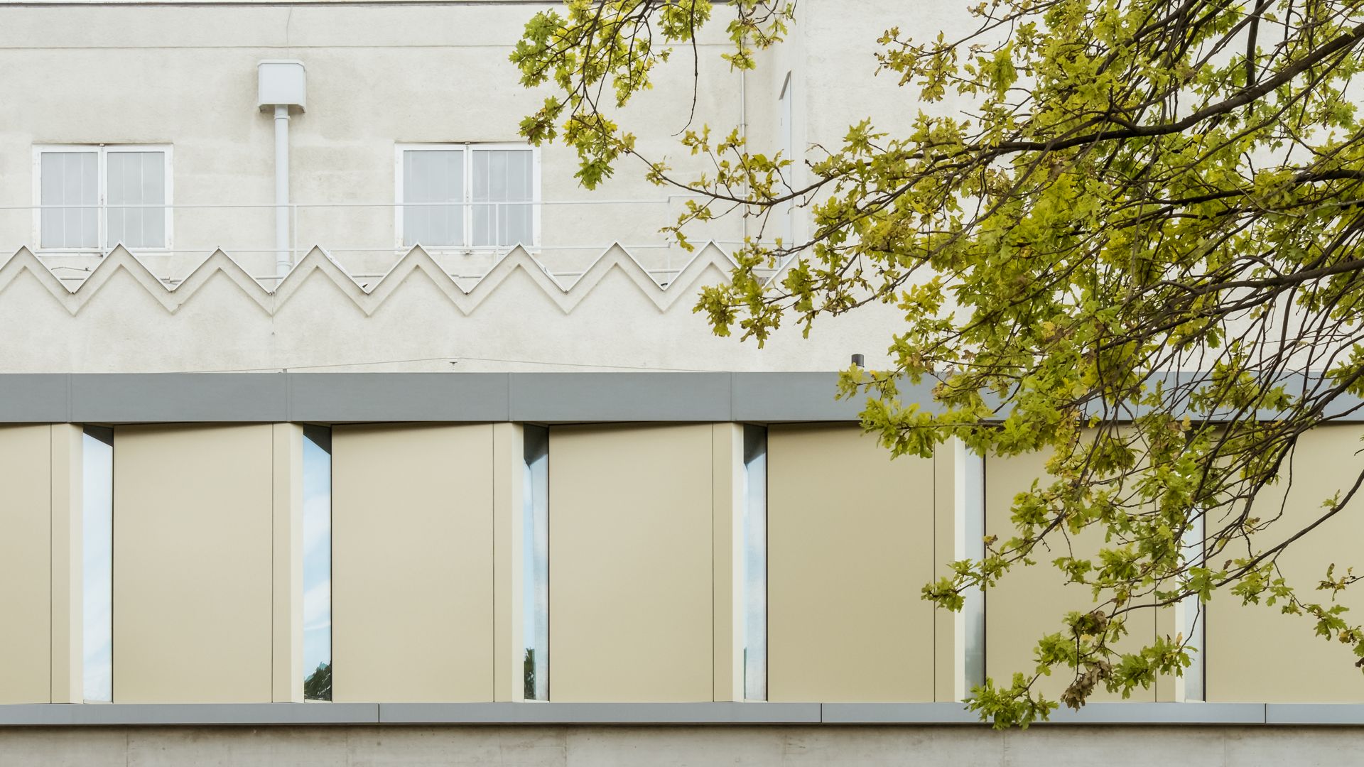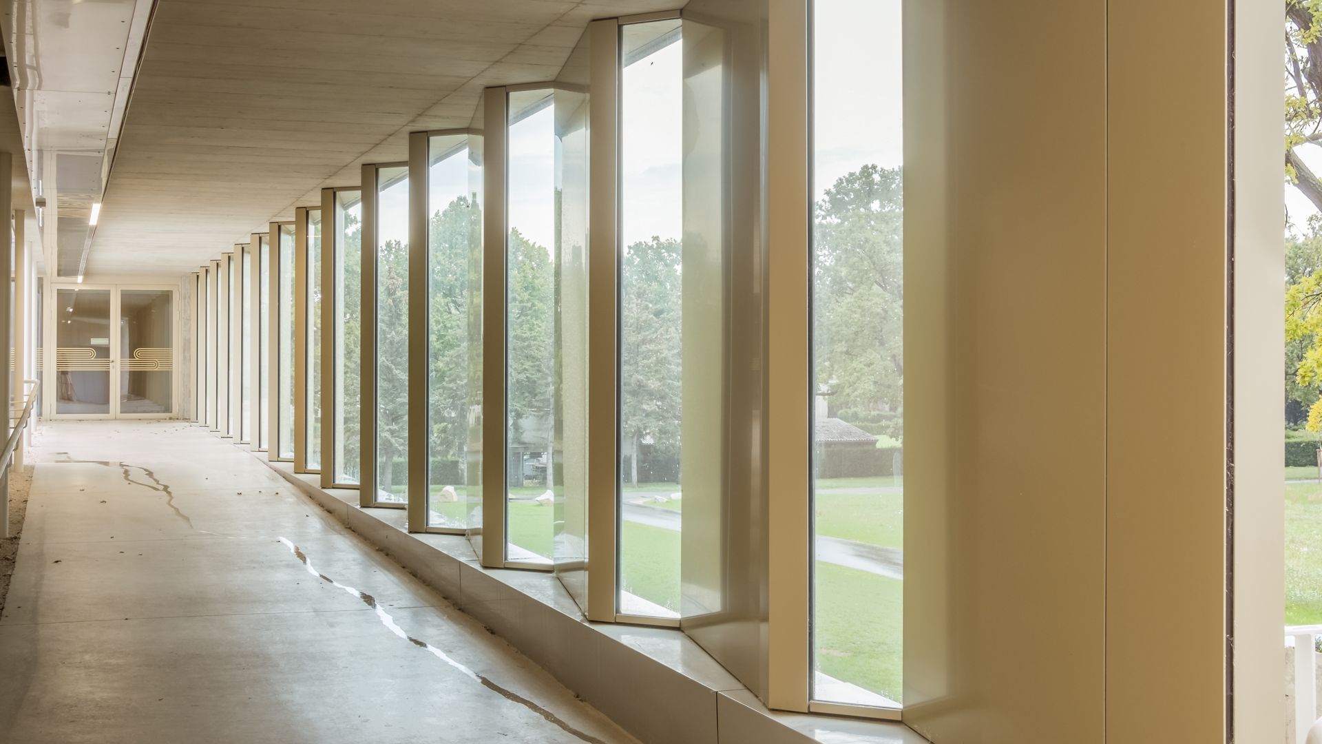 Dank der innovativen Fassadengestaltung mit abwechselnden Elementen aus Vollmaterial und feinen Glasflächen gewinnt der Gang im Krematorium an Dynamik und Helligkeit. Die exklusive Farbgebung verleiht dem Gebäude zudem einen edlen und hochwertigen Charakter.
