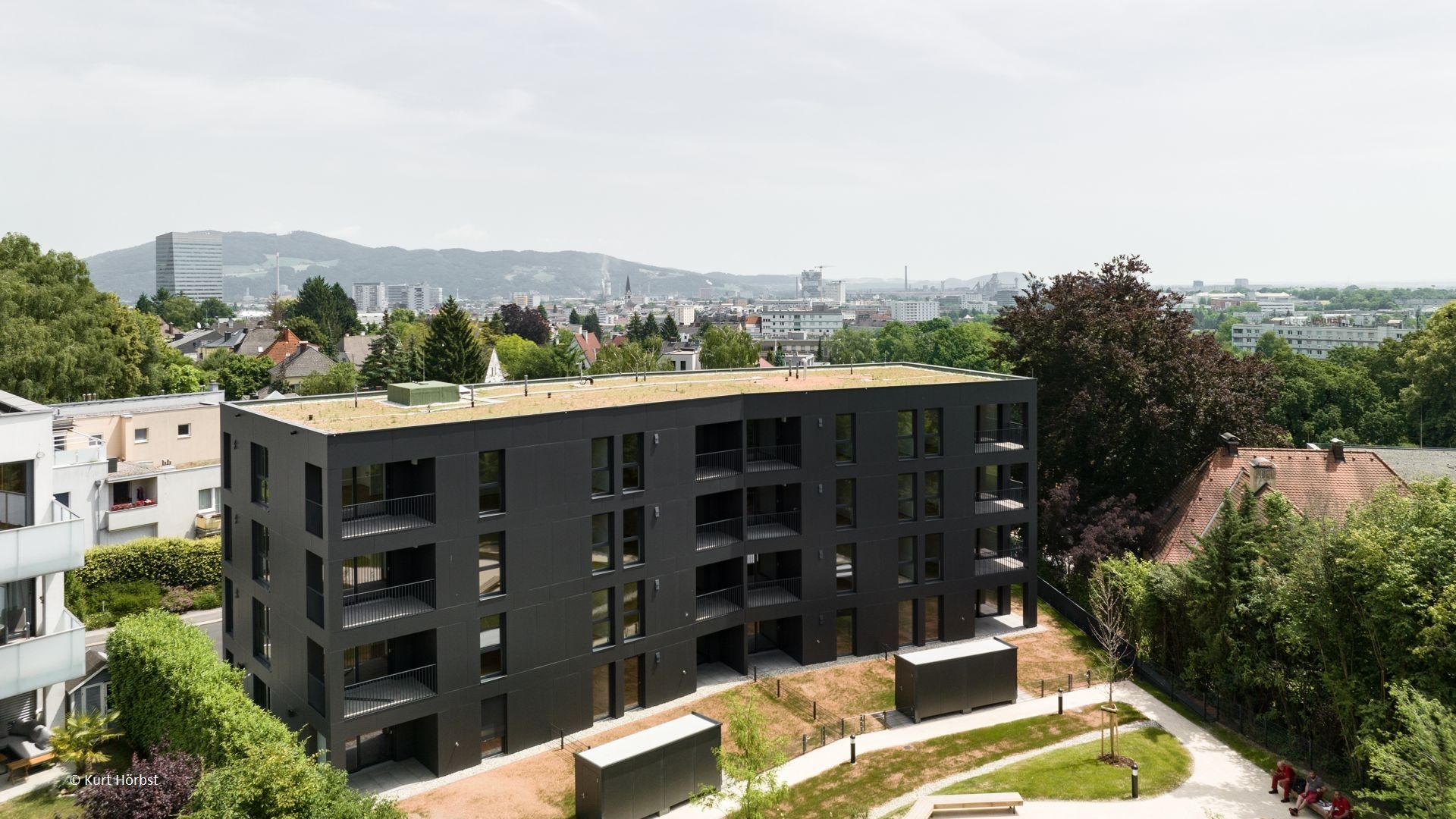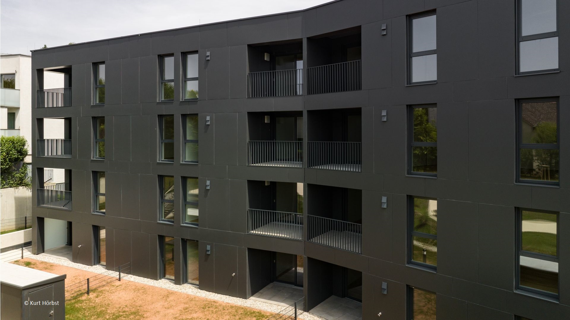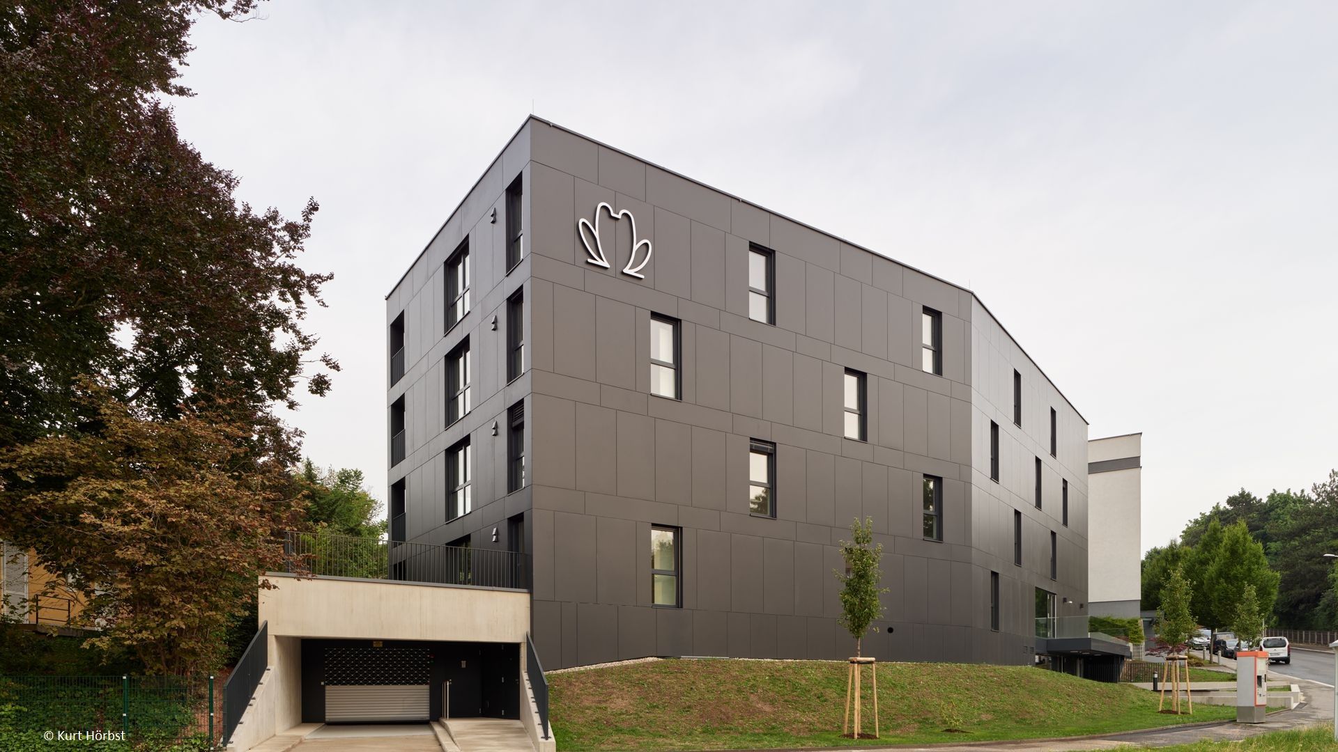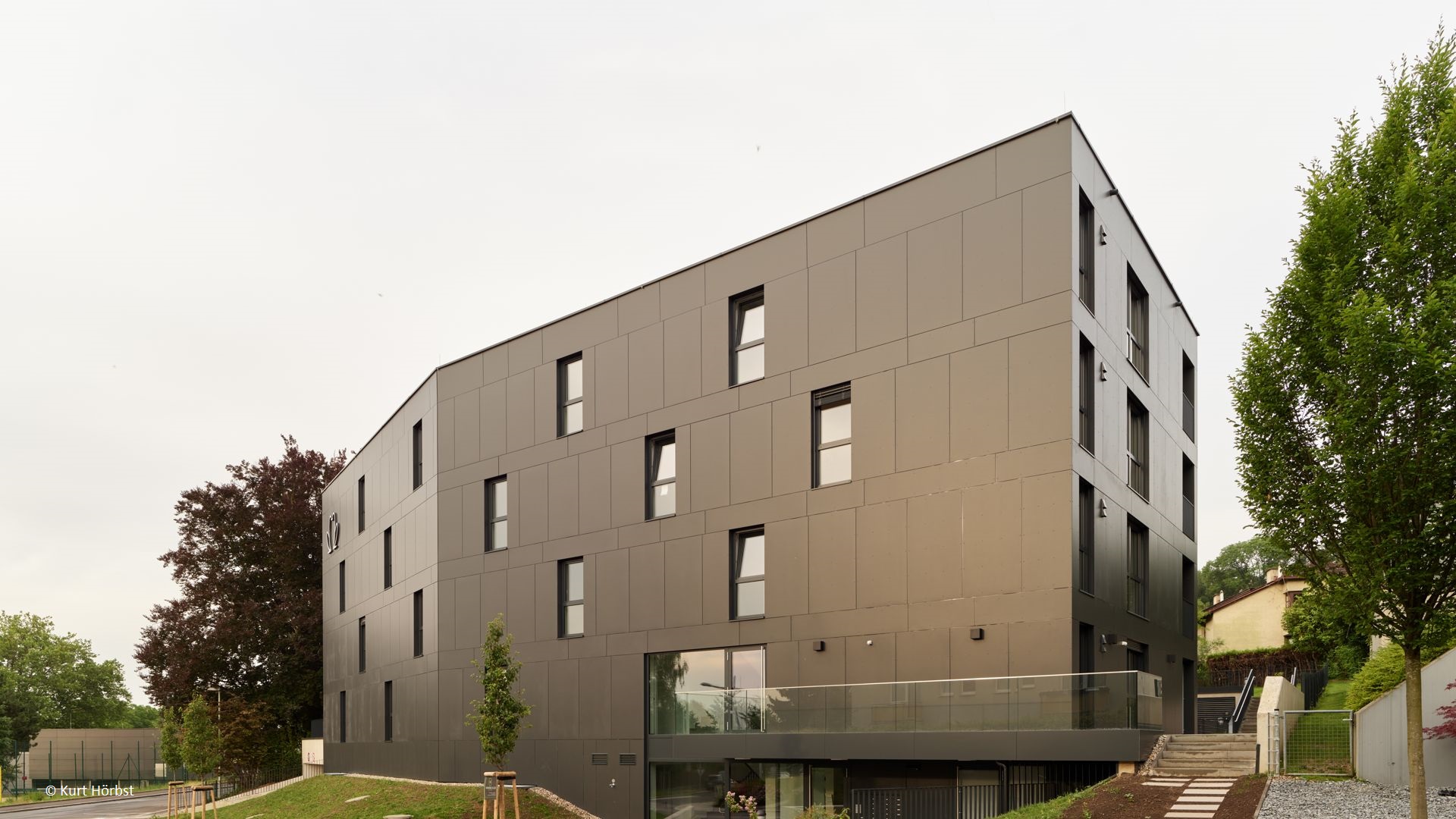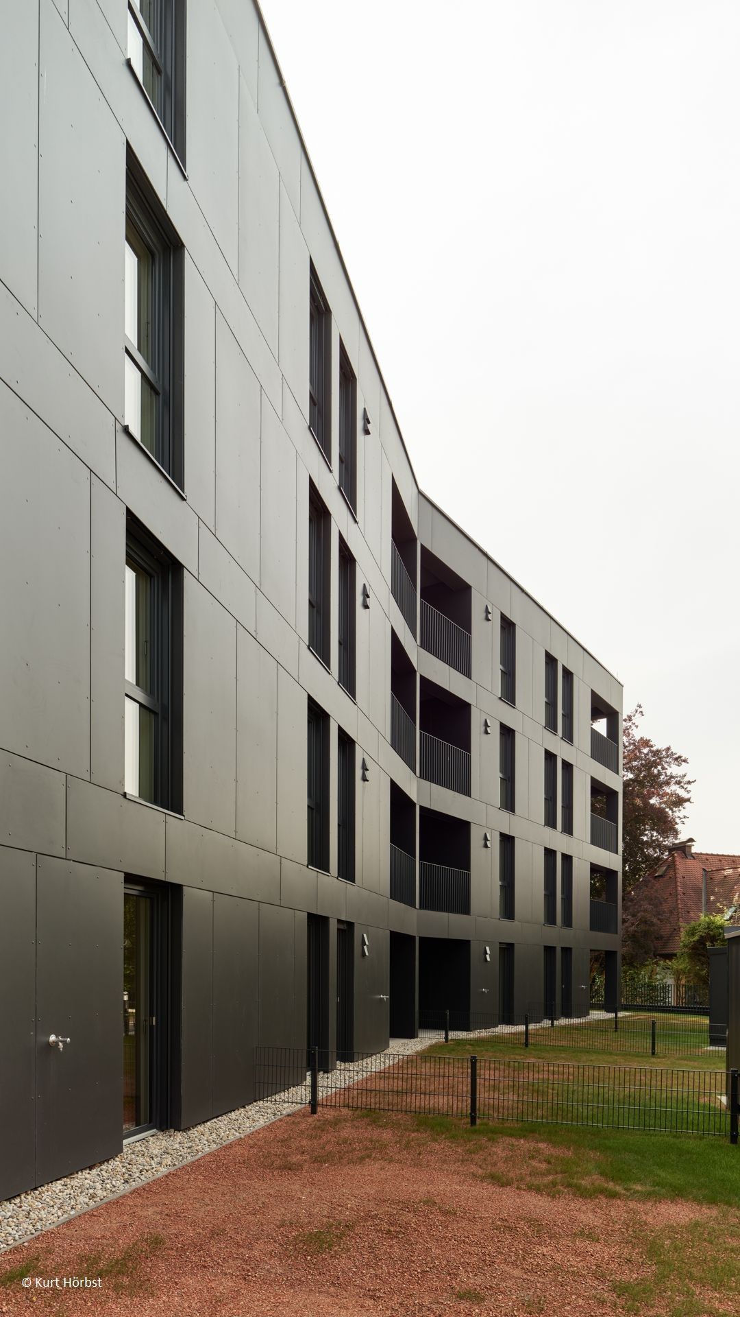 Die außergewöhnliche Grundrissform wird durch elegante, dunkle Eternitplatten betont. Die abwechselnd vertikal und horizontal verlegten Platten verleihen der Fassade eine dynamische und lebendige Optik.