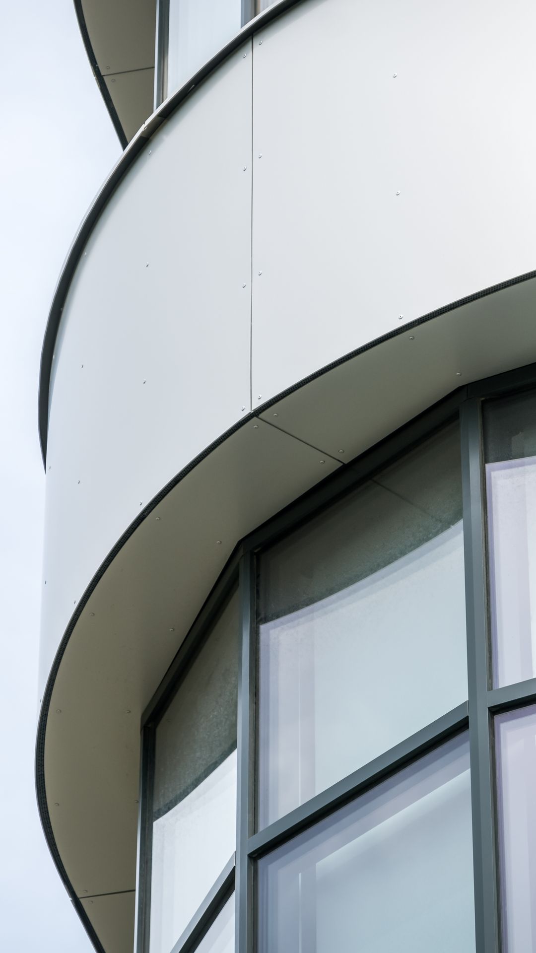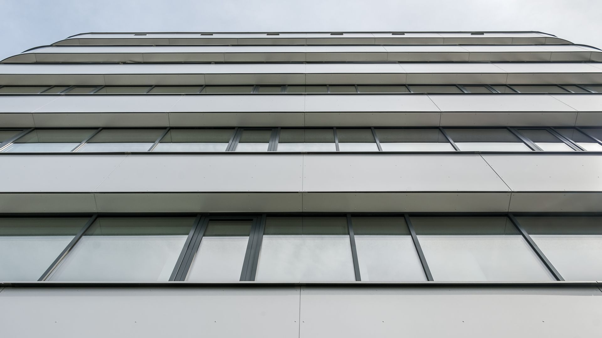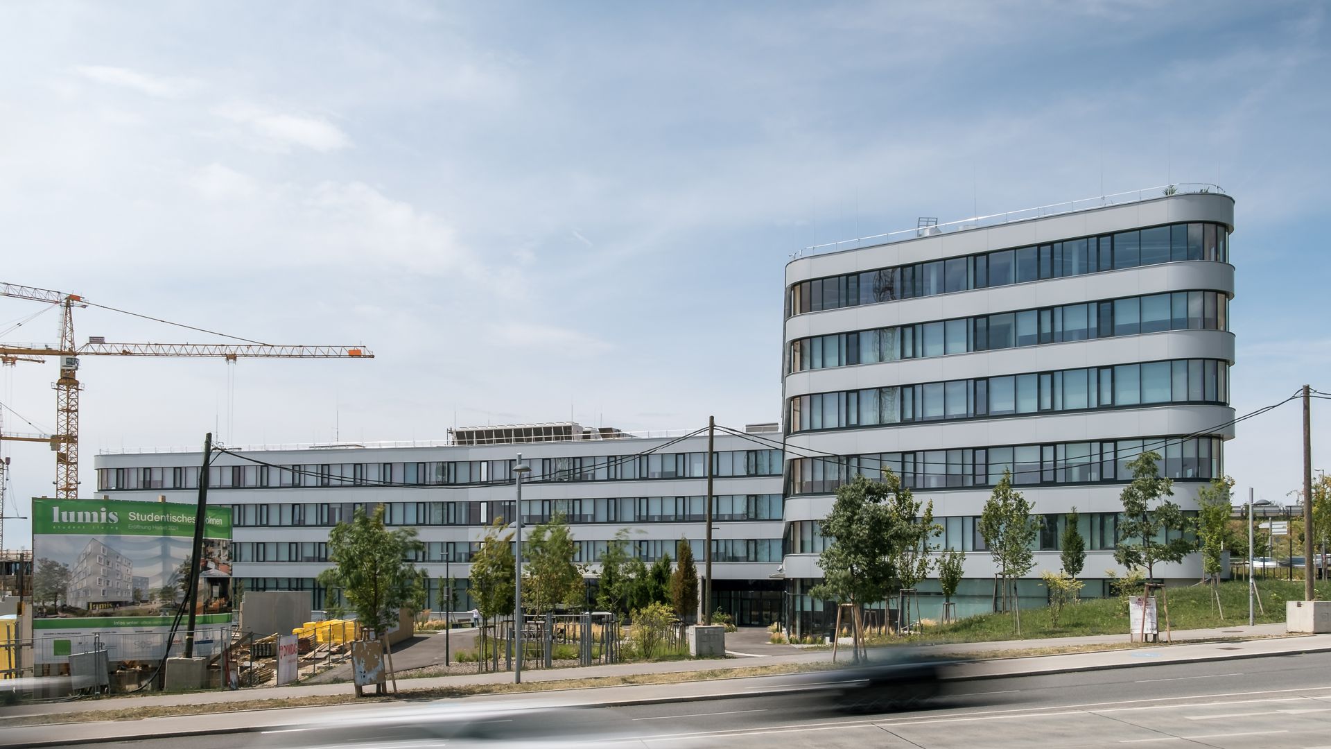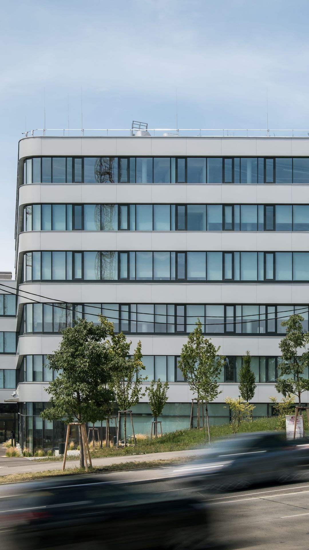 Das Projekt besteht aus 3 Bauteilen, welche in jedem Stock mit einem durchgehenden Alucobondstreifen verbunden sind. Ein echter Hingucker sind die rund ausgeführten Ecken.