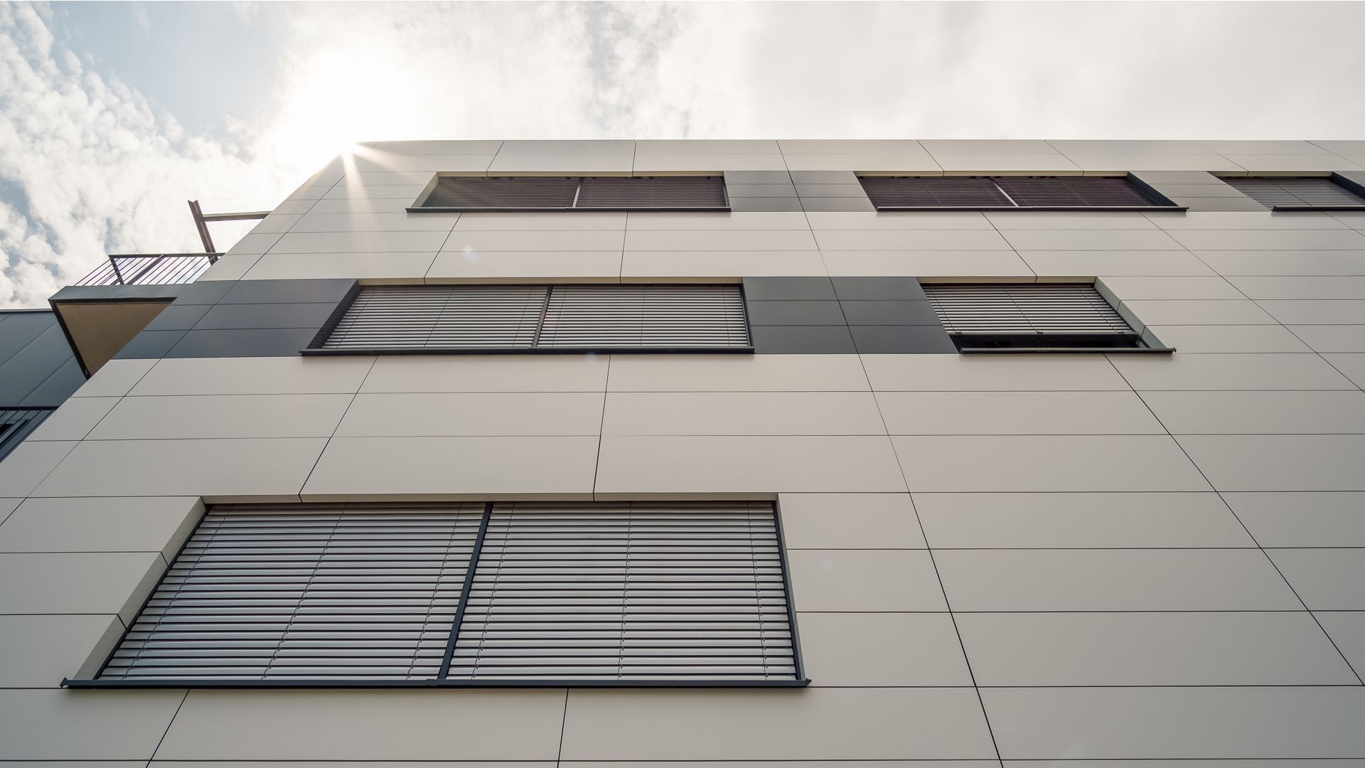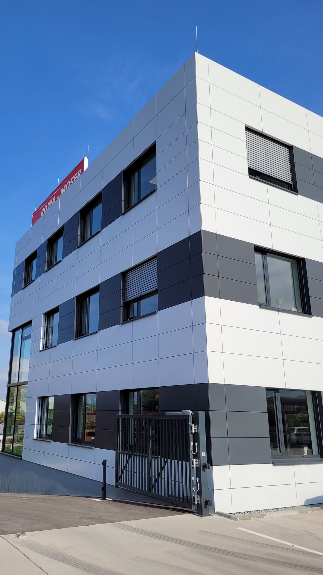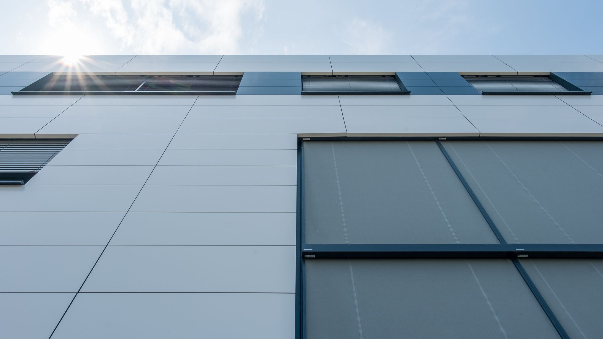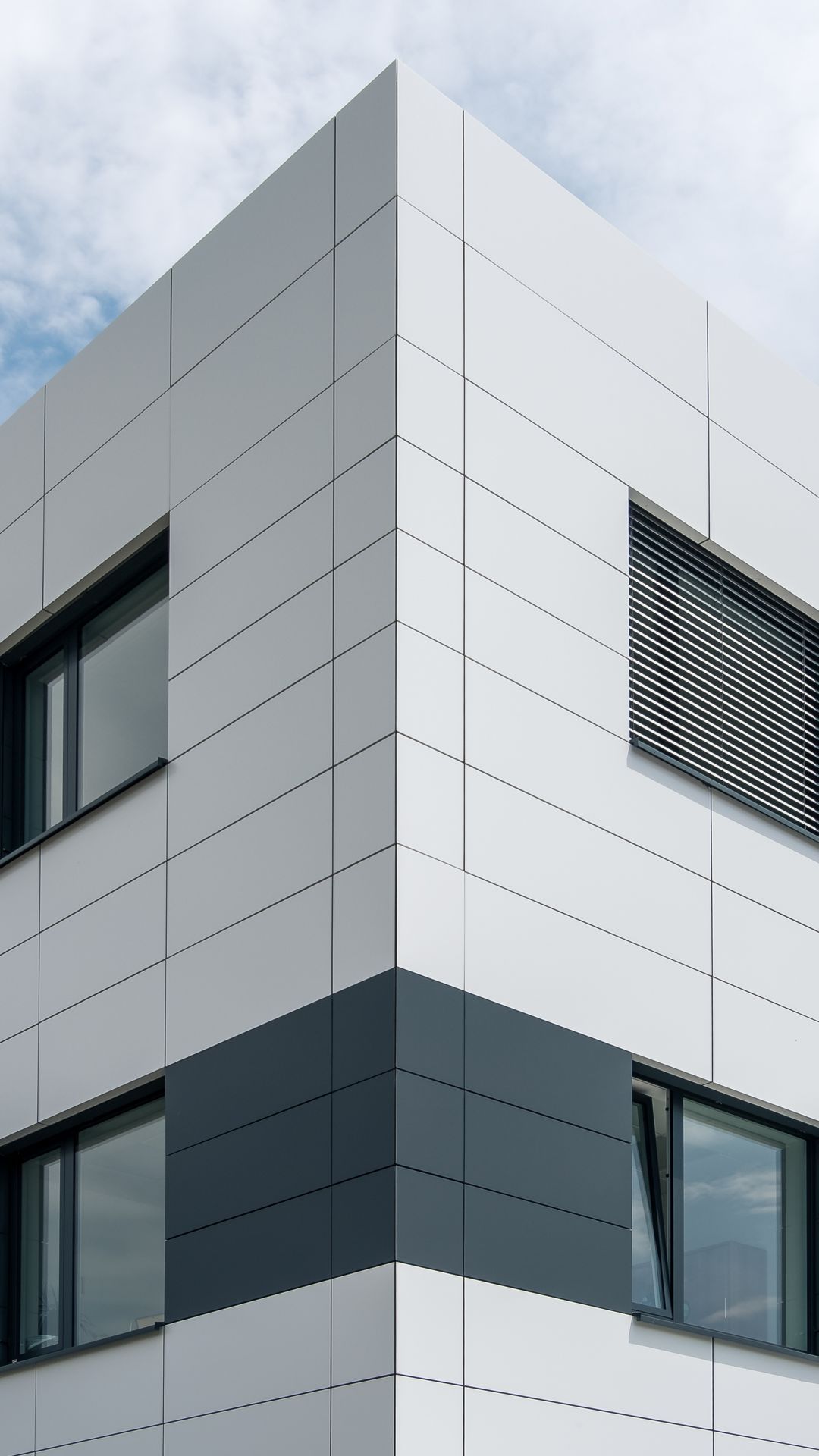 Hier wurde Alucobond in Kassettenform präzise und unsichtbar angebracht. Die geschickte Verwendung von zwei verschiedenen Farben schafft ein beeindruckendes Gesamtbild.
