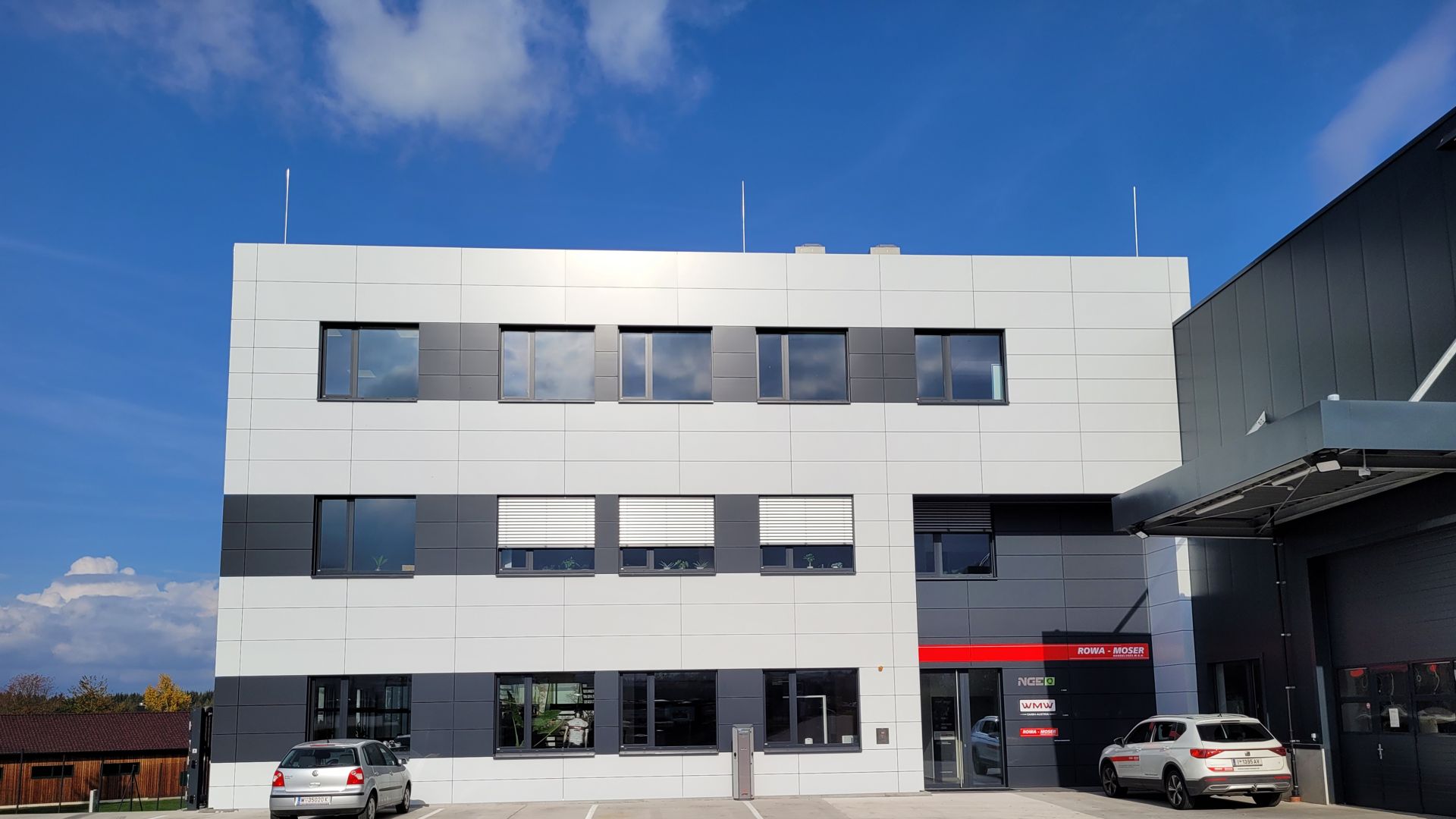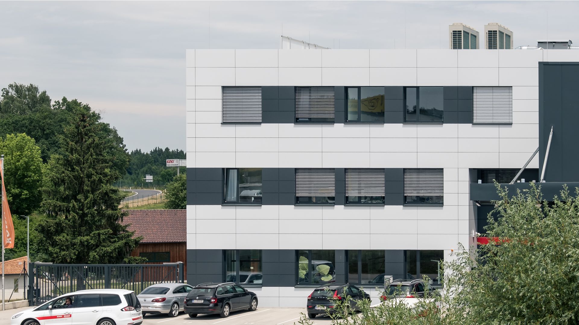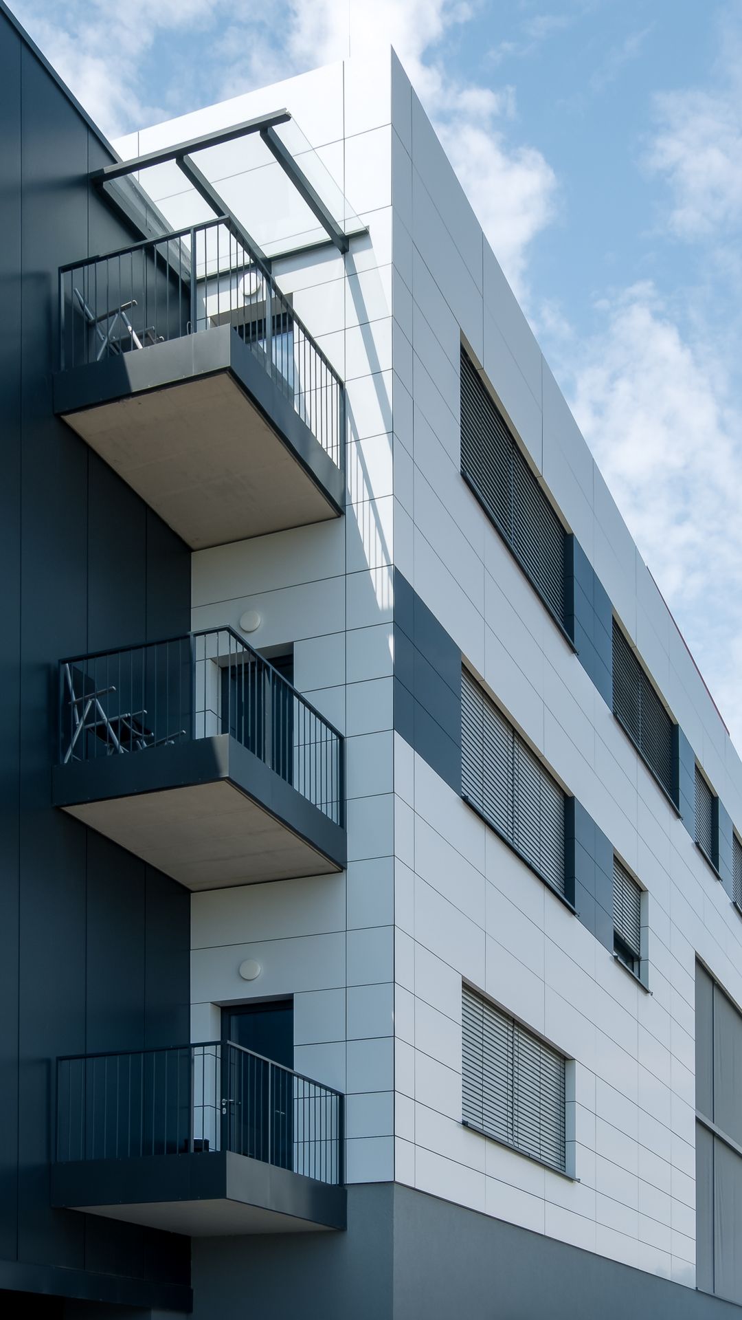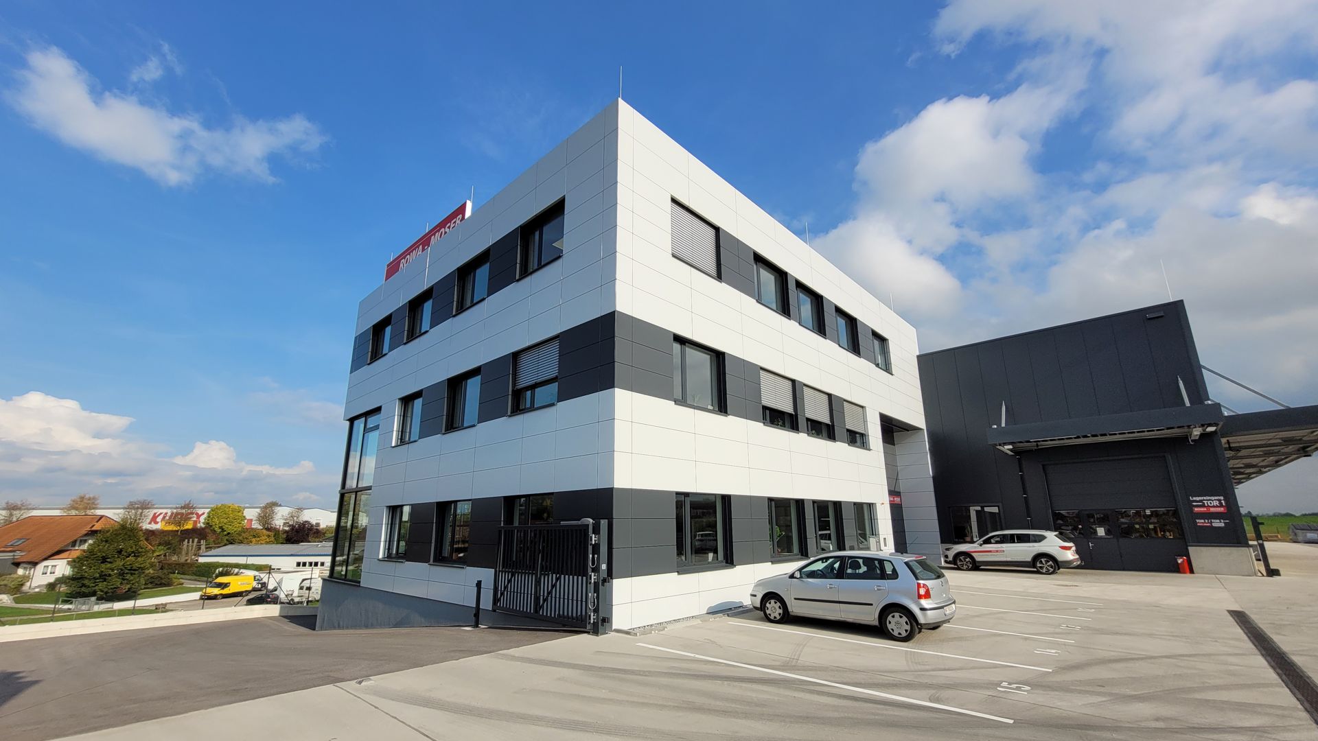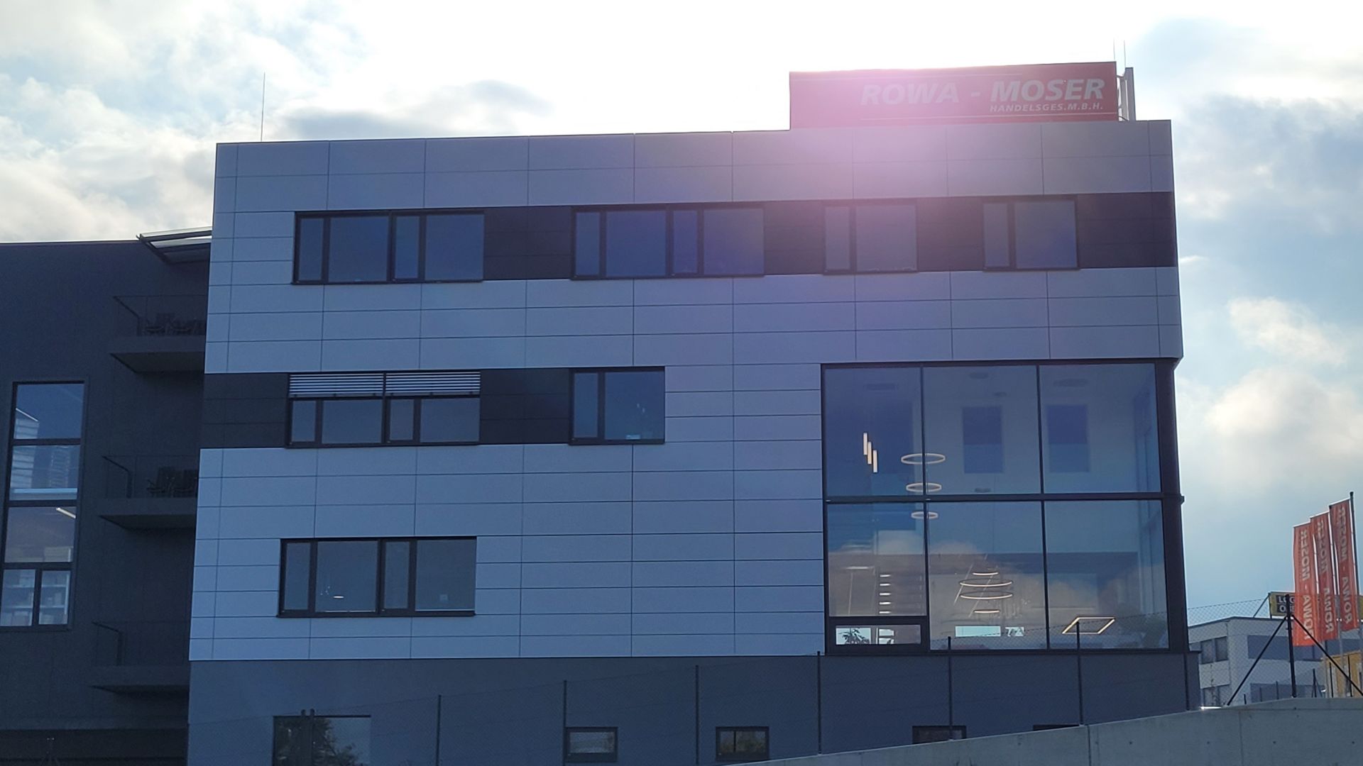 Hier wurde Alucobond in Kassettenform präzise und unsichtbar angebracht. Die geschickte Verwendung von zwei verschiedenen Farben schafft ein beeindruckendes Gesamtbild.