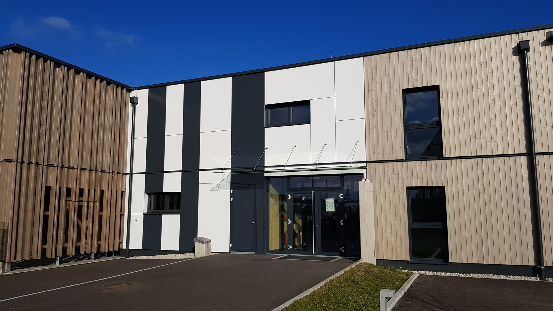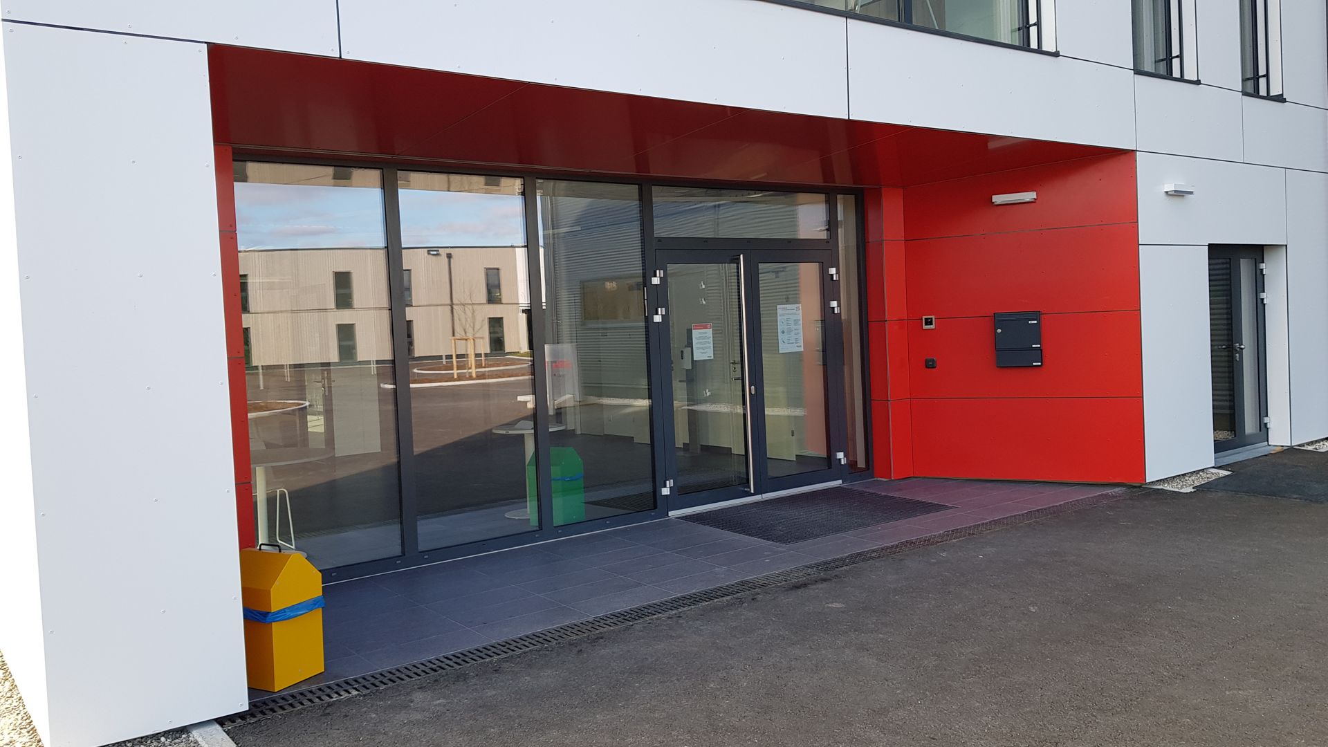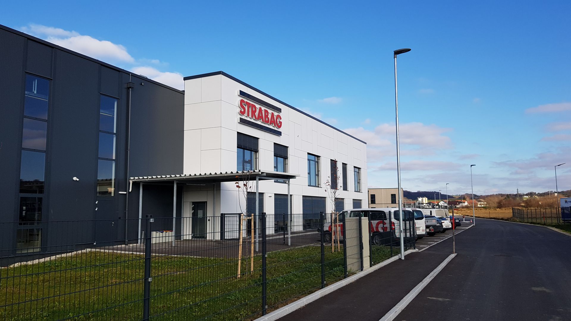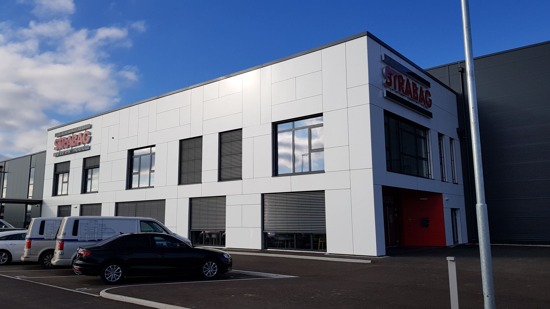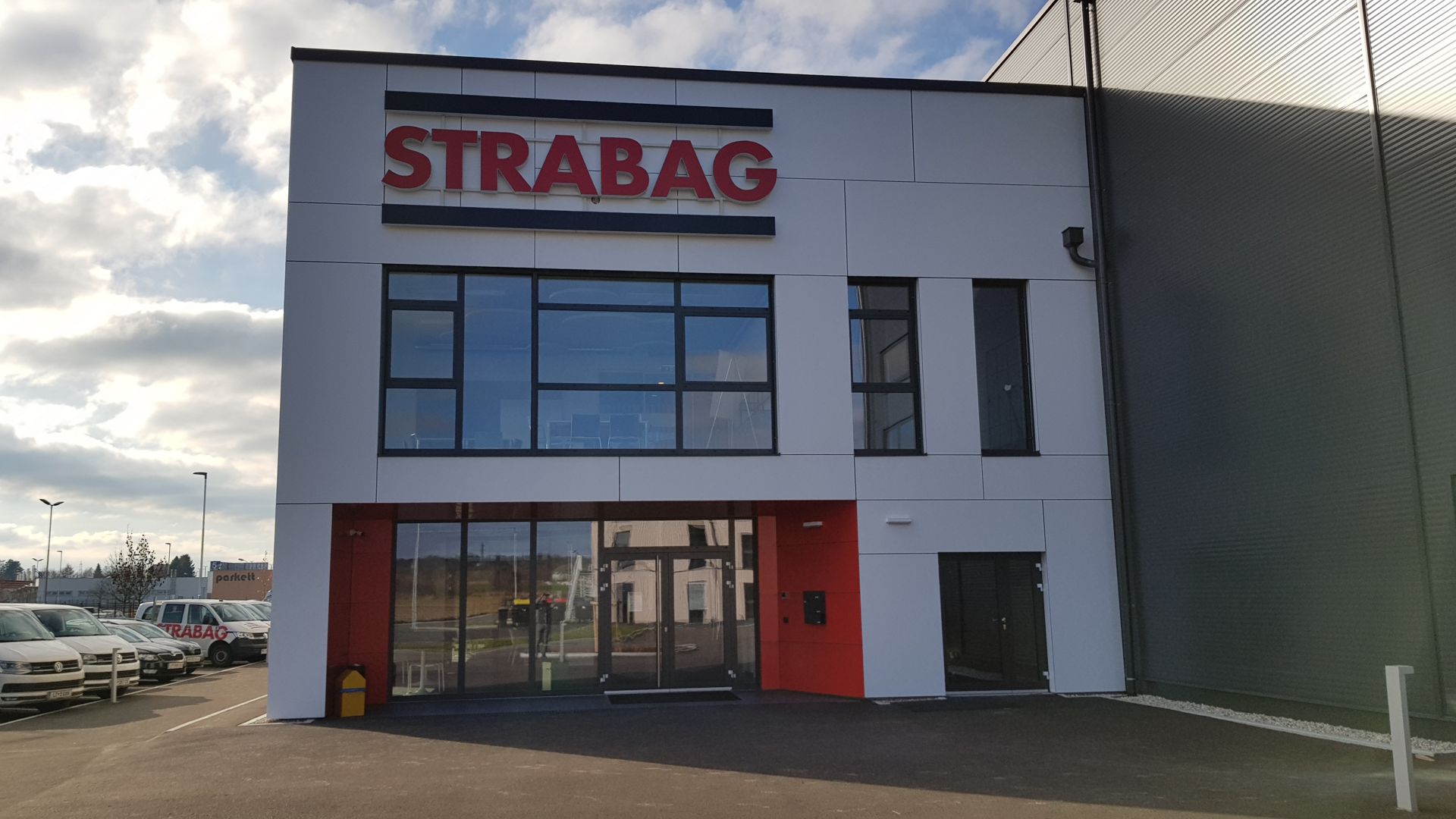 Das Verwaltungsgebäude in Ybbs wurde gestalterisch den Unternehmensfarben der STRABAG AG angepasst, wobei der Eingangsbereich als besonderer Blickfang hervorsticht. Die Fugenteilung der Fassade wurde bewusst asymmetrisch angelegt, um einen dynamischen und modernen Eindruck zu vermitteln.