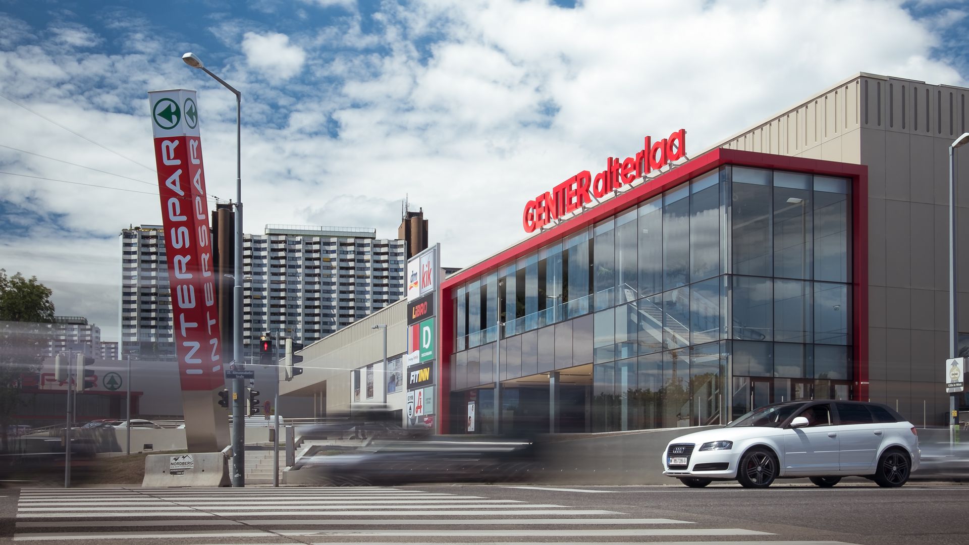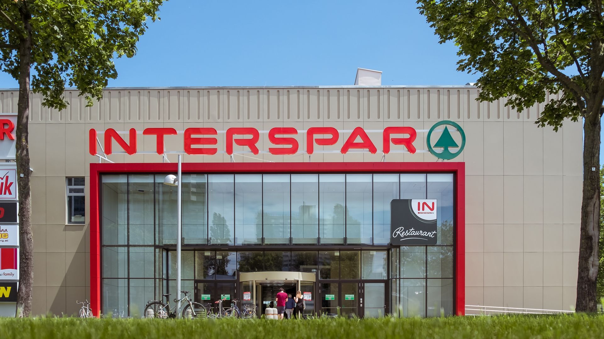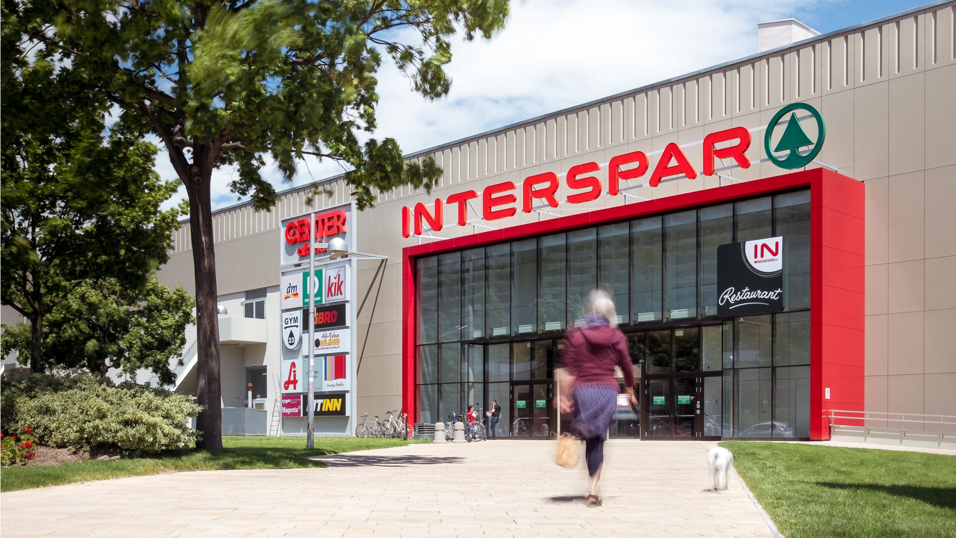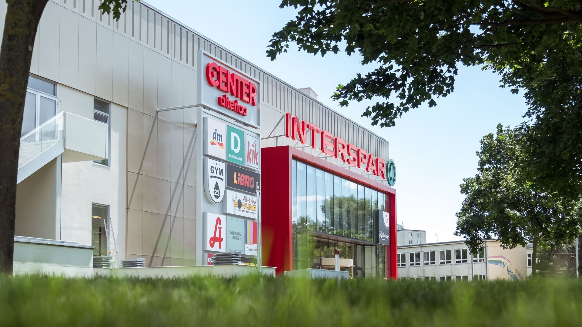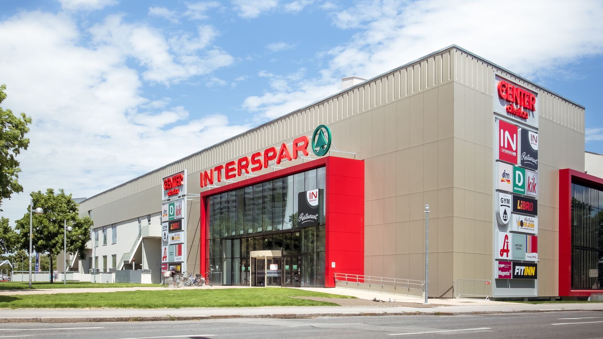 Die Hauptfläche wurde in der Farbe Hellgrau Perlglimmer bekleidet, die obere Plattenreihe bekam als optischen Anreiz mehrere tiefe Prägungen und lockert somit den Gesamteindruck des Gebäudes auf. Der Eingangsbereich wurde im neuen Interspar-rot, Rubinrot, eingefasst.