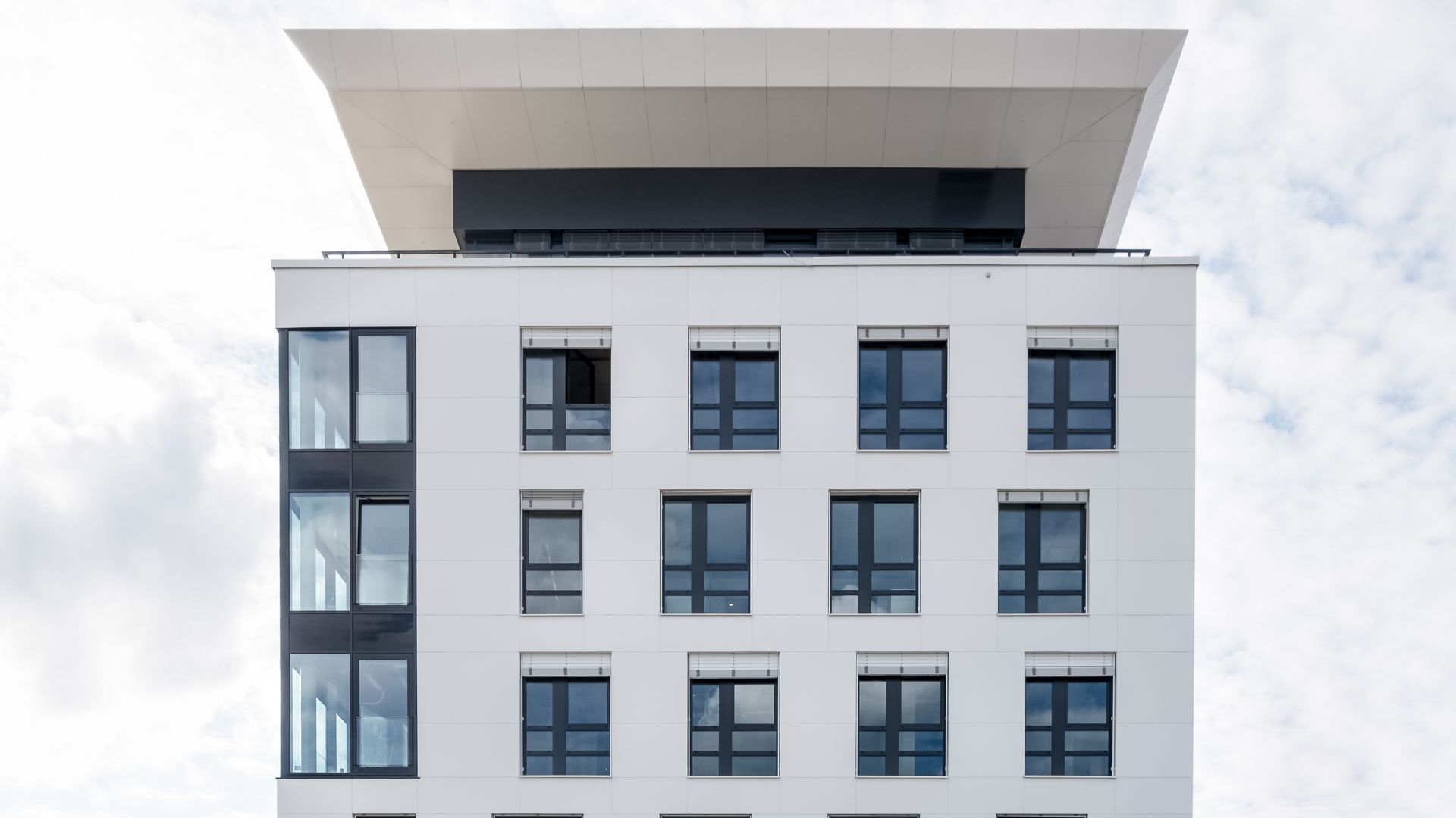 Um die moderne Optik des Gebäudes zu betonen, wurde eine komplette Fassadenseite als stilvolle Schrägfassade gestaltet. Eine geschwungene, elegante Überdachung verleiht dem Gebäude den finalen, perfekten Akzent.
