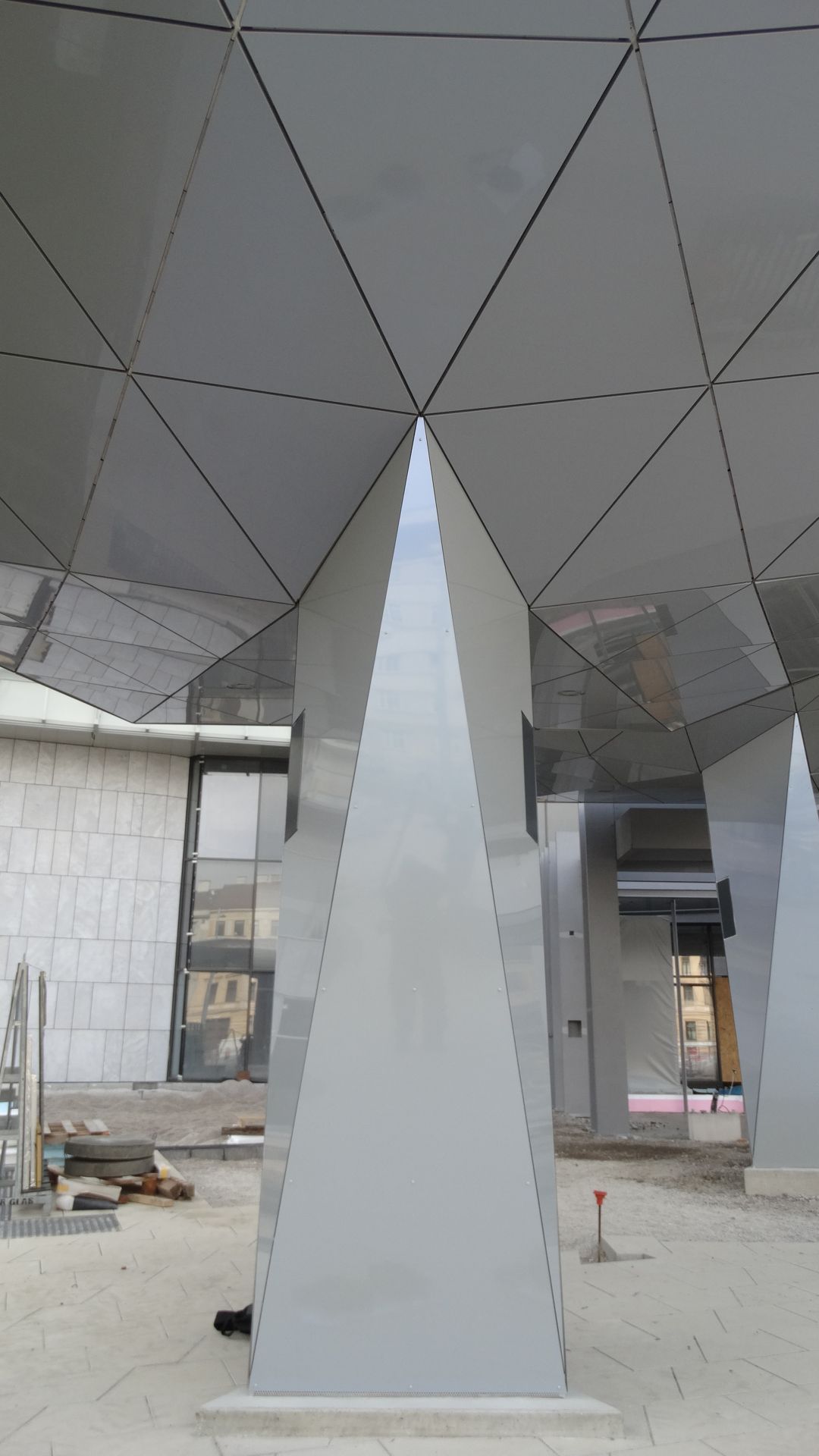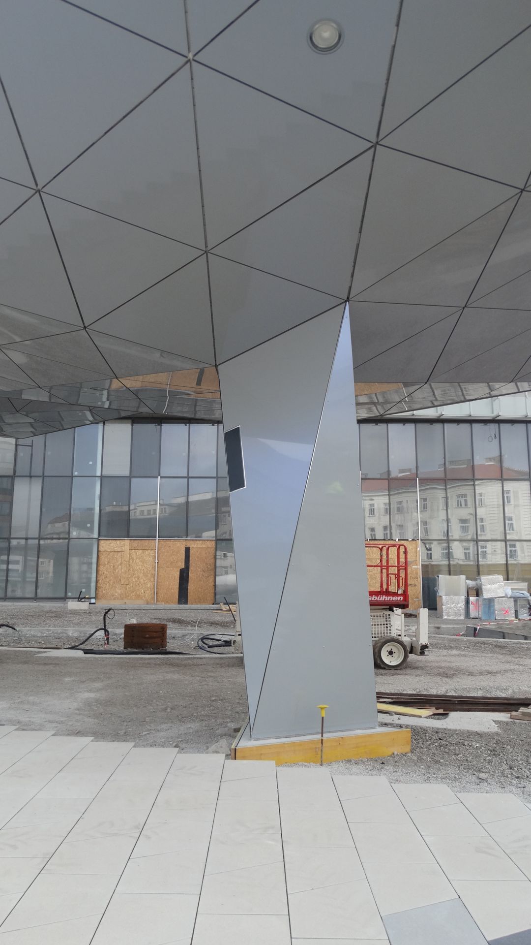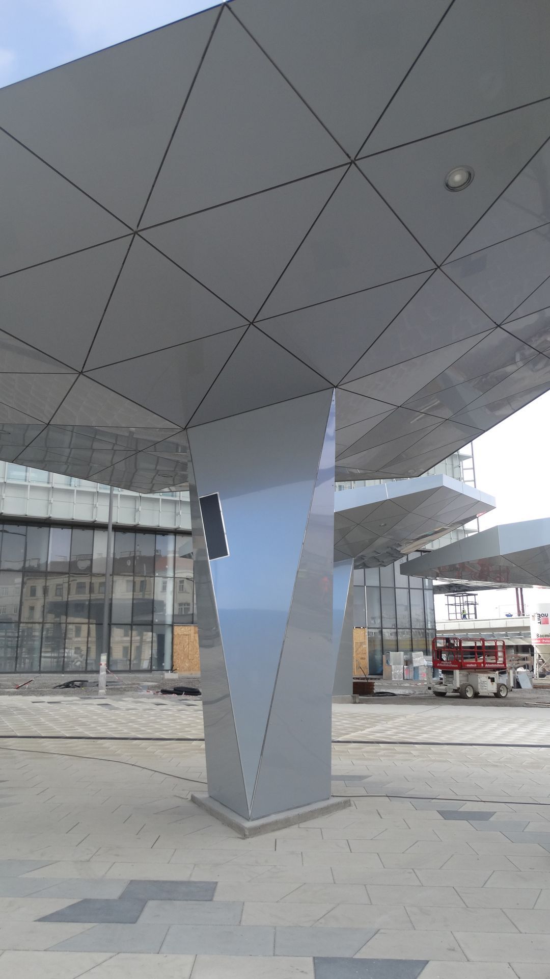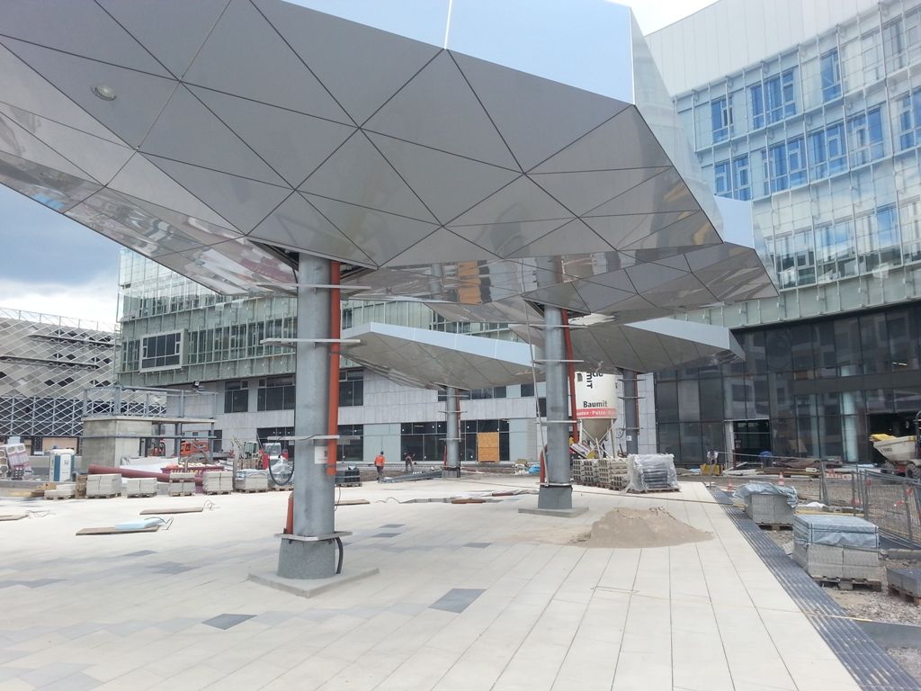 Im Eingangsbereich des Kranken- hauses Nord in Wien entstehen 6 Stück von den sogenannten „Schirmen“. Die Schirme werden in 3D geplant und mit Aluverbundkassetten in einer Spectrafarbe (d.h. die Aluverbundplatte verändert die Farbe je nach Lichteinfall und Blickwinkel) verkleidet.