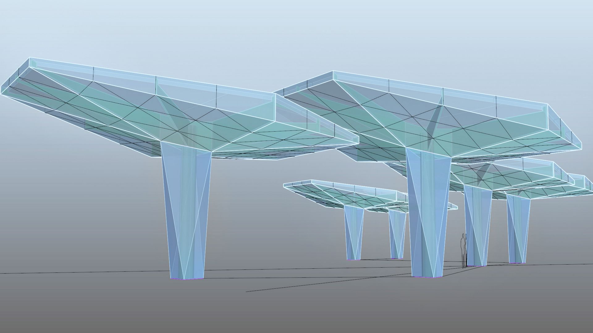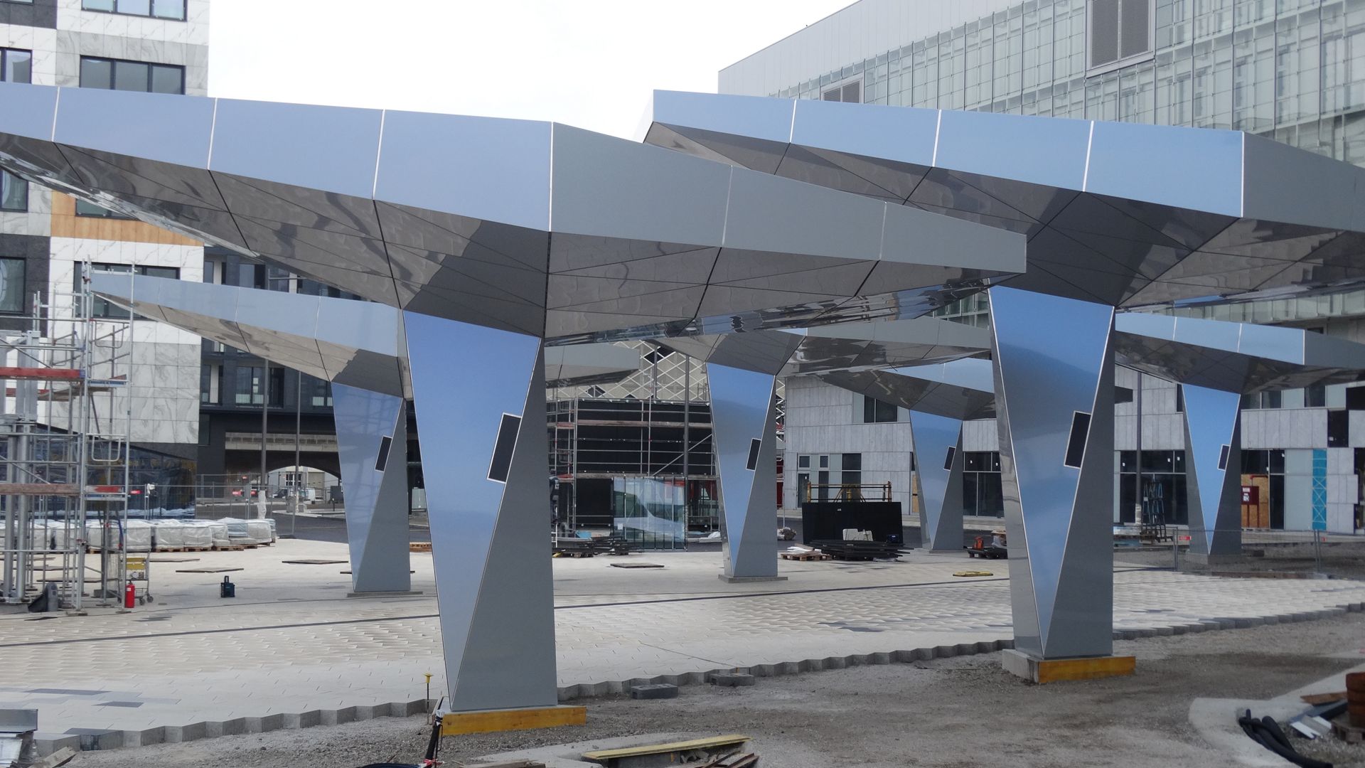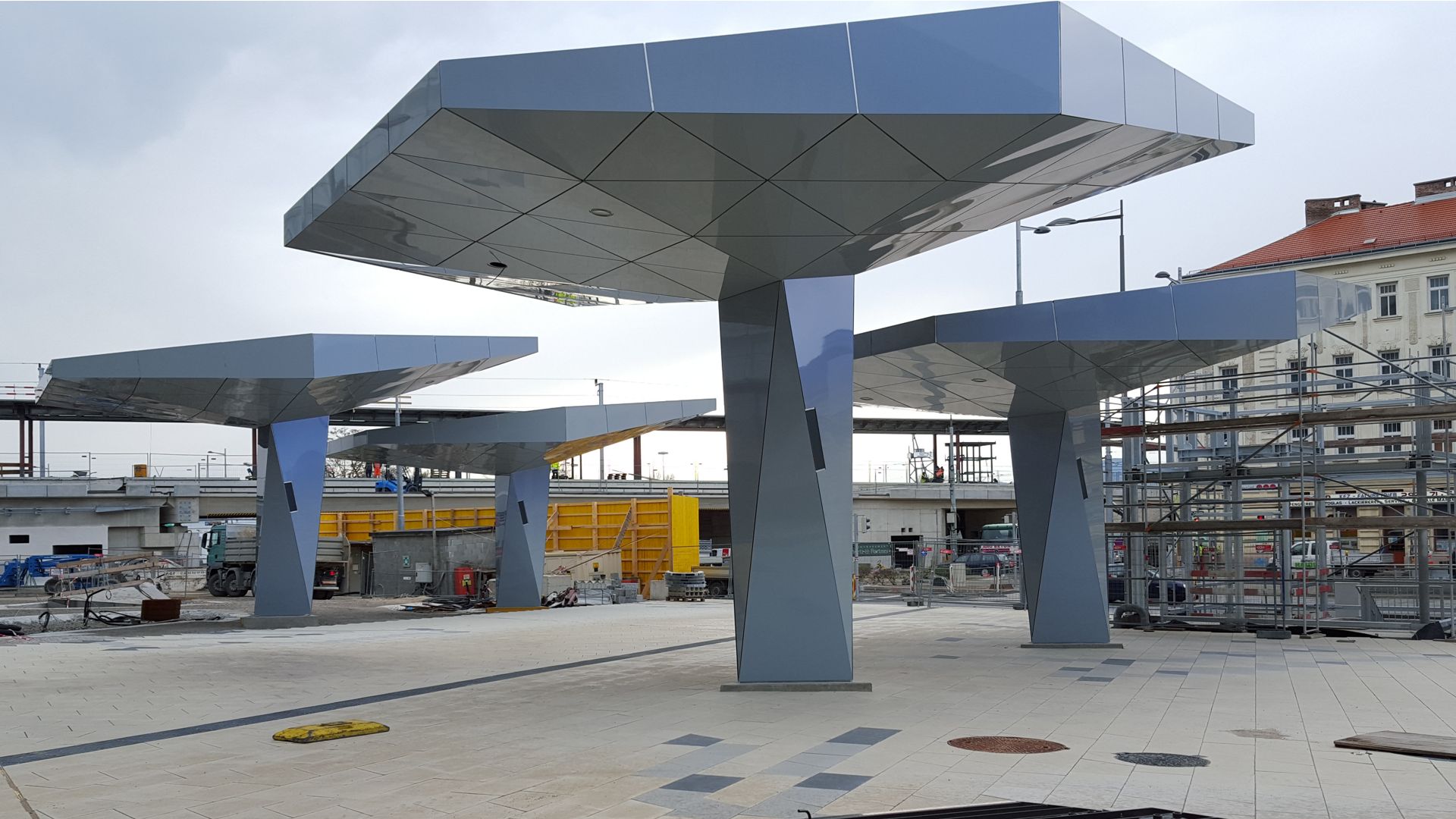 Im Eingangsbereich des Kranken- hauses Nord in Wien entstehen 6 Stück von den sogenannten „Schirmen“. Die Schirme werden in 3D geplant und mit Aluverbundkassetten in einer Spectrafarbe (d.h. die Aluverbundplatte verändert die Farbe je nach Lichteinfall und Blickwinkel) verkleidet.