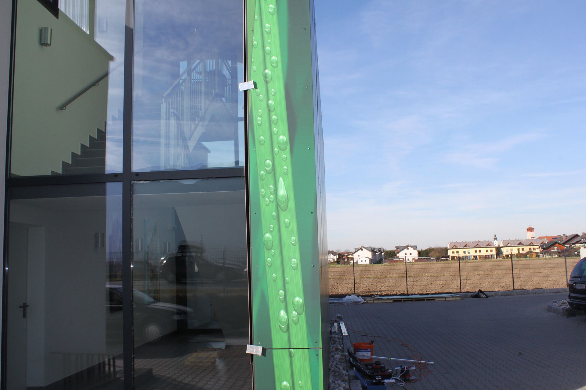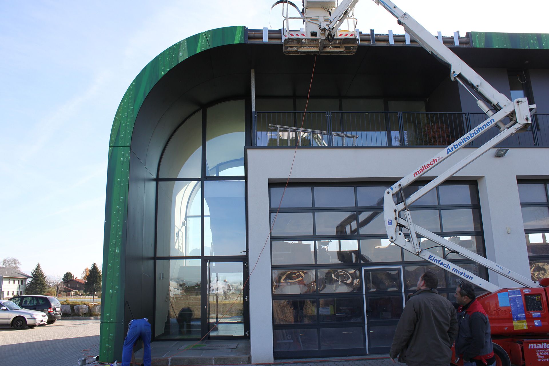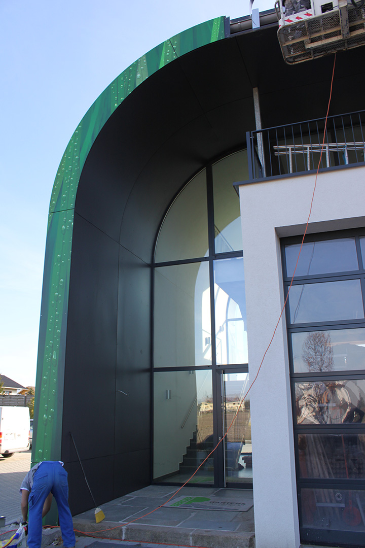Die Fundermaxplatten wurden auf eine vorgerollte Aluminium- Unterkonstruktion genietet. Das Dekor läuft über die gesamte Ansicht und Rundung des Gebäudes. Die Attika wurde auf speziell vorgefertigte Alubügel genietet und das „Gras-Muster“ läuft über die gesamte Attikafläche.
