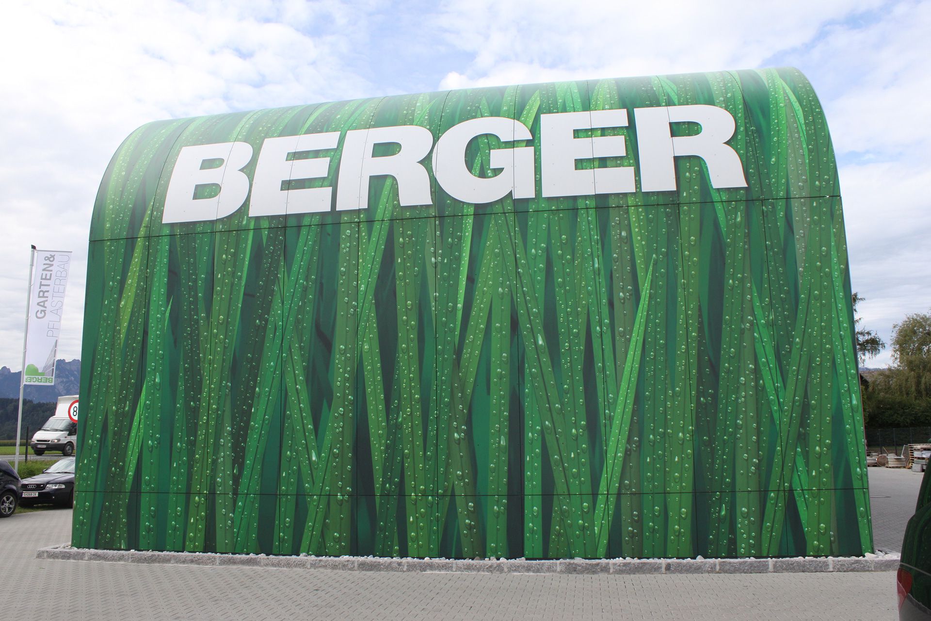 Beim Bauvorhaben Gärtnerei Berger wurden individuell bedruckte HPL-Platten, sichtbar genietet.