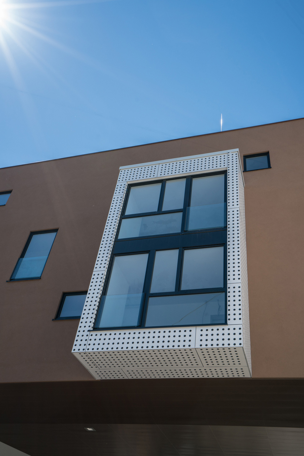 Die Hauptfassade besteht aus braunem VWS-Putz. Als Kontrast dazu werden die von der Fassade hervor- springenden Erker mit gelochten Aluminium-Platten eingekleidet. Die Farbbeschichtung dieser Alu-Platten wechselt zwischen einem Braunton, ähnlich der Putzfarbe, und einem Weiß. Die Lochung verläuft regel- mäßig über die Erker-Außenfläche. Ebenso wie die Ansichtsflächen werden auch die Untersichten der jeweiligen Erker mit gelochten Paneelen verkleidet.