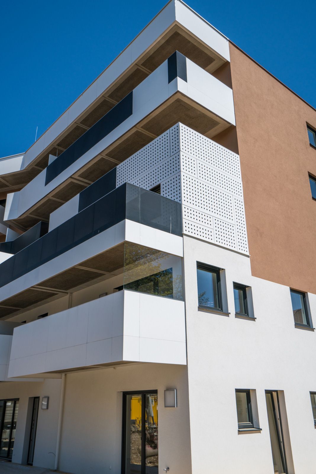 Die Hauptfassade besticht durch eleganten braunen VWS-Putz. Im spannenden Kontrast dazu sind die hervorspringenden Erker mit stilvollen, gelochten Aluminium-Platten verkleidet. Diese Platten wechseln kunstvoll zwischen einem harmonischen Braunton, der dem Putz ähnelt, und einem strahlenden Weiß. Die gleichmäßige Lochung erstreckt sich über die gesamte Außenfläche der Erker und setzt sich nahtlos in den Untersichten fort, wodurch ein modernes und dynamisches Erscheinungsbild entsteht.
