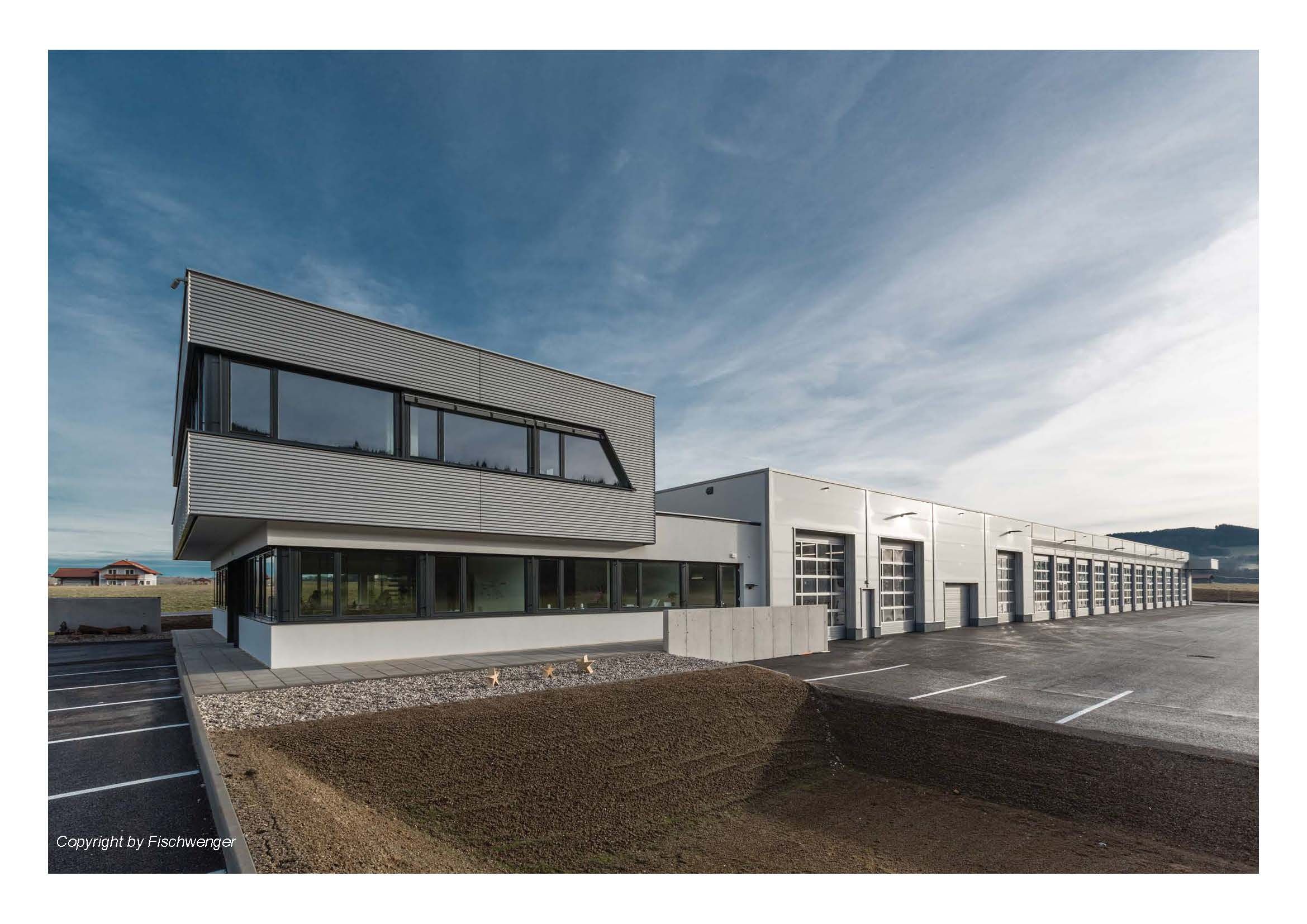 Die Inspiration für den Bau des Firmensitzes des Busunternehmens Fischwenger stammt vom ikonischen „Fishbowl“-Bus. In Anlehnung an dessen charakteristische Optik wurde die markante Wellblechfassade schräg über die Fensterflächen gestaltet.