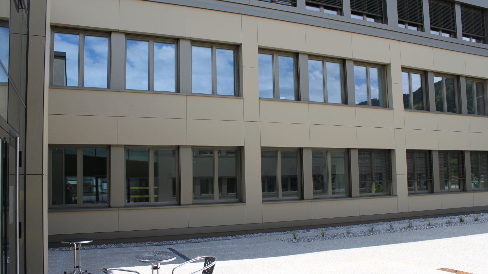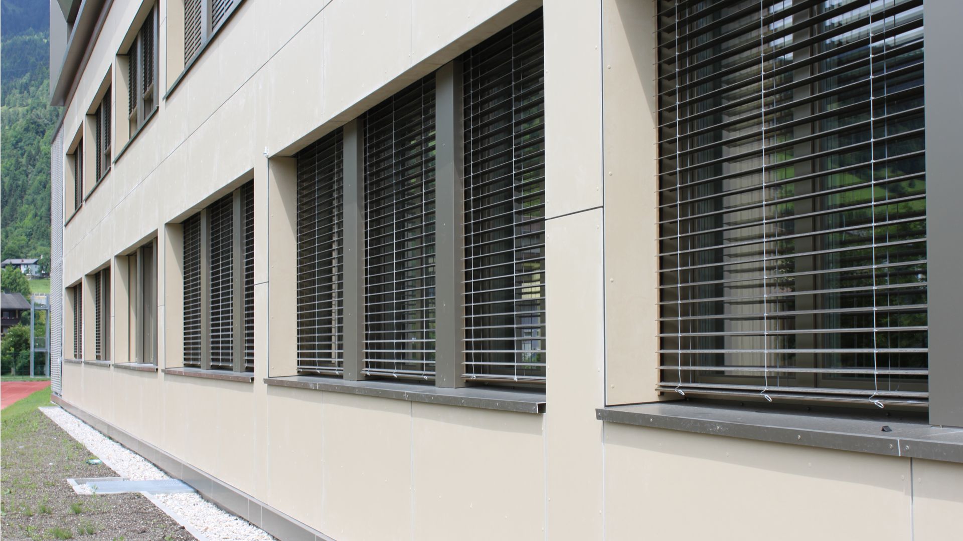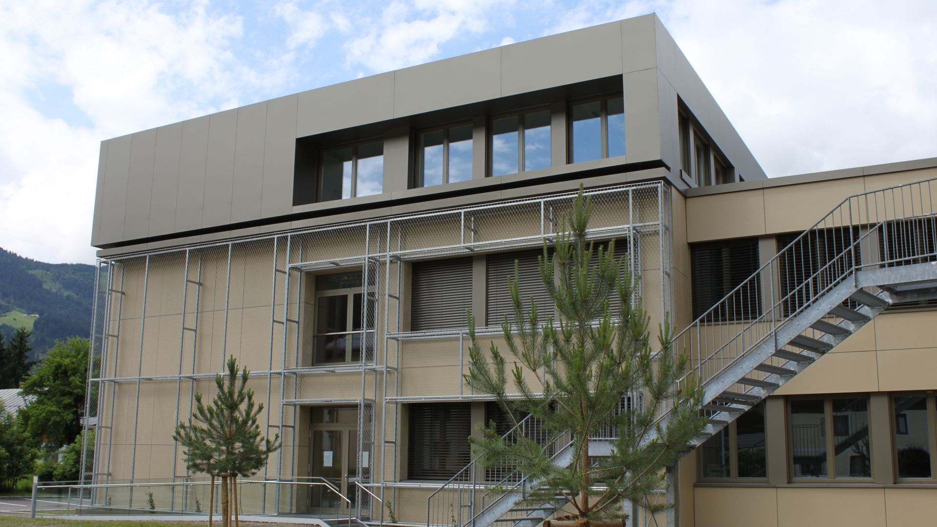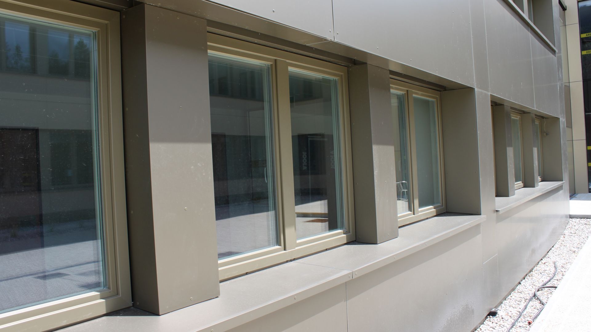 Im Bereich der Faserzementplatten wurden die Fugen gleich wie im Aluverbundbereich hinterlegt. Sämtliche Säulenverkleidungen sowie Vor- und Rücksprünge wurden mit Aluverbundplatten verkleidet. Auch das Rankgerüst wurde verkleidet.Die besondere Schwierigkeit war es, die Vor- und Rücksprünge auszubilden und über die Ecken des Gebäudes zu ziehen.