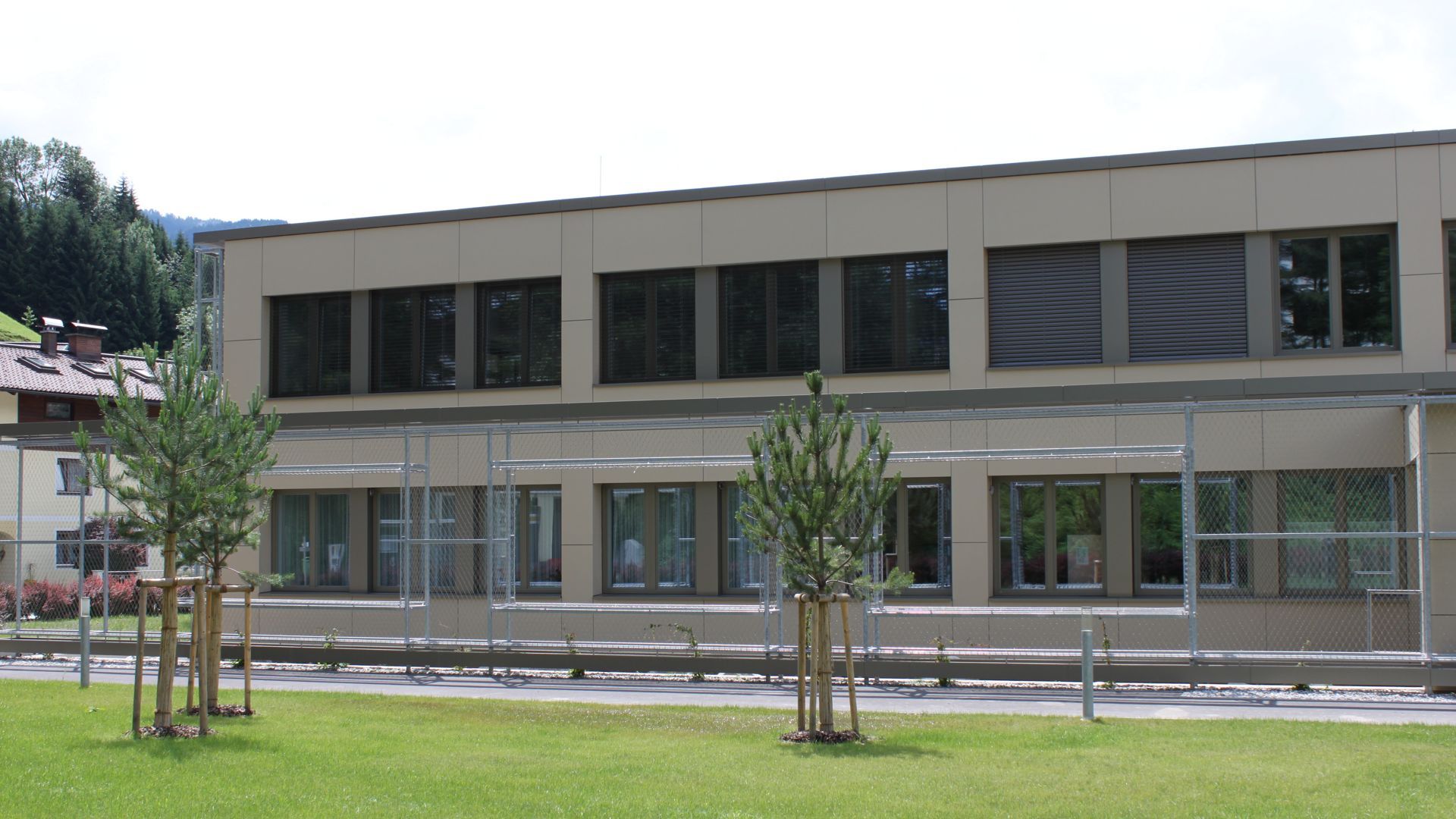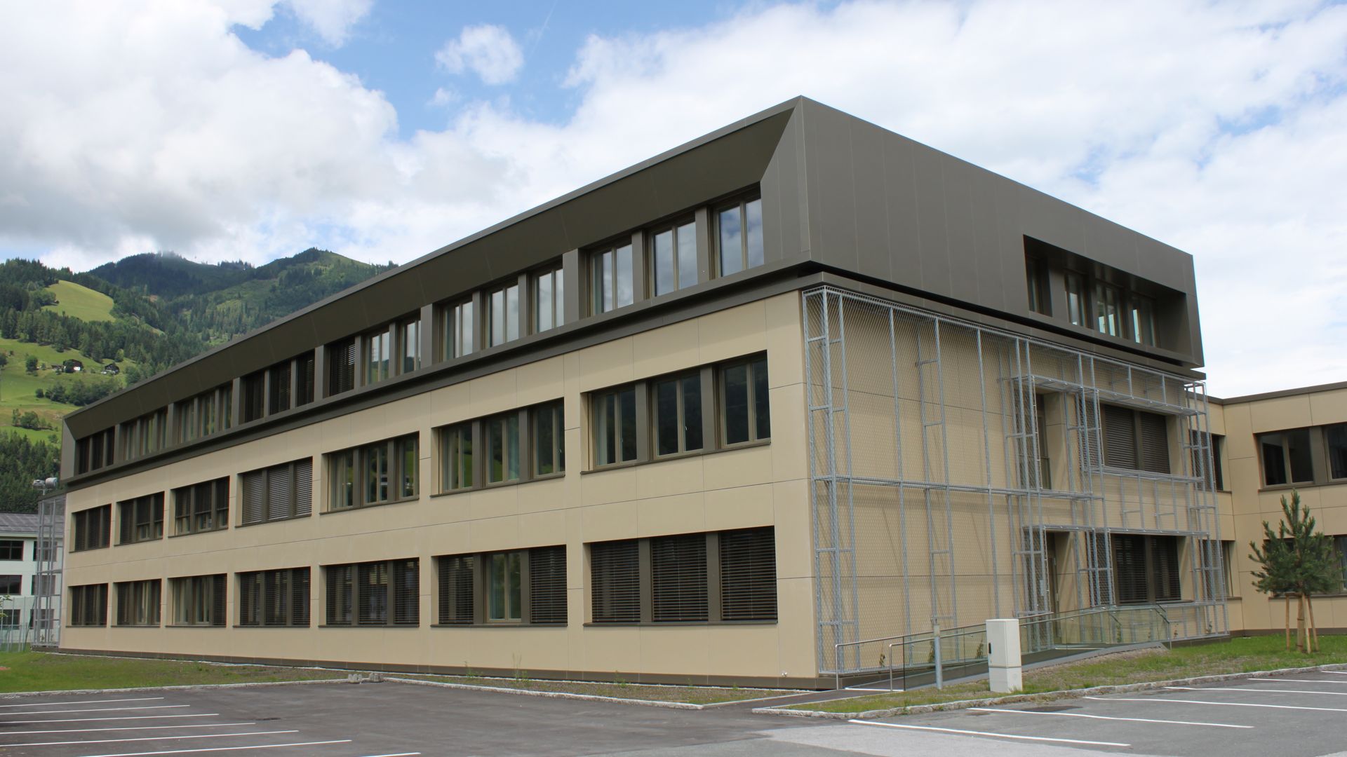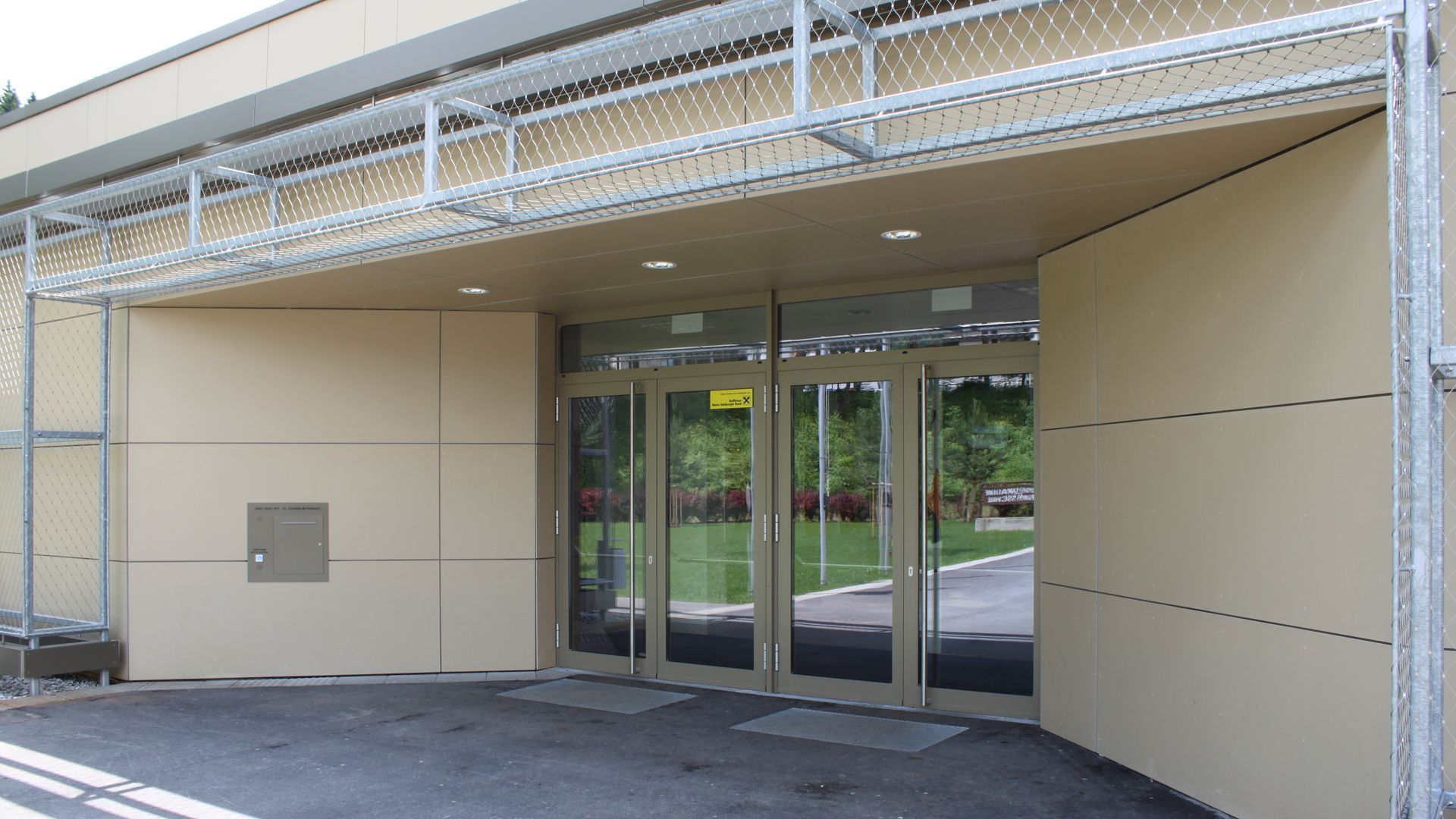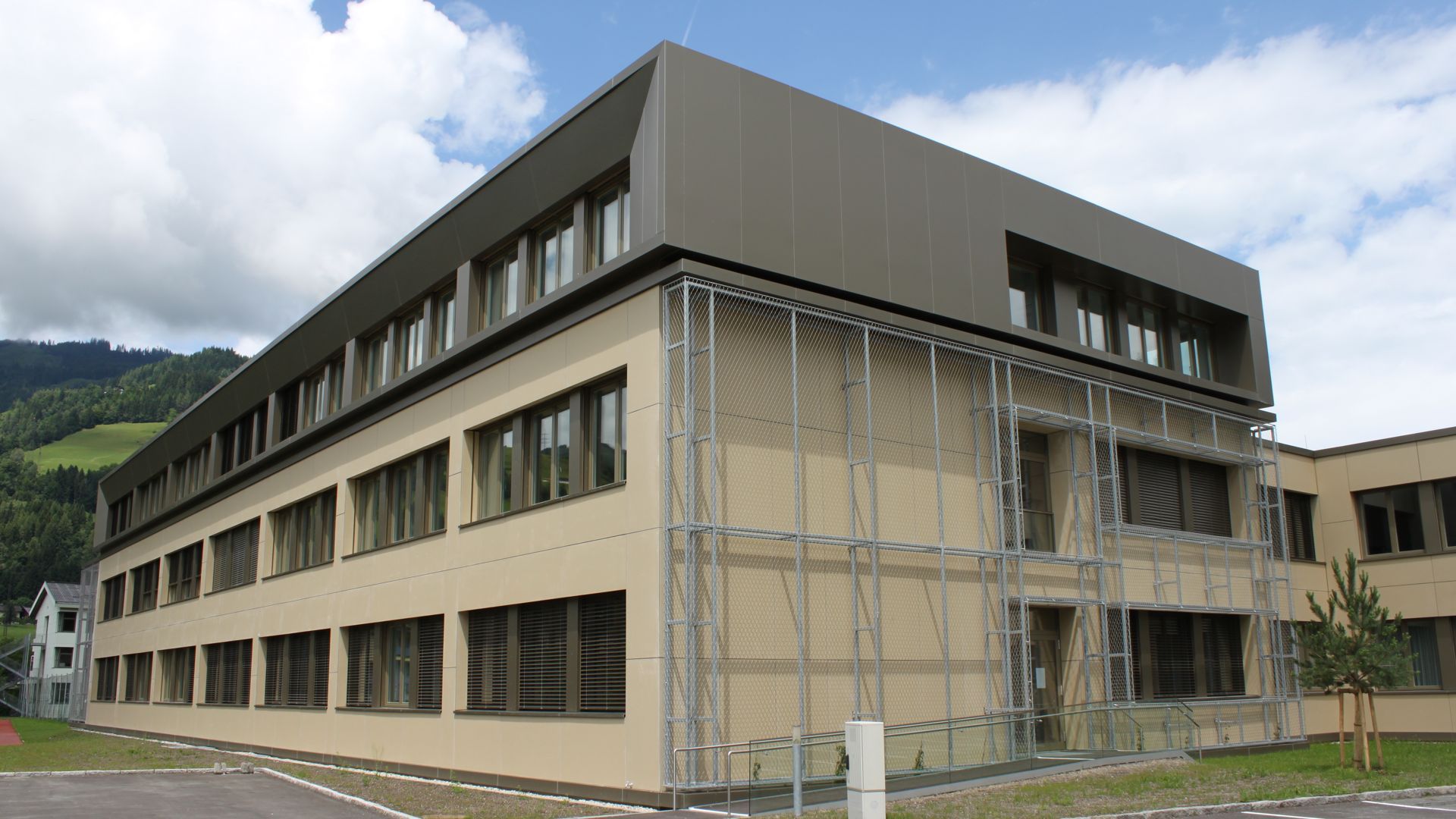 Im Bereich der Faserzementplatten wurden die Fugen gleich wie im Aluverbundbereich hinterlegt. Sämtliche Säulenverkleidungen sowie Vor- und Rücksprünge wurden mit Aluverbundplatten verkleidet. Auch das Rankgerüst wurde verkleidet.Die besondere Schwierigkeit war es, die Vor- und Rücksprünge auszubilden und über die Ecken des Gebäudes zu ziehen.