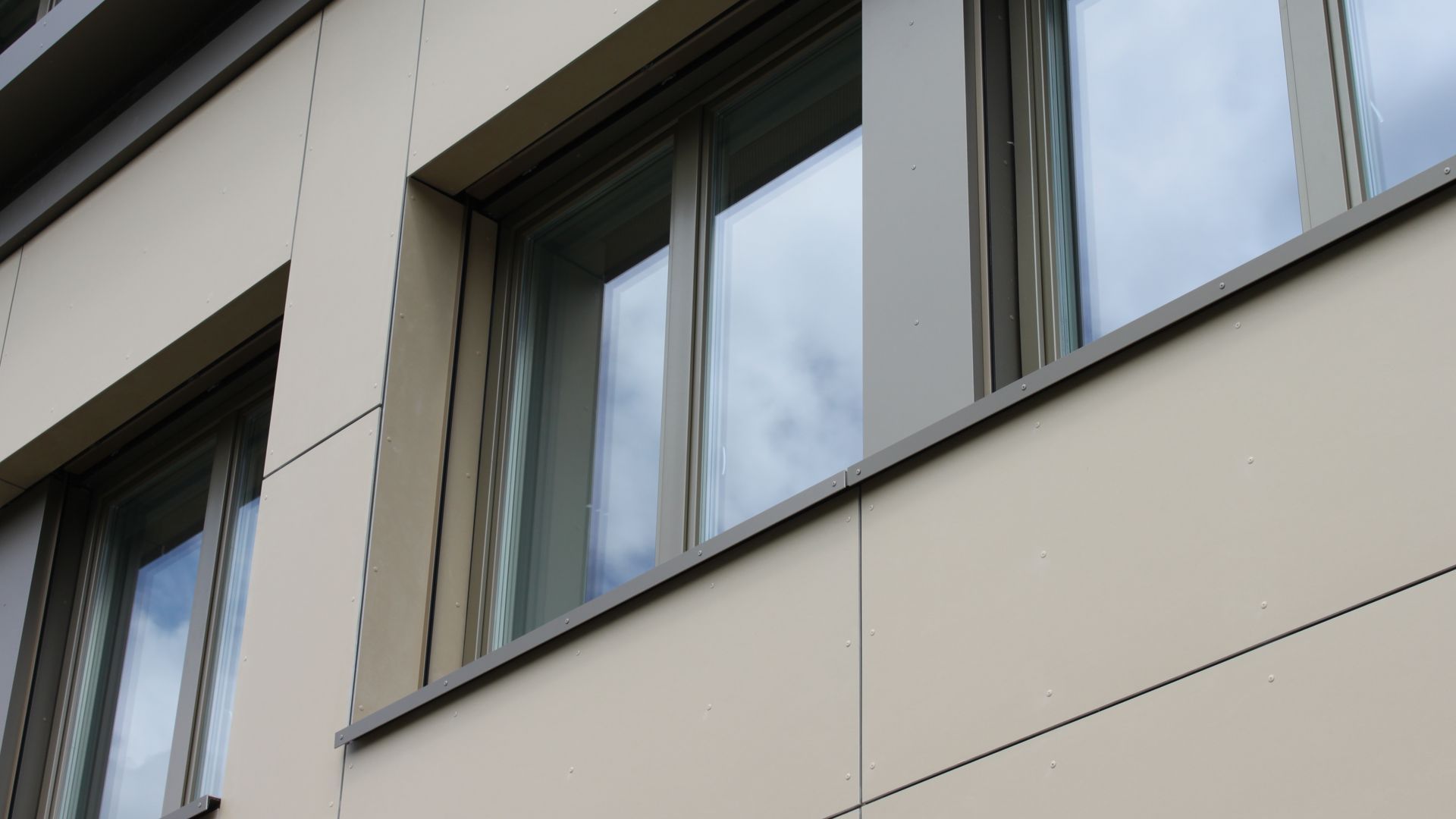 Im Bereich der Faserzementplatten wurden die Fugen nahtlos wie im Aluverbundbereich gestaltet. Alle Säulenverkleidungen sowie Vor- und Rücksprünge wurden mit edlen Aluverbundplatten veredelt. Selbst das Rankgerüst erhielt eine stilvolle Verkleidung. Besonders herausfordernd war die präzise Ausführung der Vor- und Rücksprünge über die Ecken des Gebäudes hinweg.