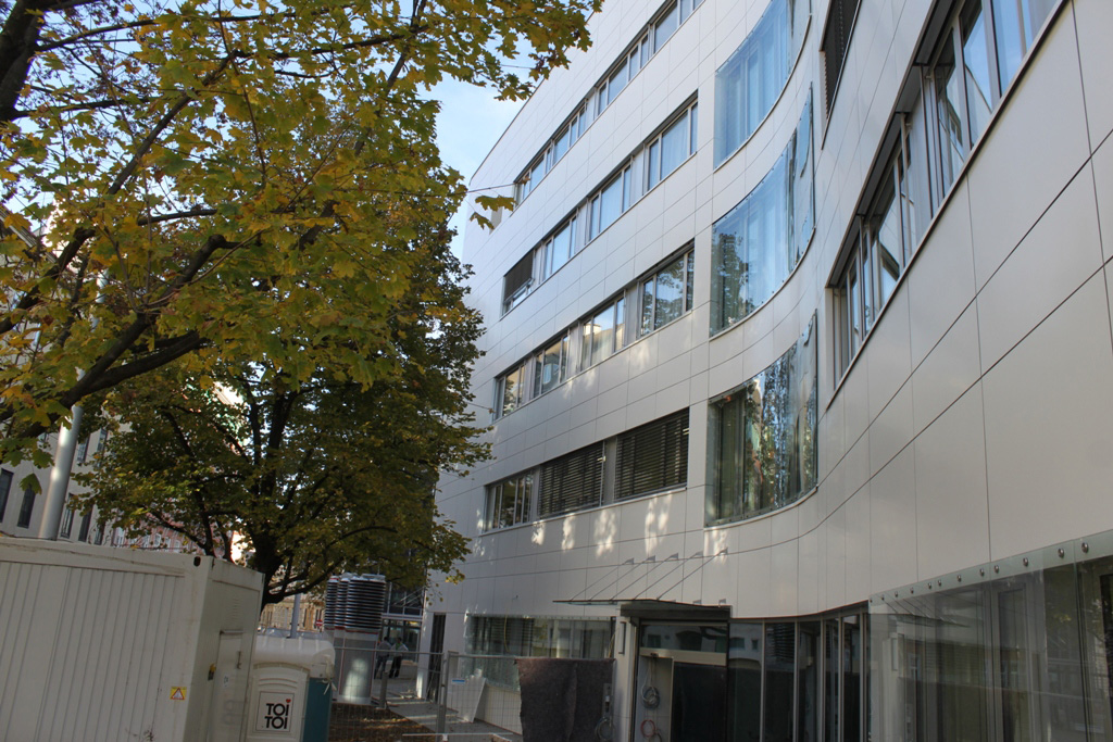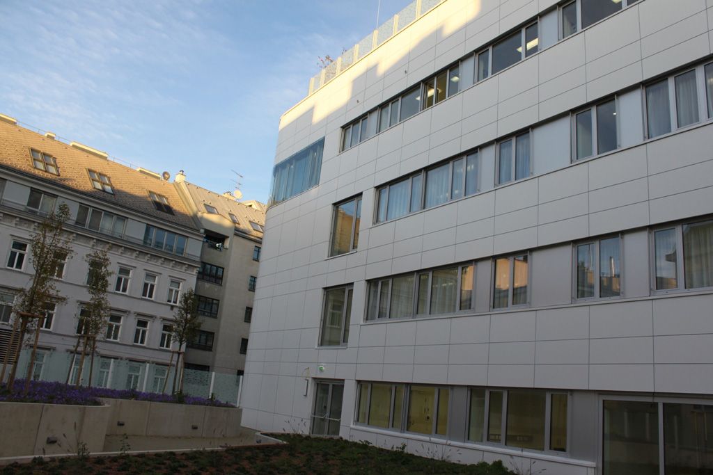 Bei der Krankenanstalt Rudolfsstiftung Juchgasse in Wien wurde die gesamte äußere Fassadenfläche als auch der Innenhof und die Erker geklebt montiert. Die Aluverbundplatten wurden teilweise vorgerollt.