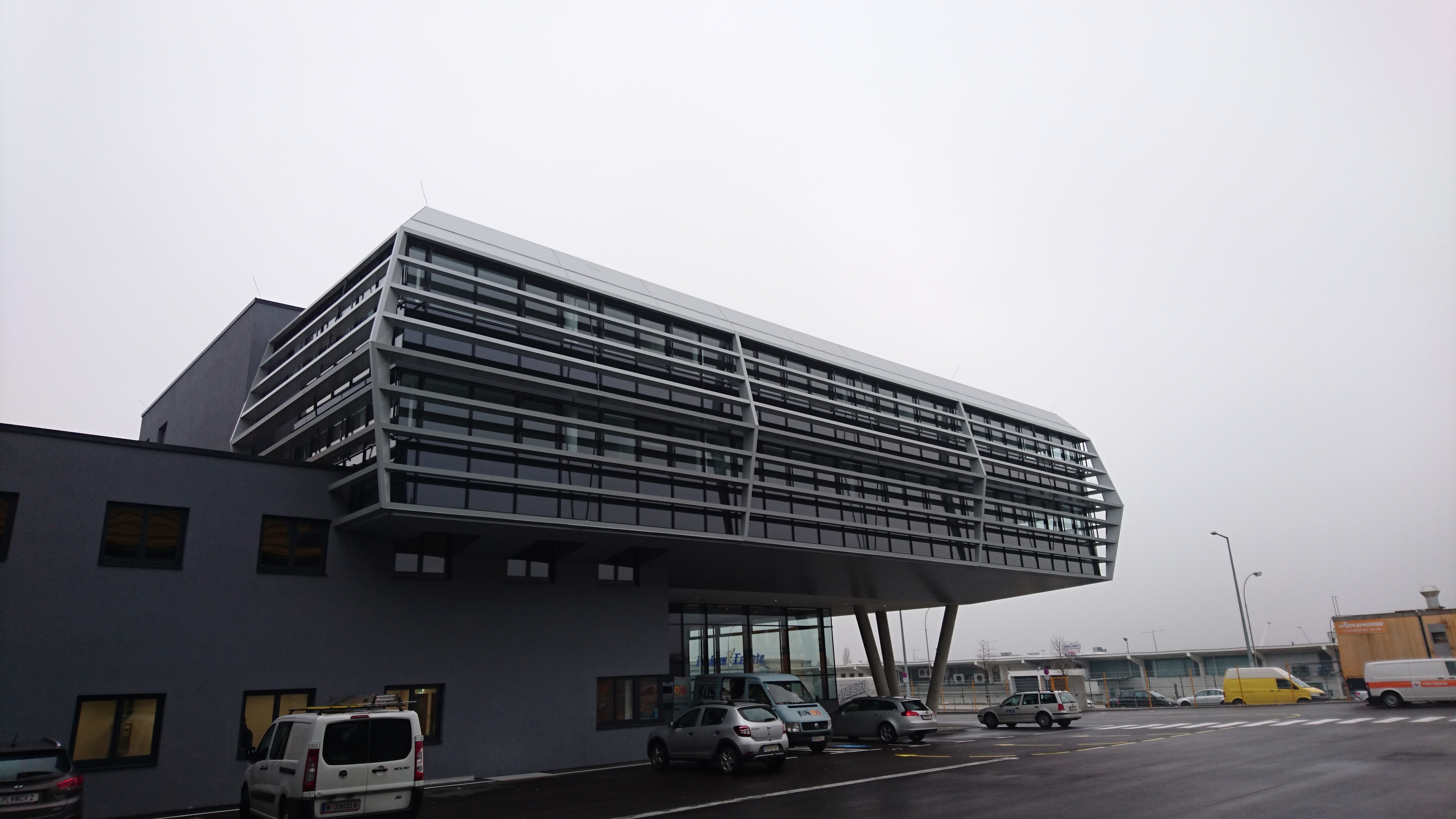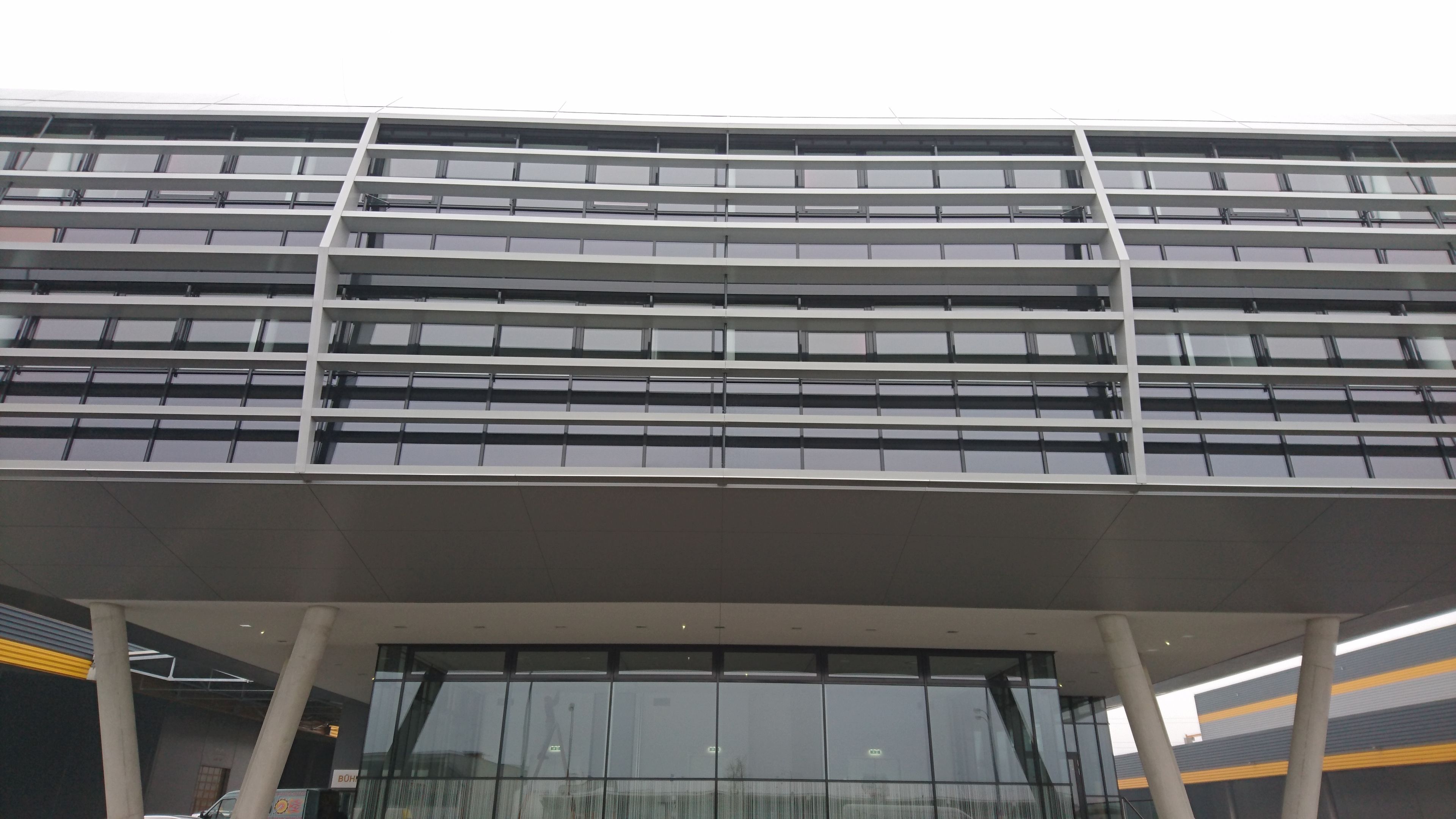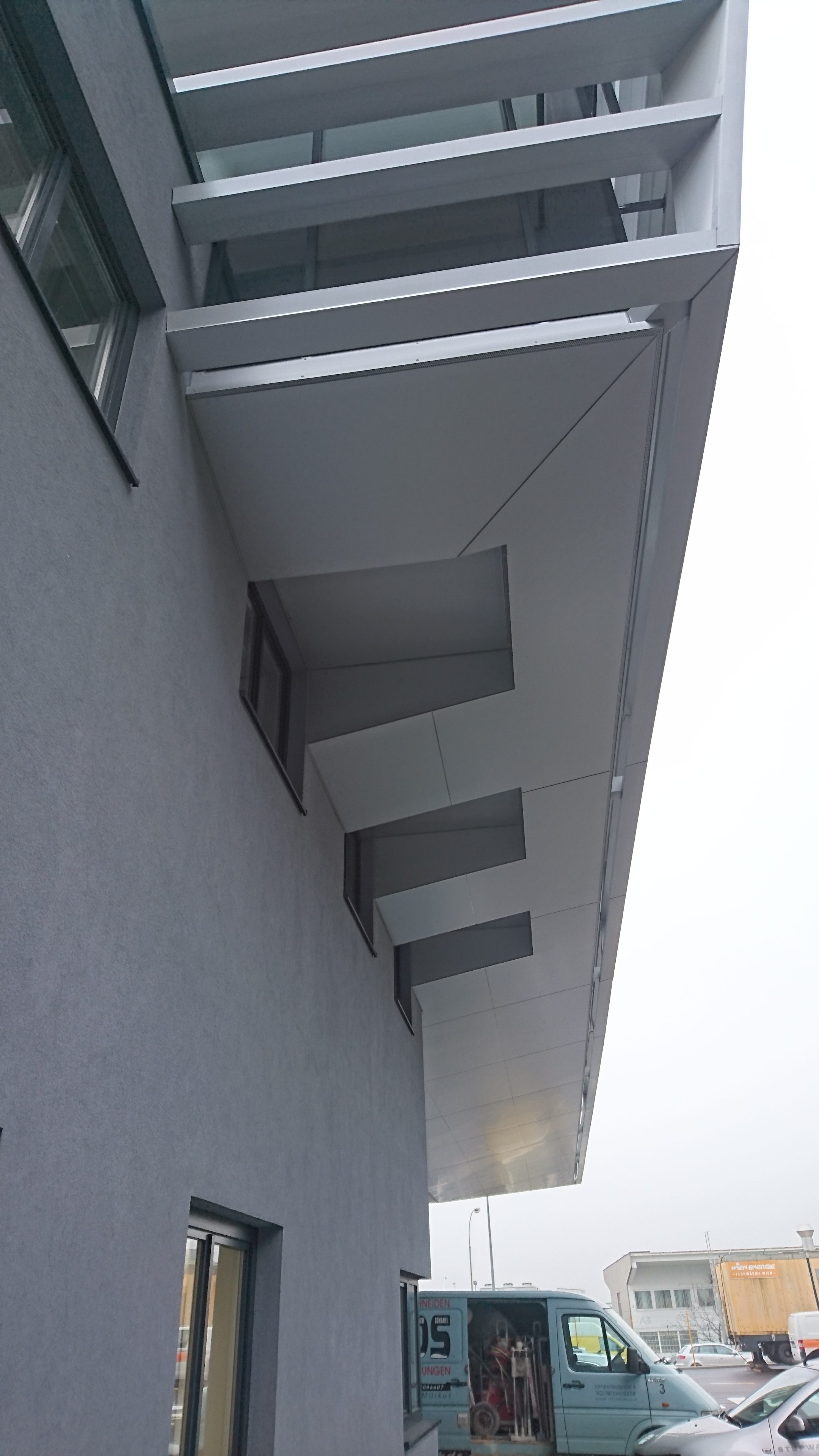 Die Attika und die Untersicht des Gebäudes werden mit eleganten Aluverbundplatten verkleidet, wobei auch Stützsäulen und Leuchtenkörper einbezogen werden. Um einen spannenden Kontrast zu den glatten Aluverbundverkleidungen zu schaffen, sind vor den umlaufenden Fensterelementen des Hauptgebäudes regelmäßig Lamellen angeordnet. Diese Lamellen tragen zur dynamischen Formgebung des Gebäudes bei und verleihen ihm eine ansprechende Gestaltung.