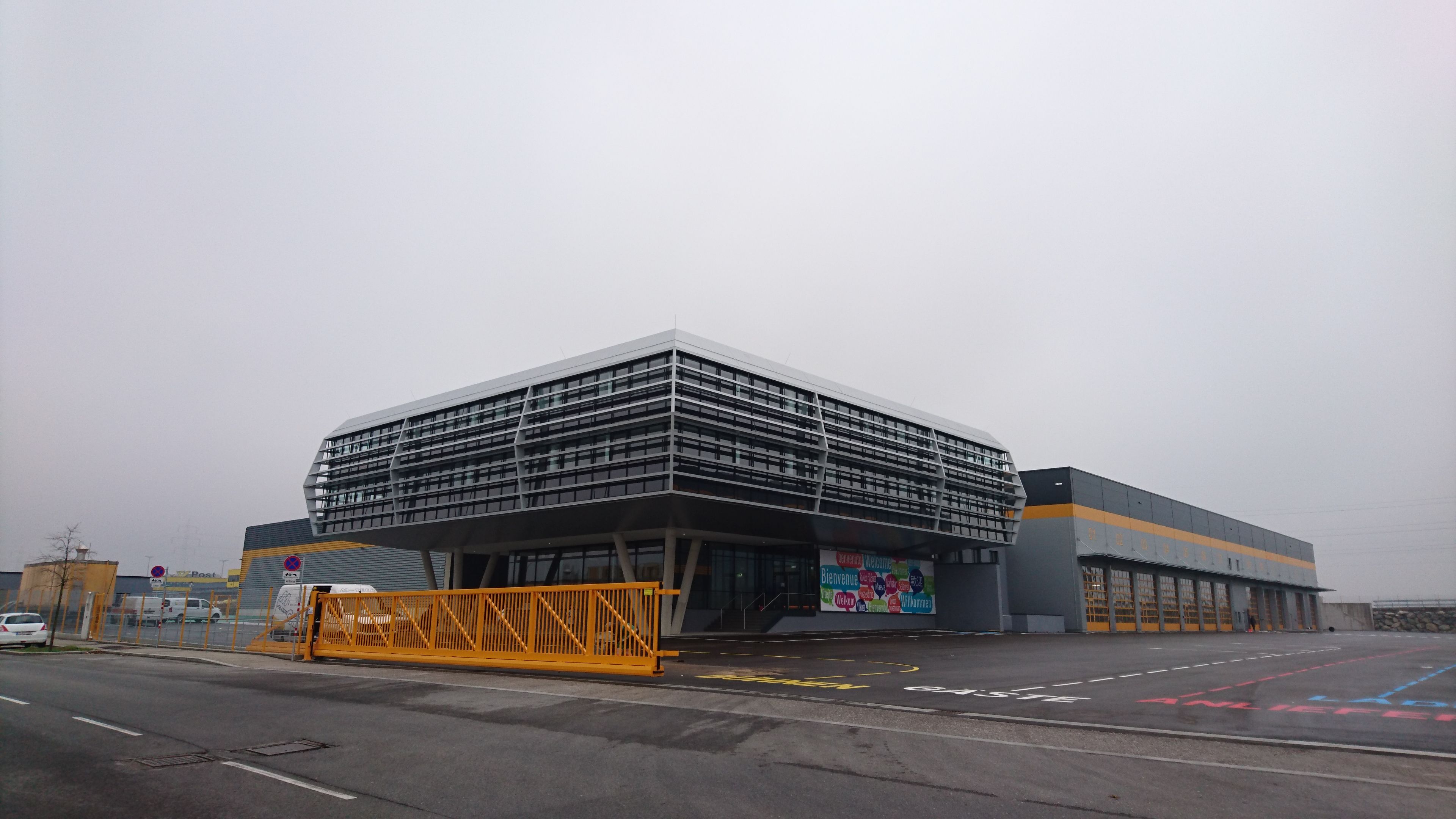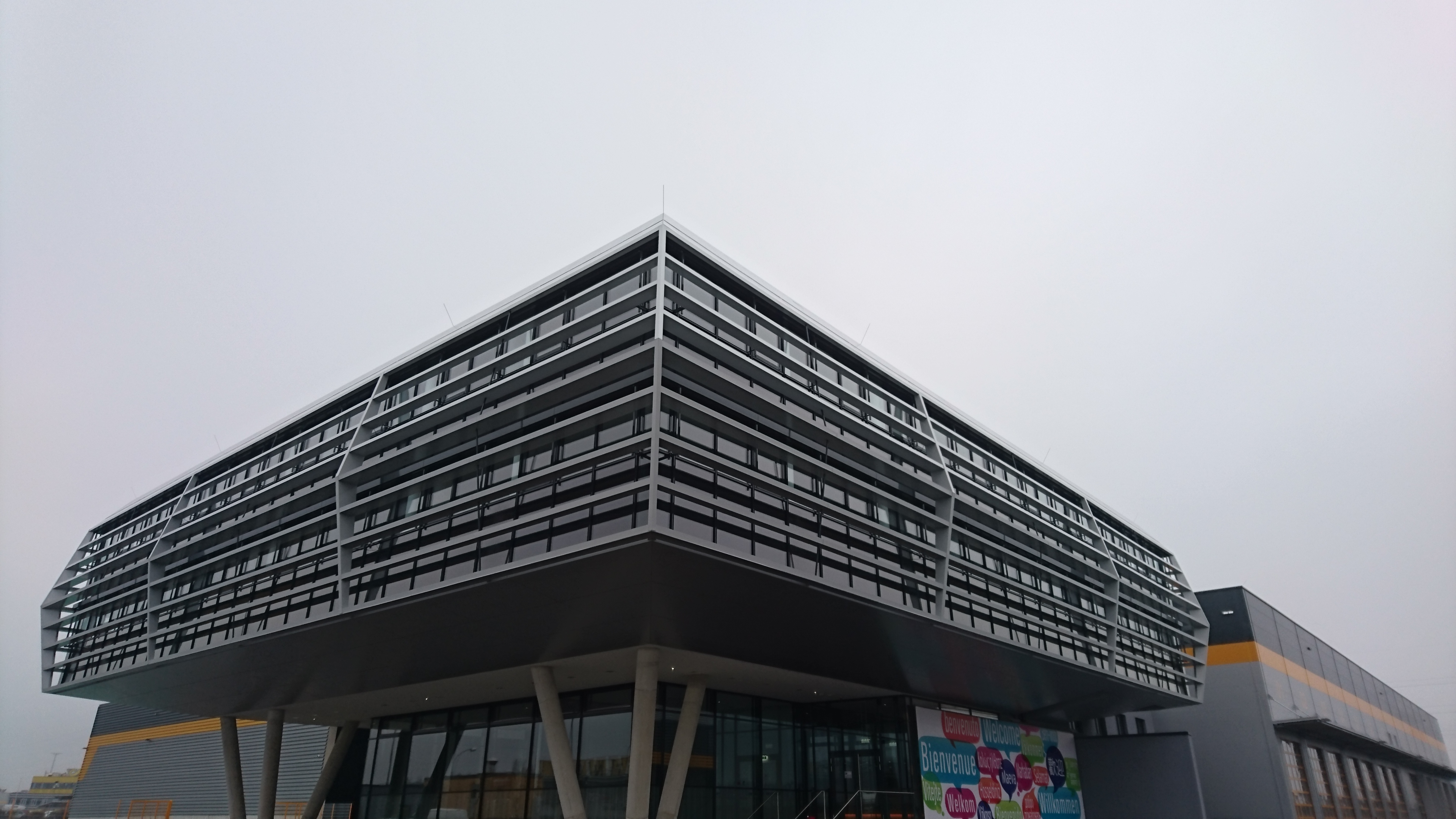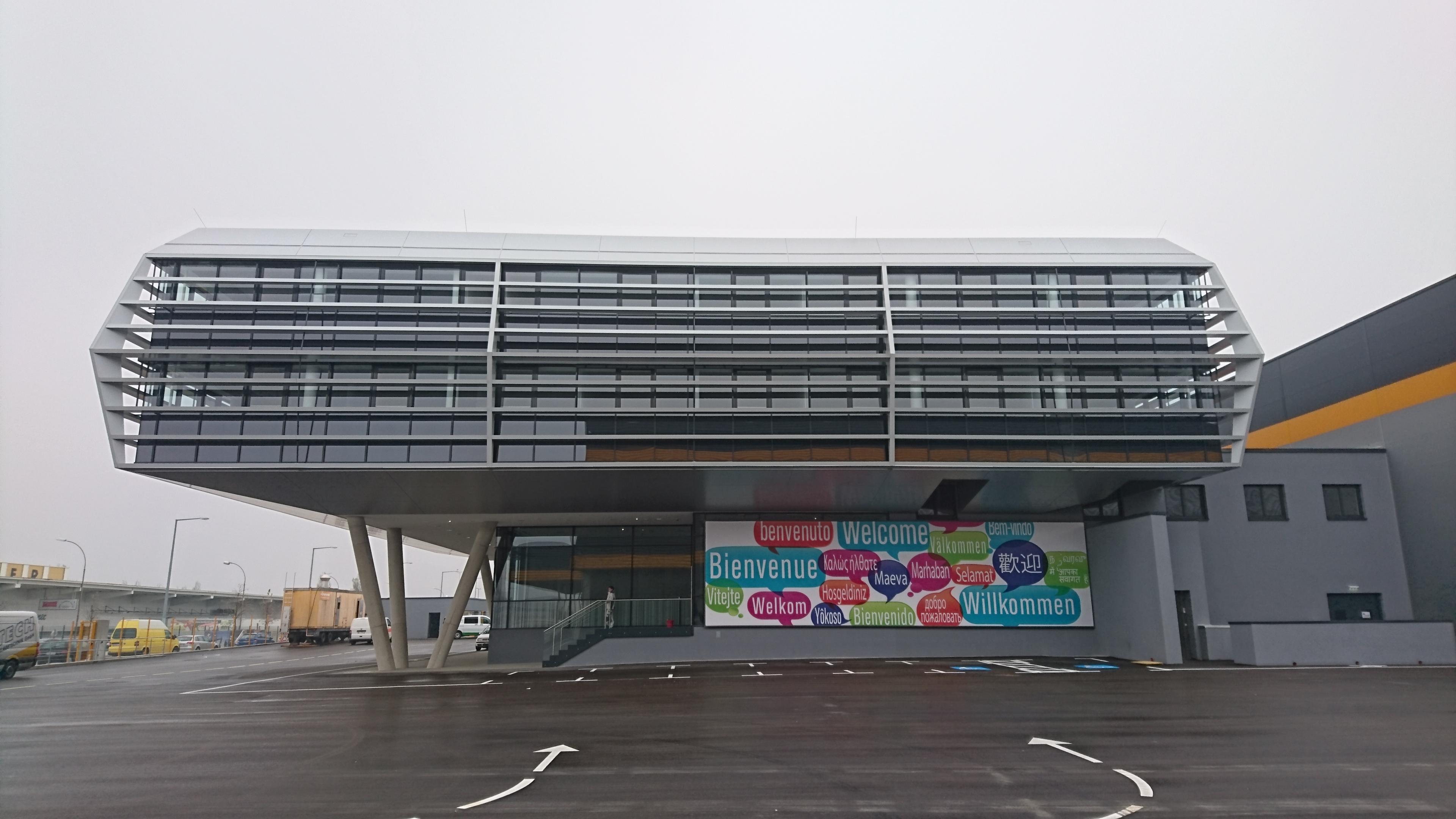 Die Attika und die Untersicht des Gebäudes werden mit eleganten Aluverbundplatten verkleidet, wobei auch Stützsäulen und Leuchtenkörper einbezogen werden. Um einen spannenden Kontrast zu den glatten Aluverbundverkleidungen zu schaffen, sind vor den umlaufenden Fensterelementen des Hauptgebäudes regelmäßig Lamellen angeordnet. Diese Lamellen tragen zur dynamischen Formgebung des Gebäudes bei und verleihen ihm eine ansprechende Gestaltung.