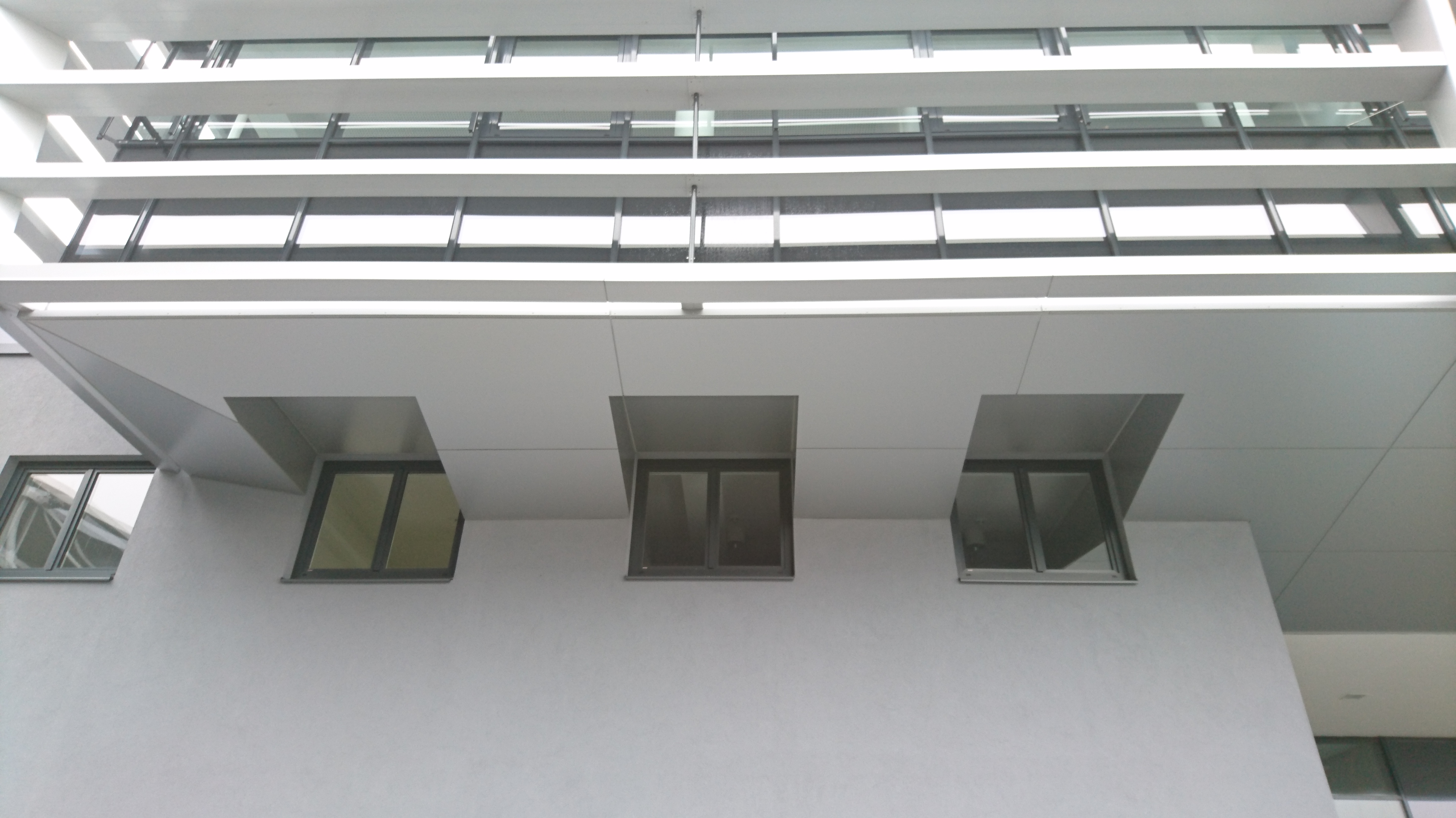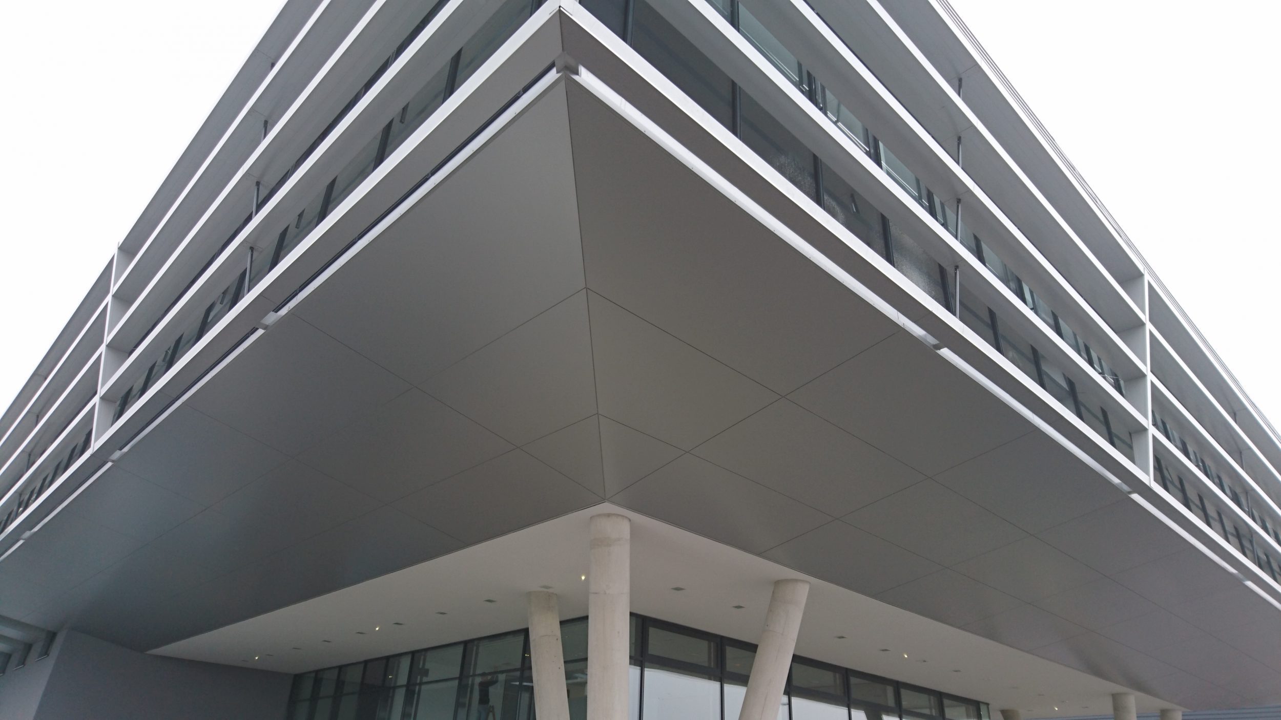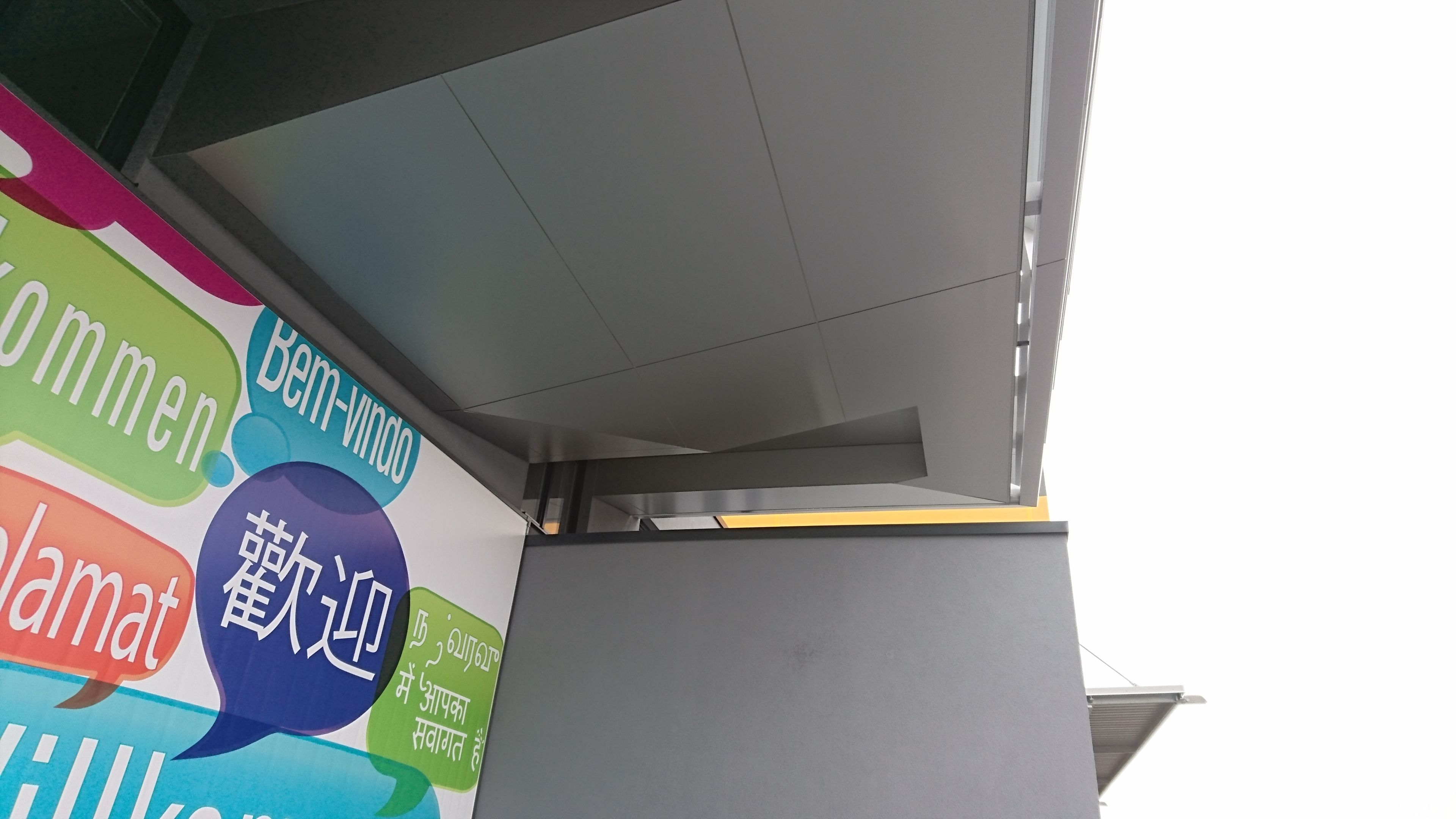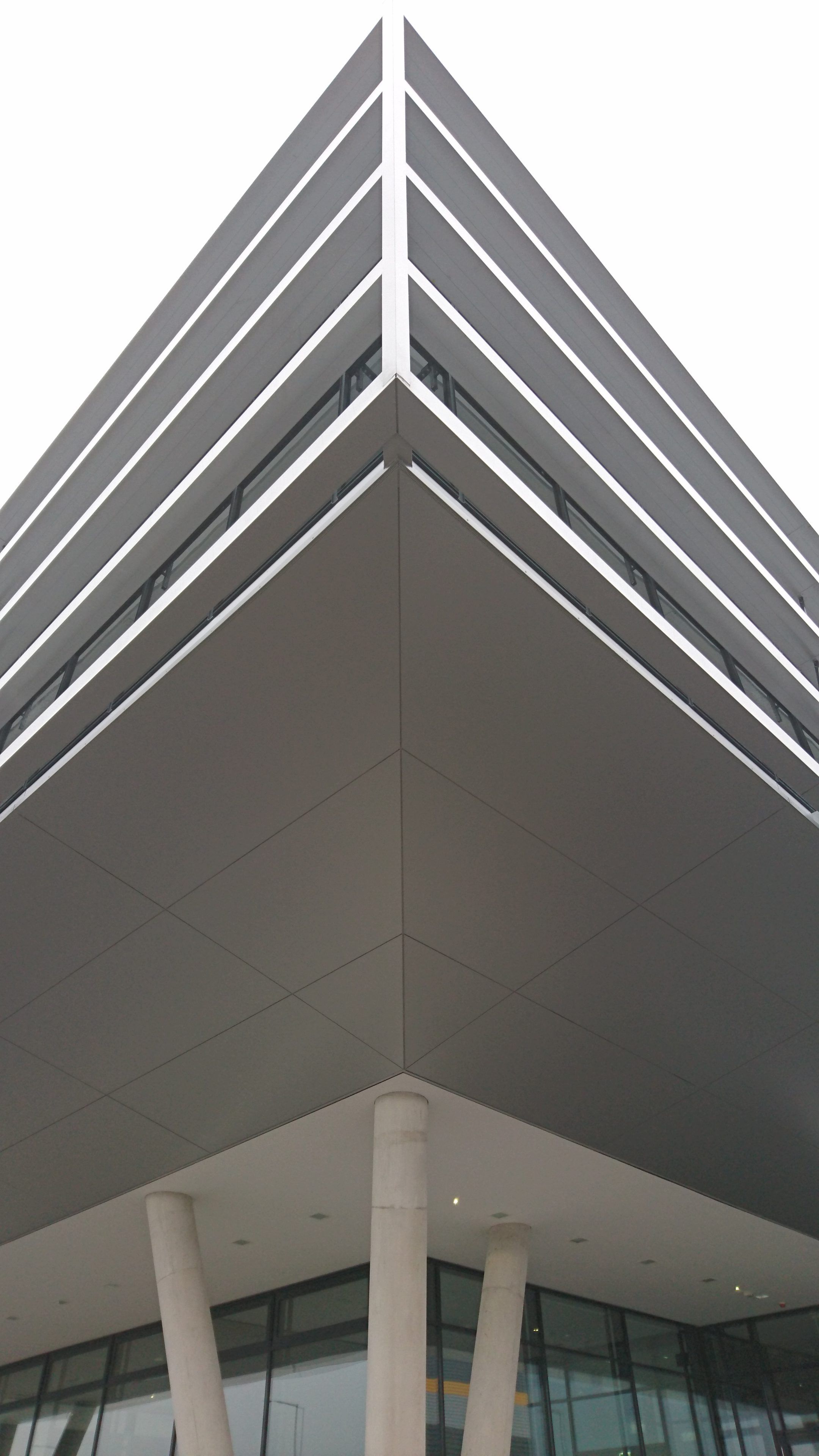 Sowohl die Attika, wie auch die Untersicht, werden in Aluverbundplatten verkleidet. Dabei werden Elemente wie Stützsäulen und Leuchtenkörper mit eingebunden. Um einen Kontrast zu den ebenen Aluverbundverkleidungen zu erzeugen, werden vor die umlaufenden Fensterelemente des Hauptgebäudes in regelmäßigen Abständen Lamellen eingezogen, welche zur Formgebung des Gebäudes beitragen.