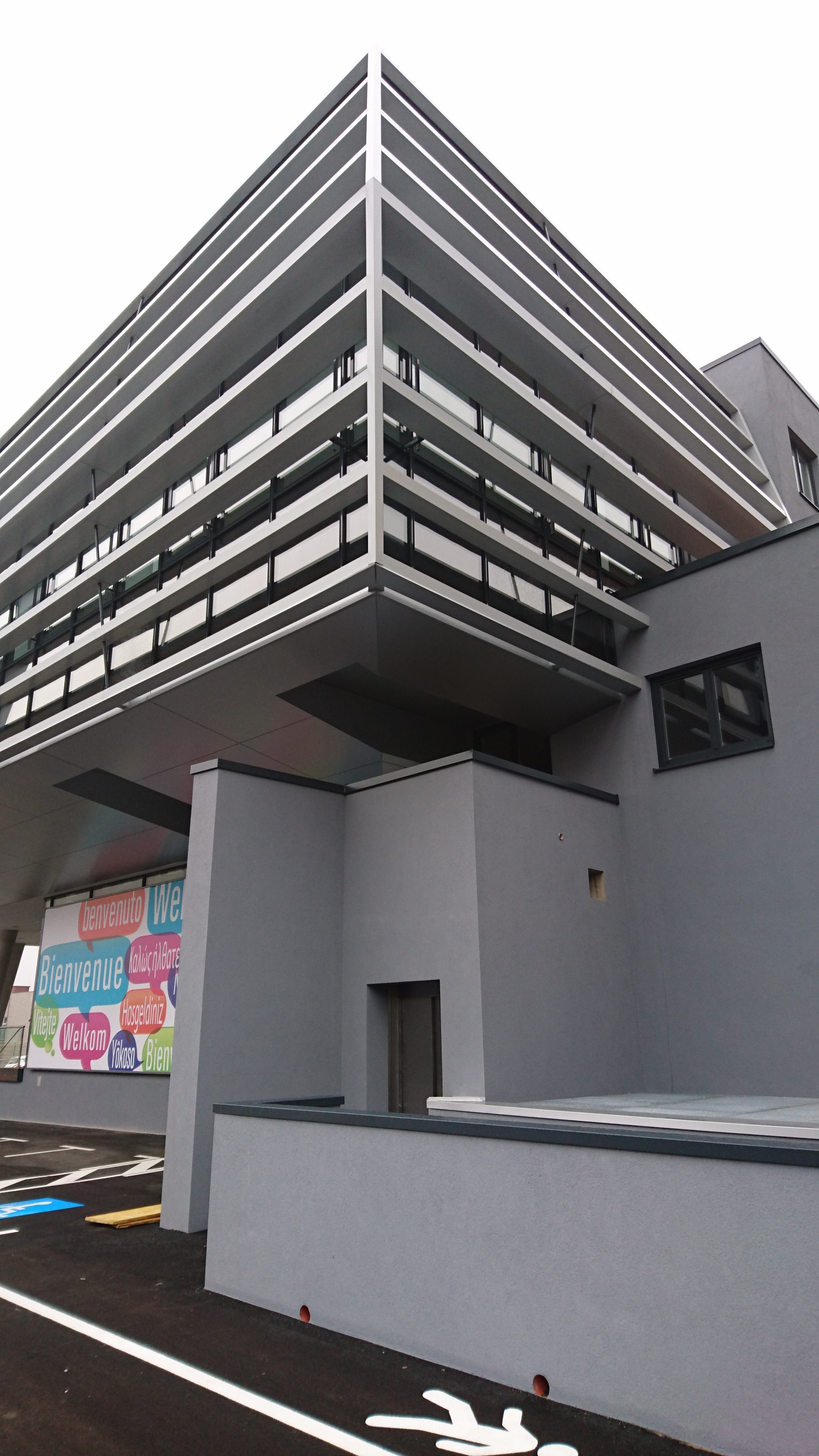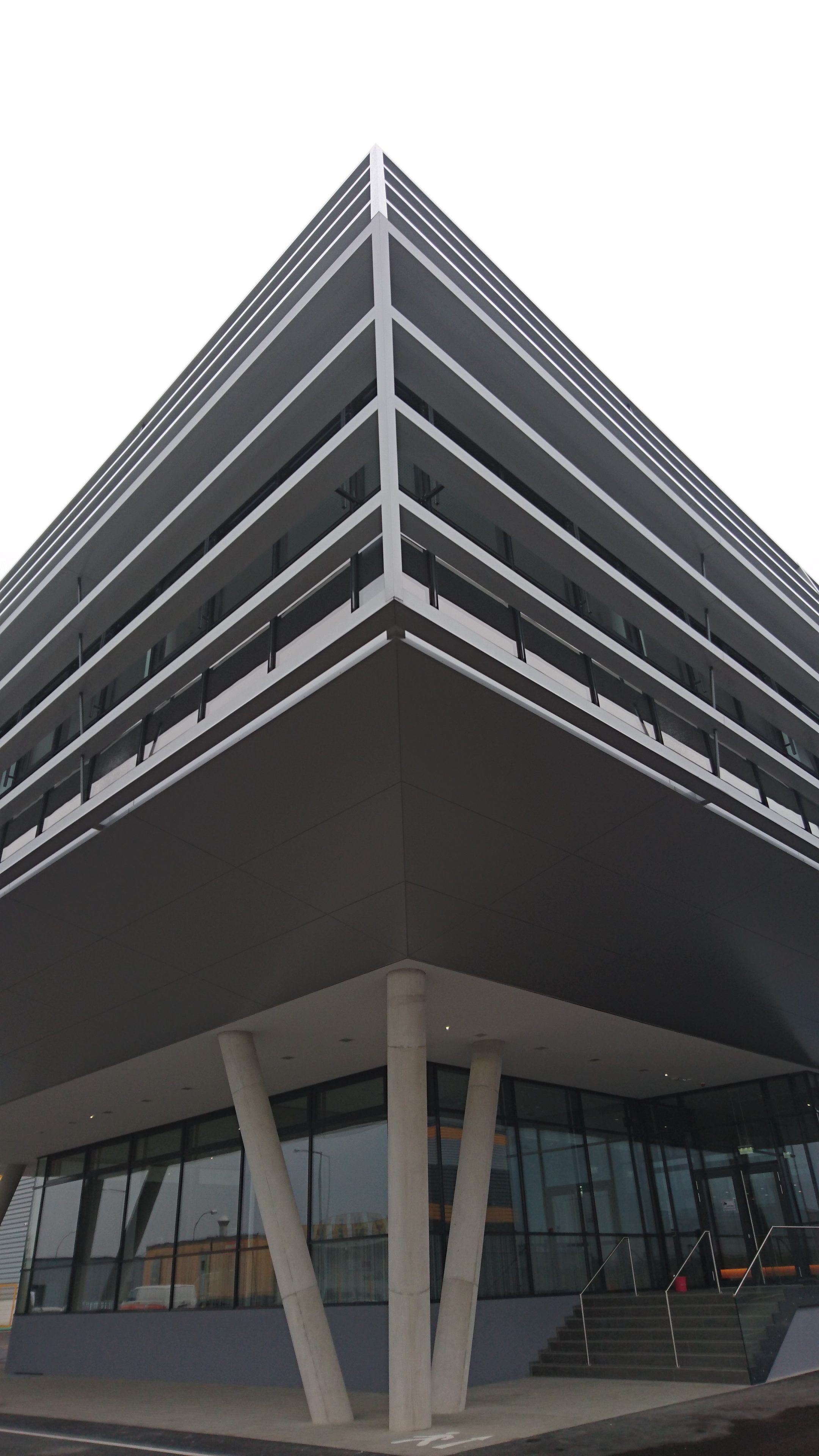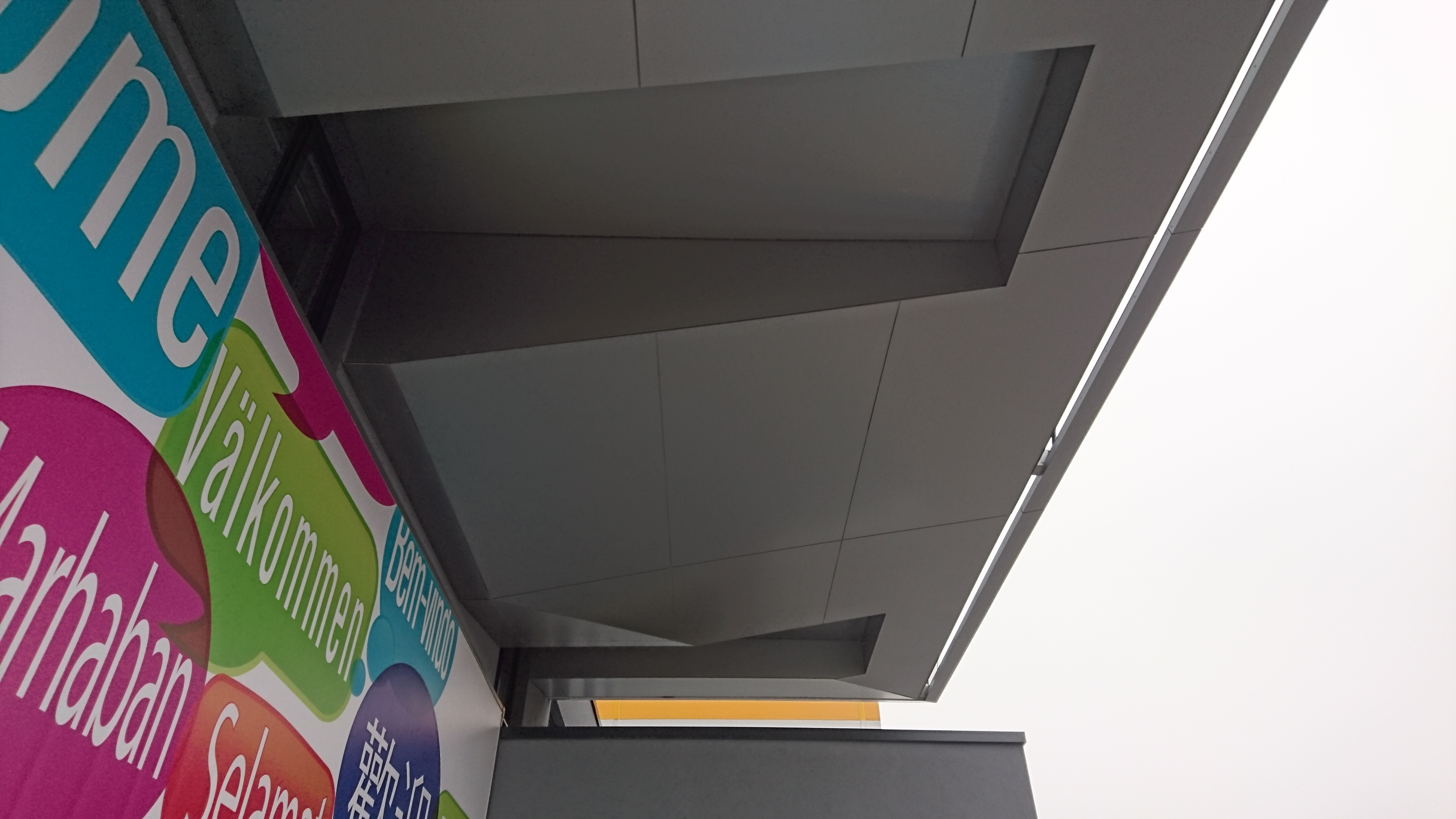 Sowohl die Attika, wie auch die Untersicht, werden in Aluverbundplatten verkleidet. Dabei werden Elemente wie Stützsäulen und Leuchtenkörper mit eingebunden. Um einen Kontrast zu den ebenen Aluverbundverkleidungen zu erzeugen, werden vor die umlaufenden Fensterelemente des Hauptgebäudes in regelmäßigen Abständen Lamellen eingezogen, welche zur Formgebung des Gebäudes beitragen.