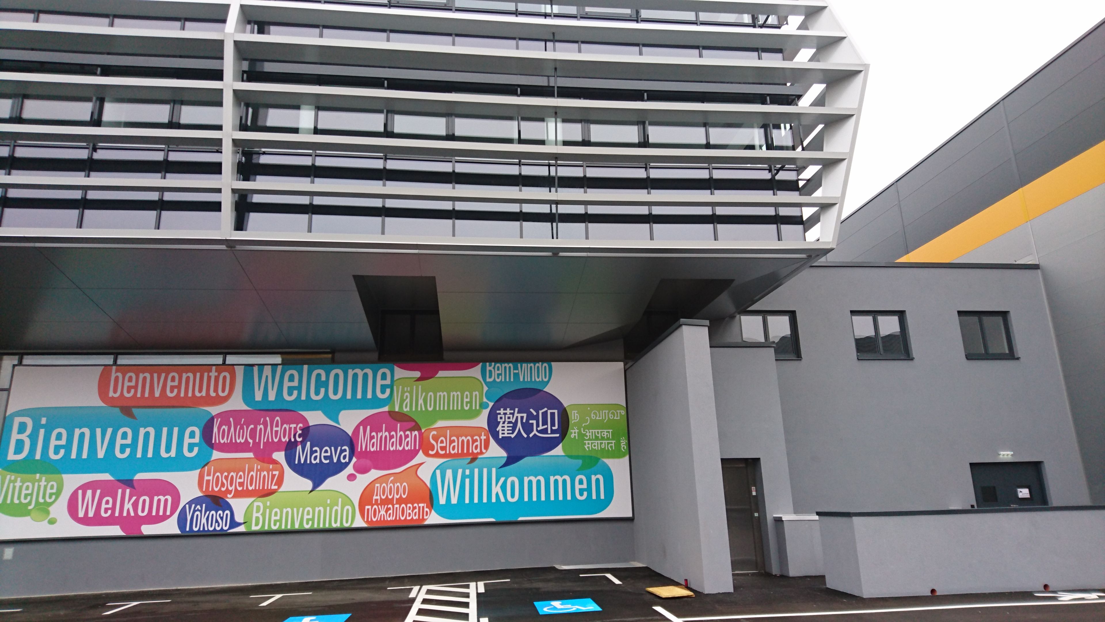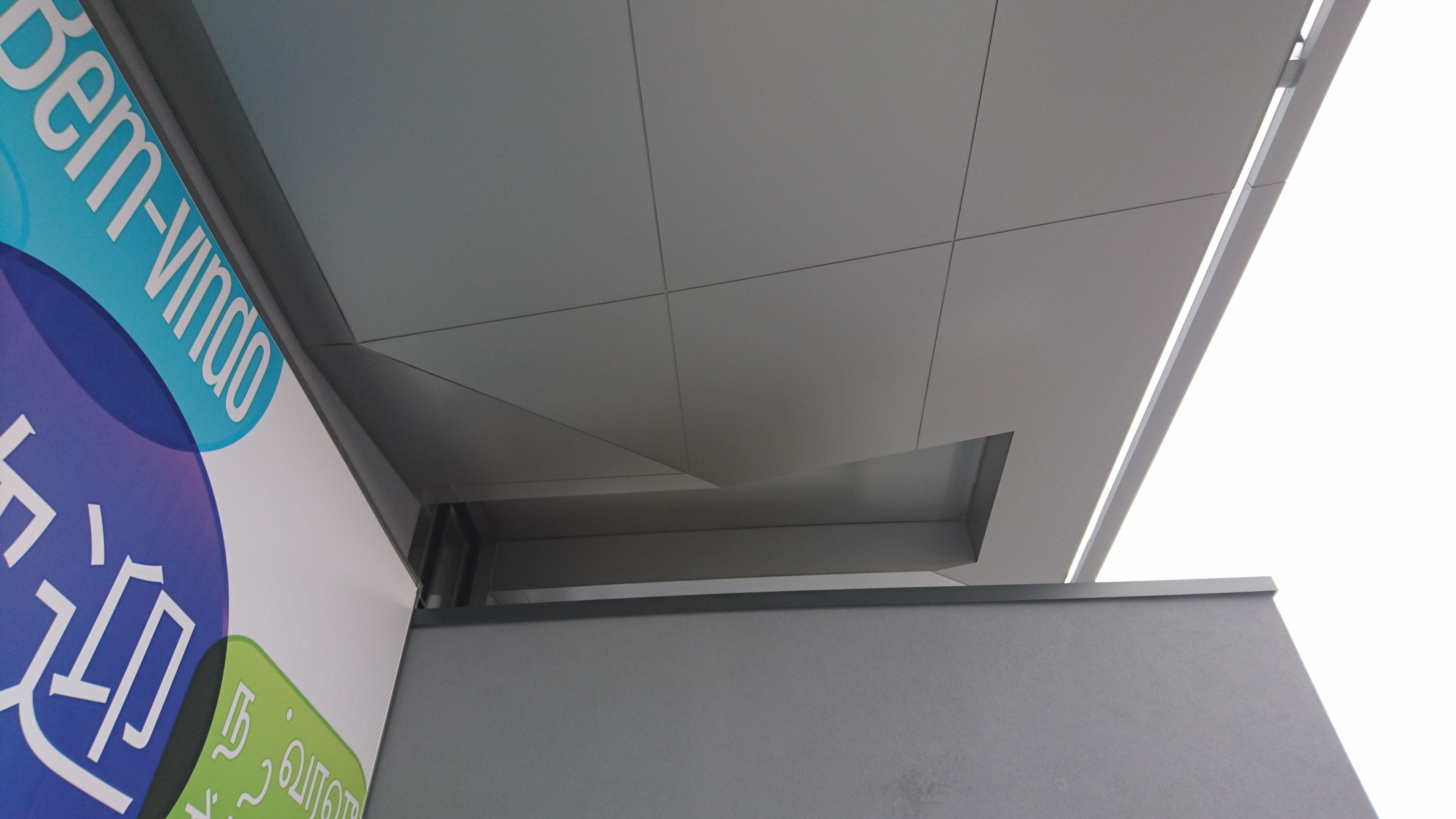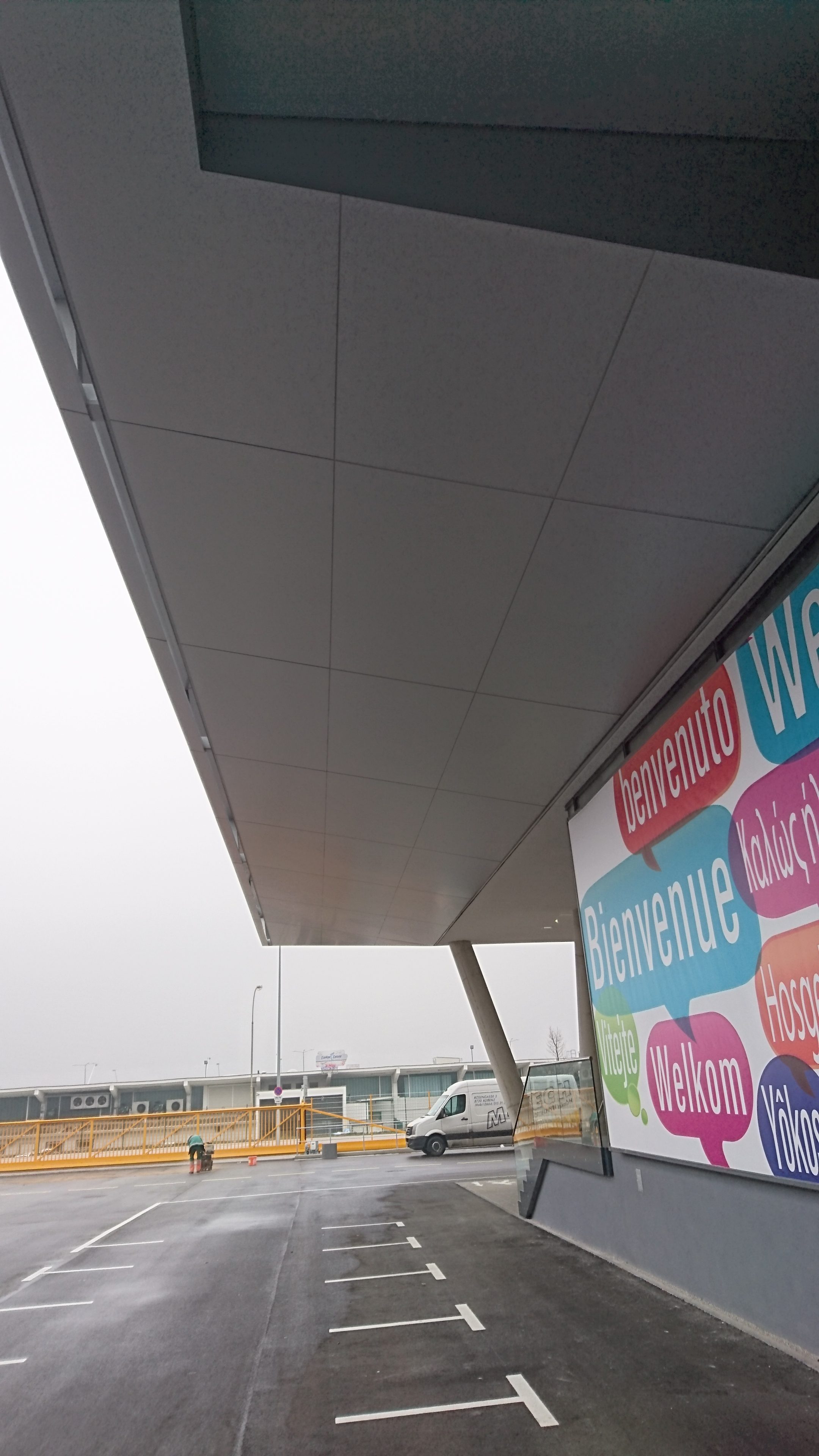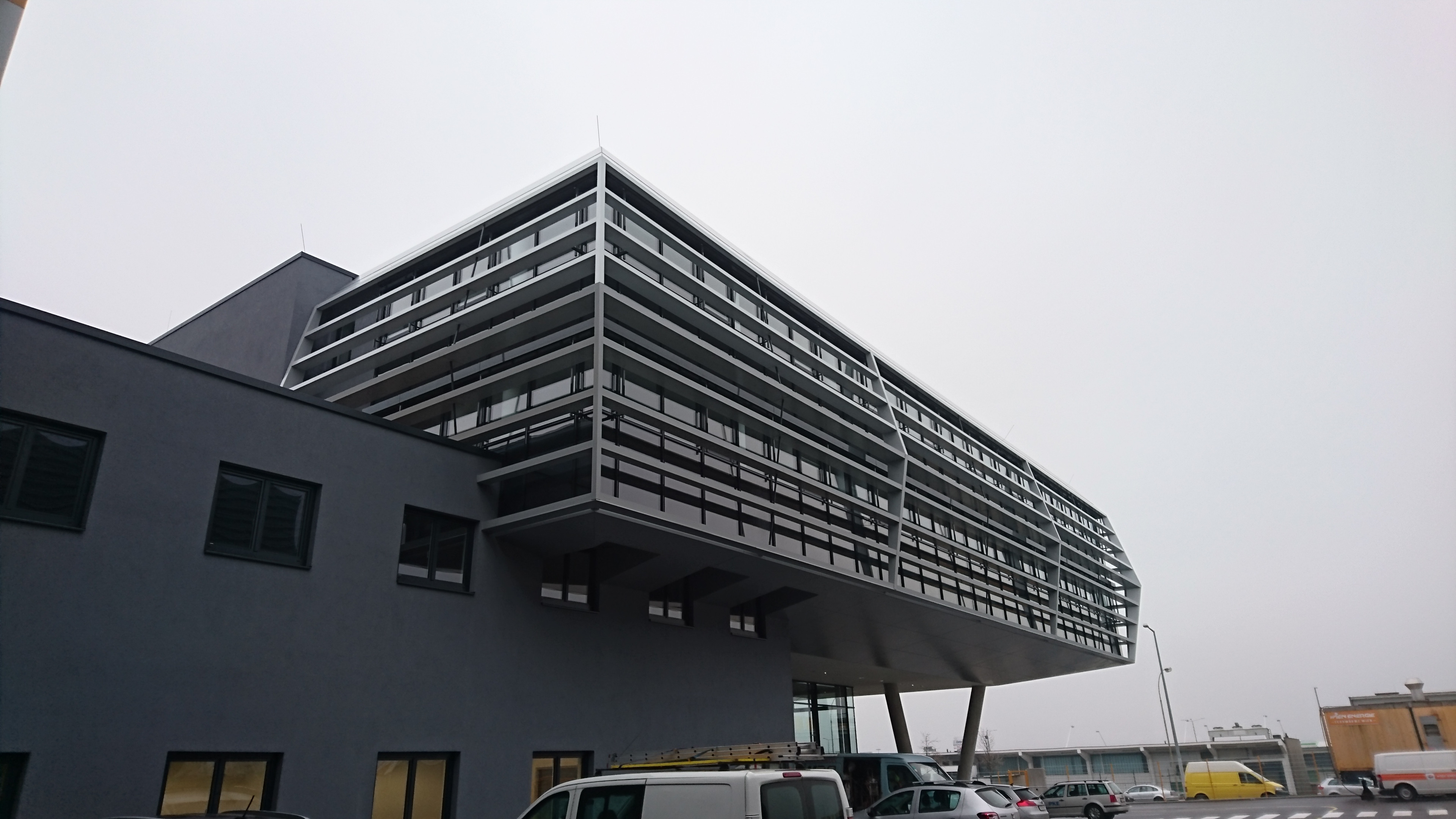 Sowohl die Attika, wie auch die Untersicht, werden in Aluverbundplatten verkleidet. Dabei werden Elemente wie Stützsäulen und Leuchtenkörper mit eingebunden. Um einen Kontrast zu den ebenen Aluverbundverkleidungen zu erzeugen, werden vor die umlaufenden Fensterelemente des Hauptgebäudes in regelmäßigen Abständen Lamellen eingezogen, welche zur Formgebung des Gebäudes beitragen.