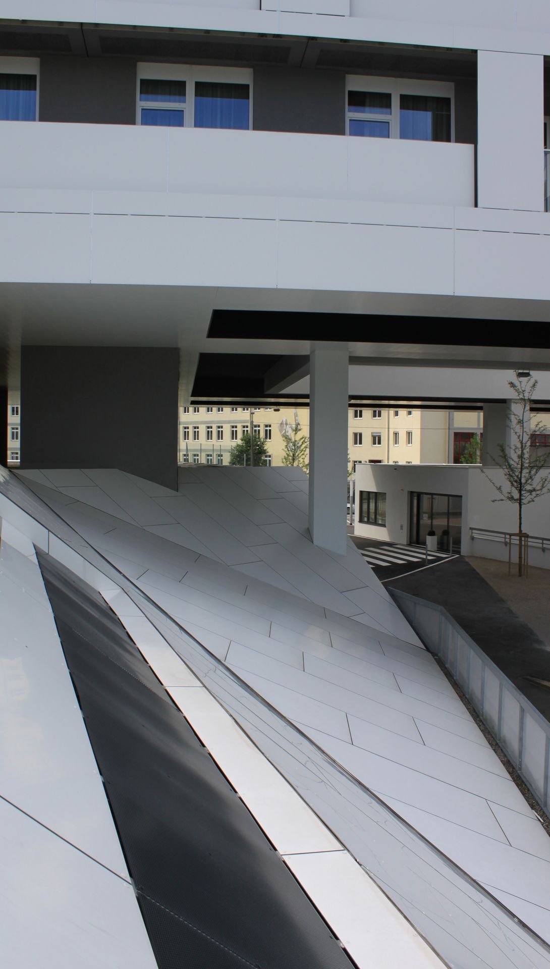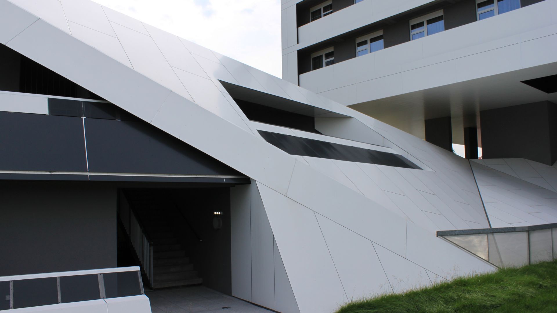 Das Gebäude „Betreutes Wohnen“ besteht nur aus schräg liegenden Flächen, die sich im Verschneidungspunkt zu neuen schräg liegenden Dreiecksflächen weiterentwickeln.