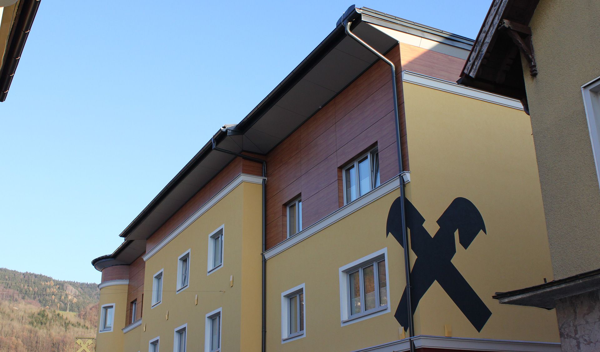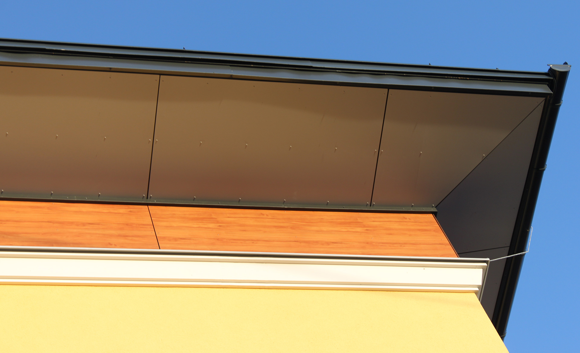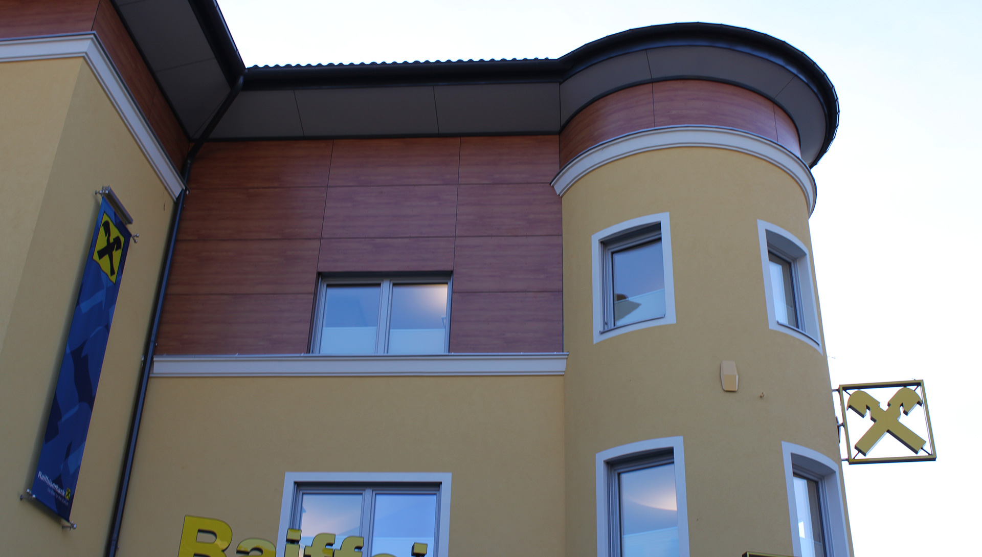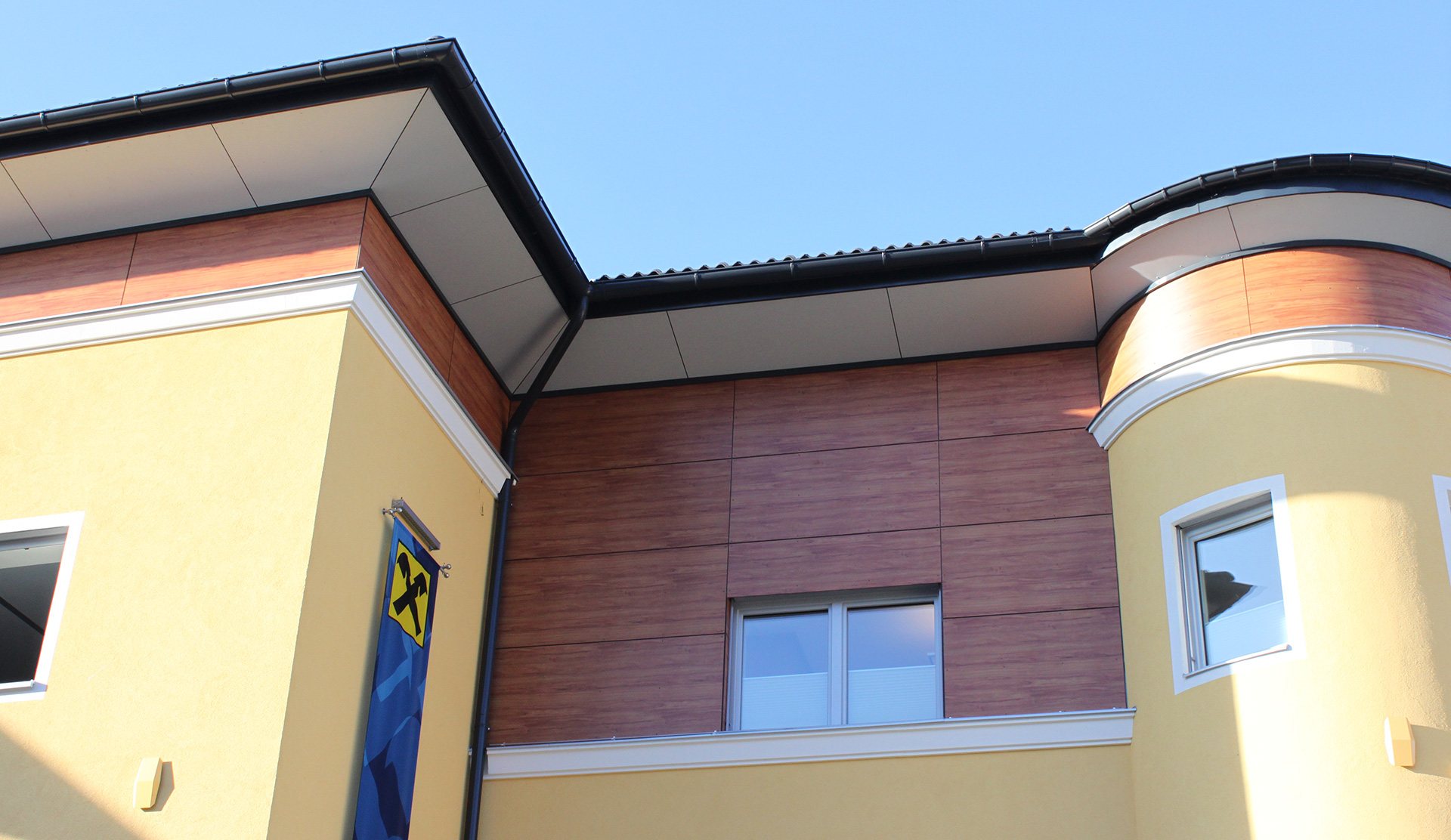 Beim Bauvorhaben Raika Mondsee wurden Fundermaxplatten sichtbar auf eine Holzunterkonstruktion geschraubt.