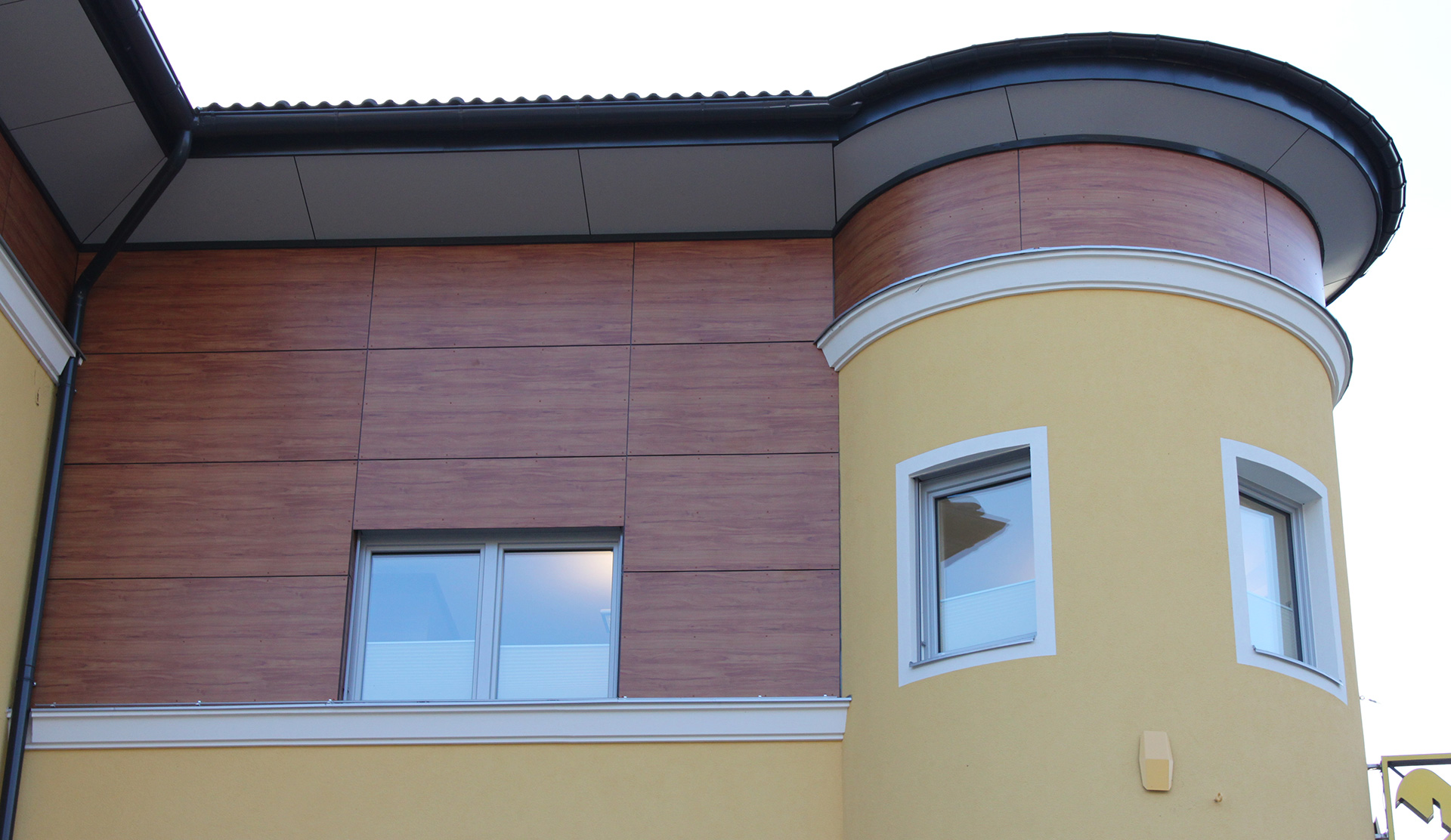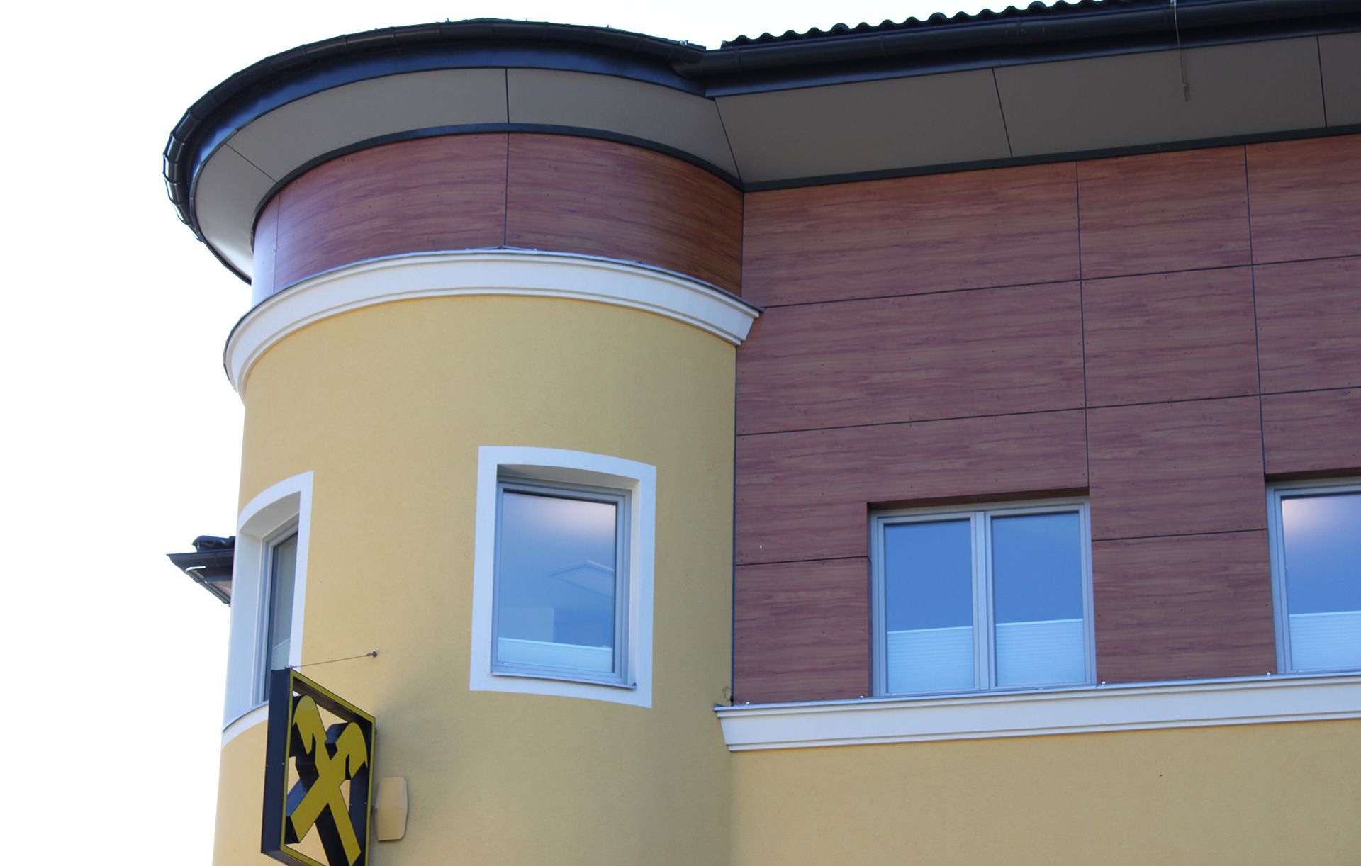Der Turm des Bankgebäudes wurde mit gerundeten Platten verkleidet. Die schräge Dachuntersicht in diesem Bereich wurde elliptisch vorgefertigt. Die verschiedenen Höhensprünge in den Eckbereichen wurden über Zerlegungen in Dreiecksflächen ausgeführt.