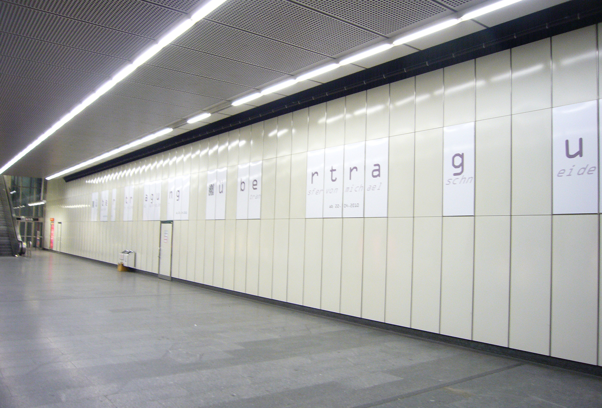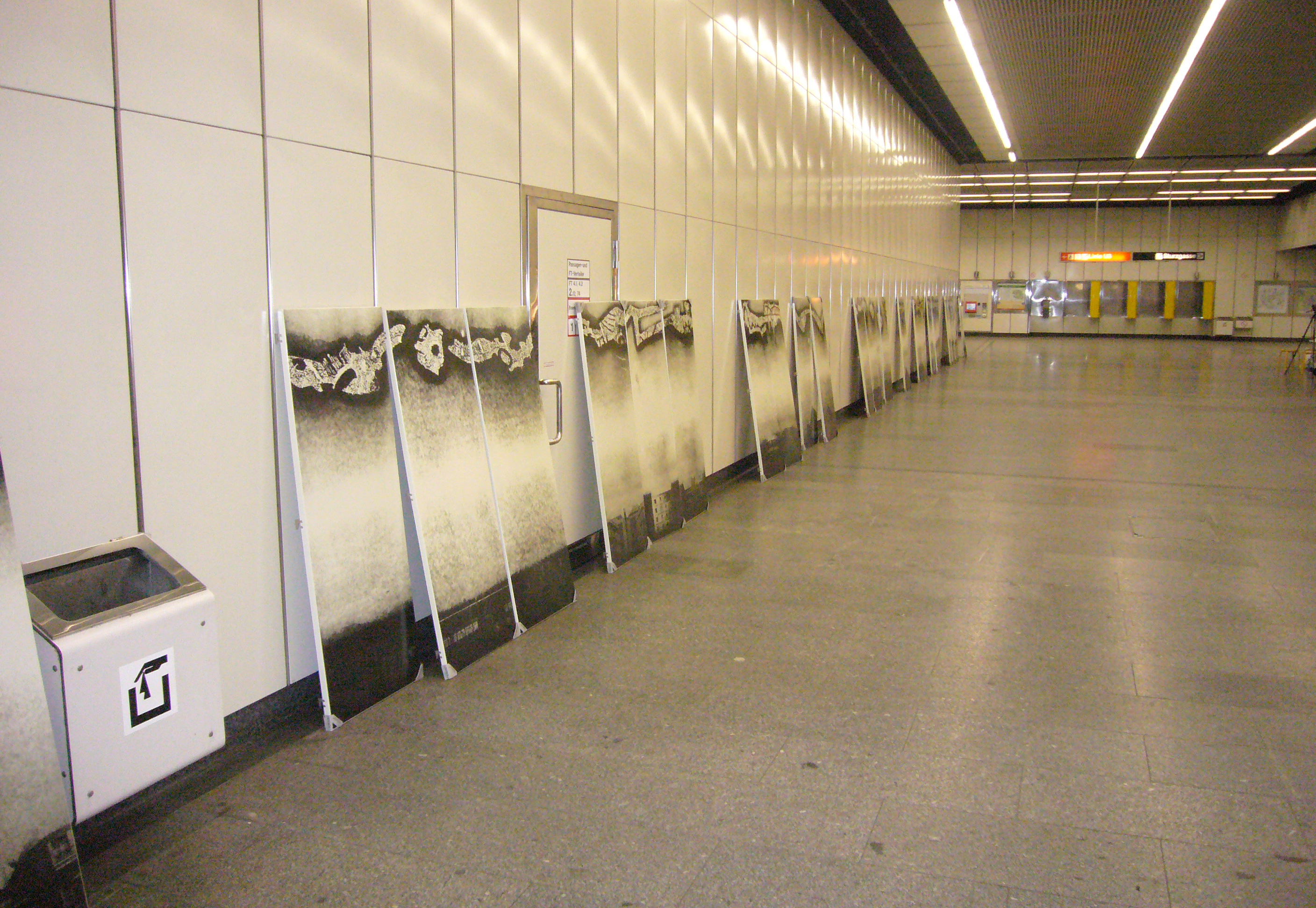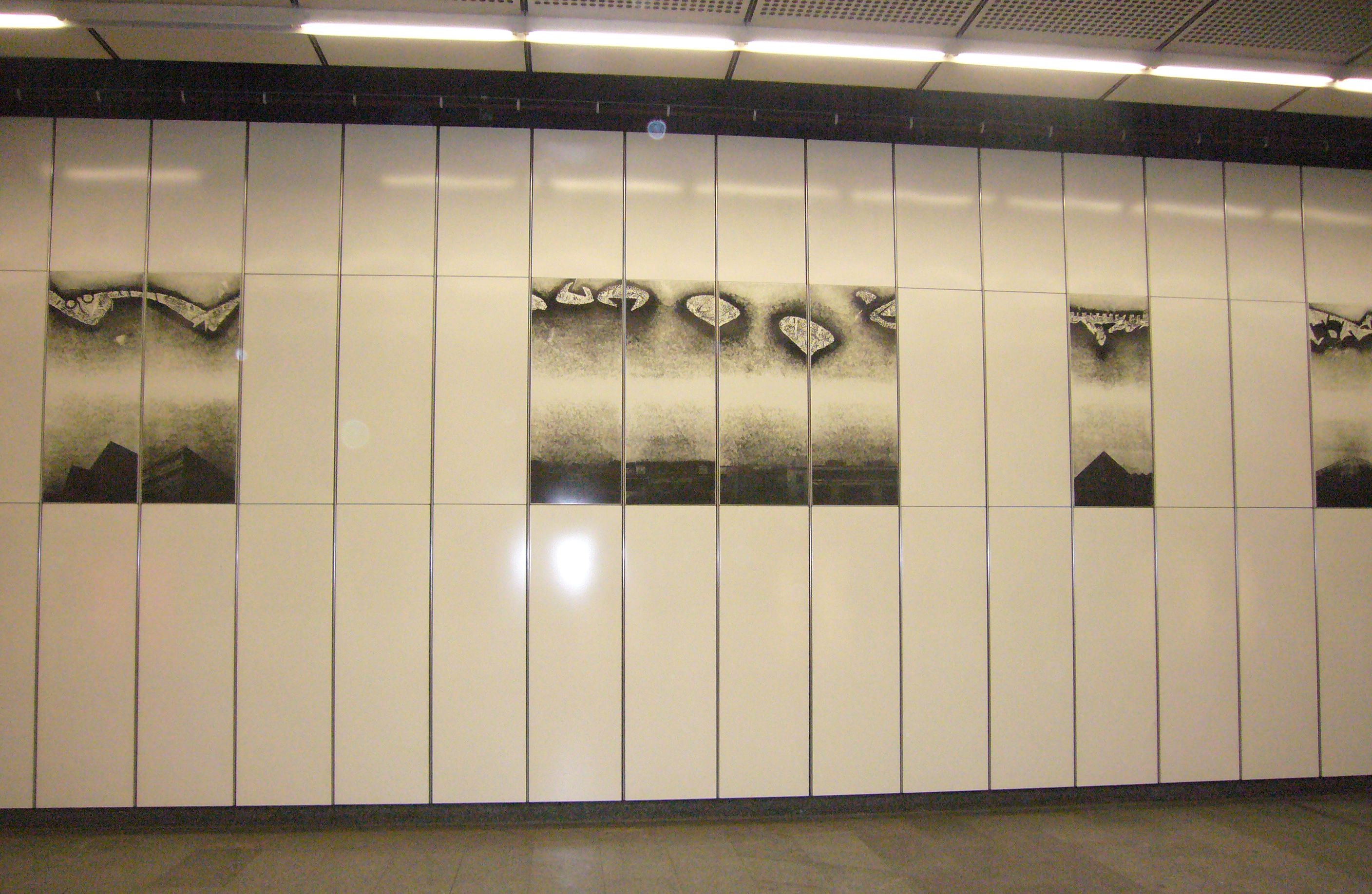 Das Kunstwerk vereint die abstrakte Gedankenwelt der Fahrgäste im oberen Teil des Bildes, mit den tatsächlichen Wahrnehmungen einer U-Bahnfahrt im unteren Bereich.
