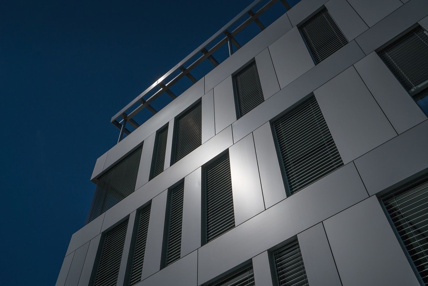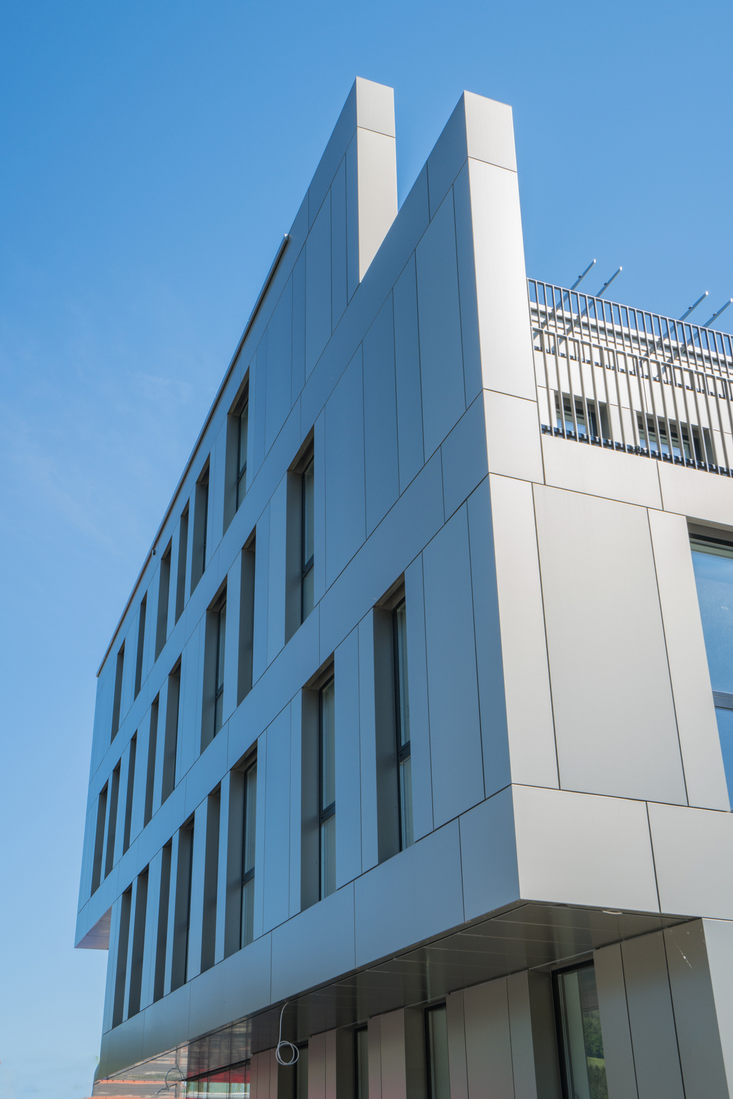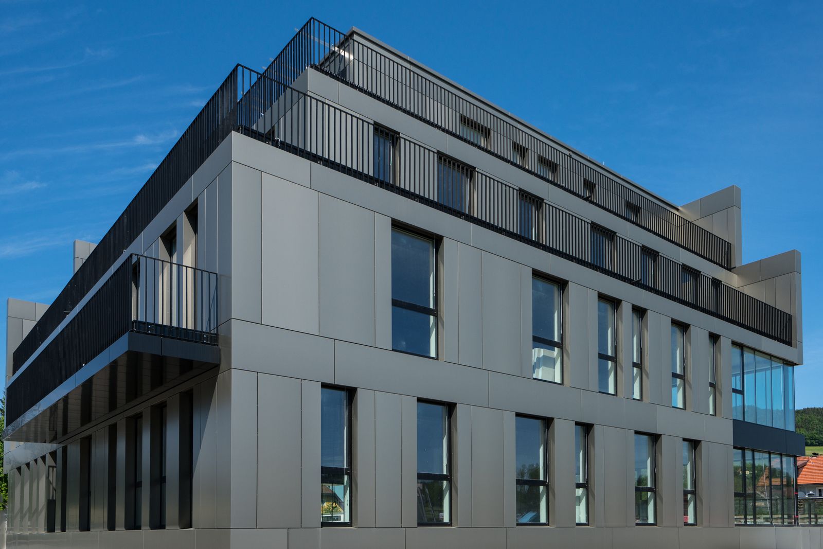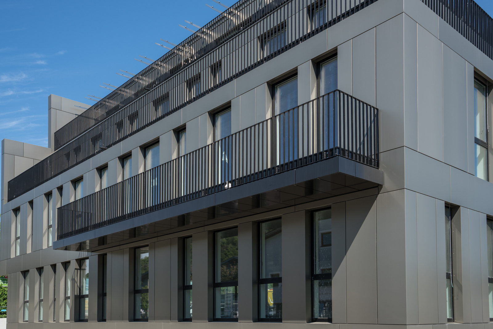 Dem nebenan stehenden Bürogebäude der Fa. Palfinger nachempfunden wurde auch hier die Fassade mit Aluverbundkassetten gestaltet. Durch die spezielle Oberfläche der Aluverbundplatte wird durch drehen der Kassetten ein wechselndes Farbmuster erzeugt. Als Kontrast zu der bronze-farbenen Fassade stehen schwarze Glas- und Geländer-Elemente.