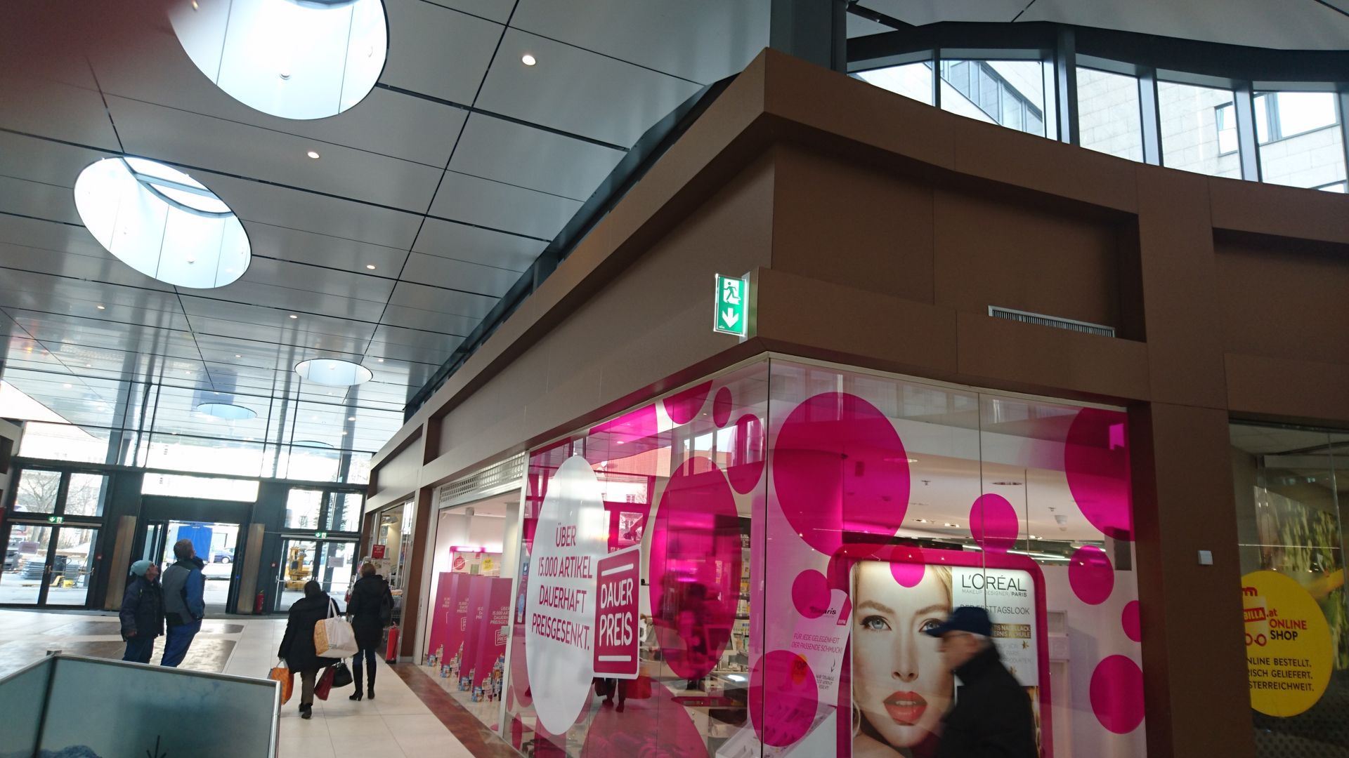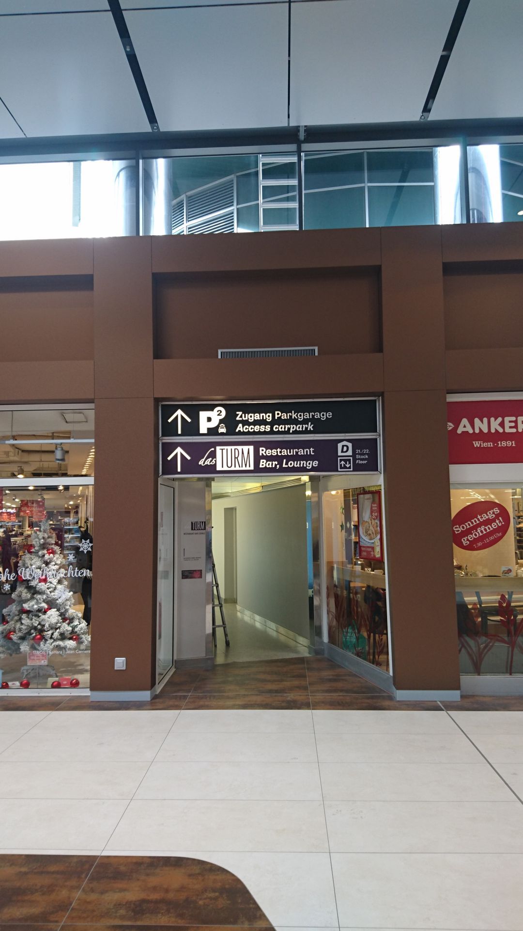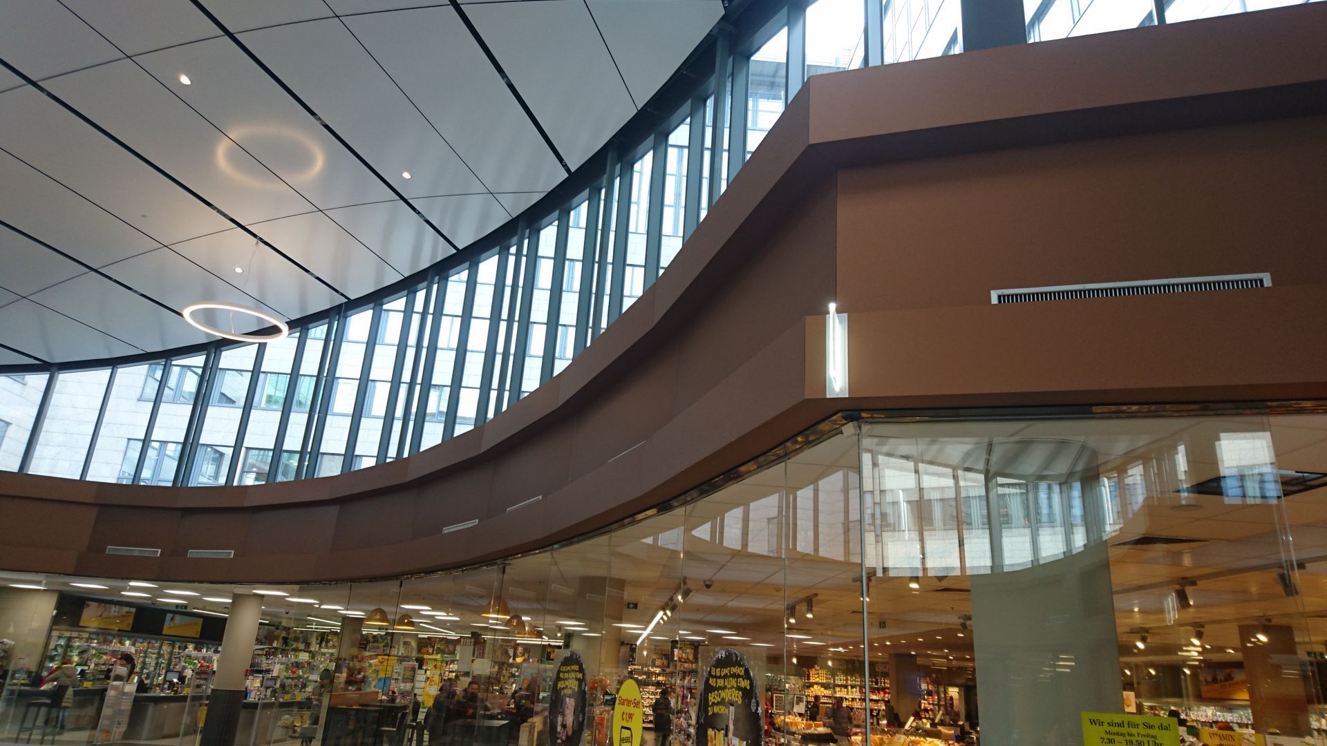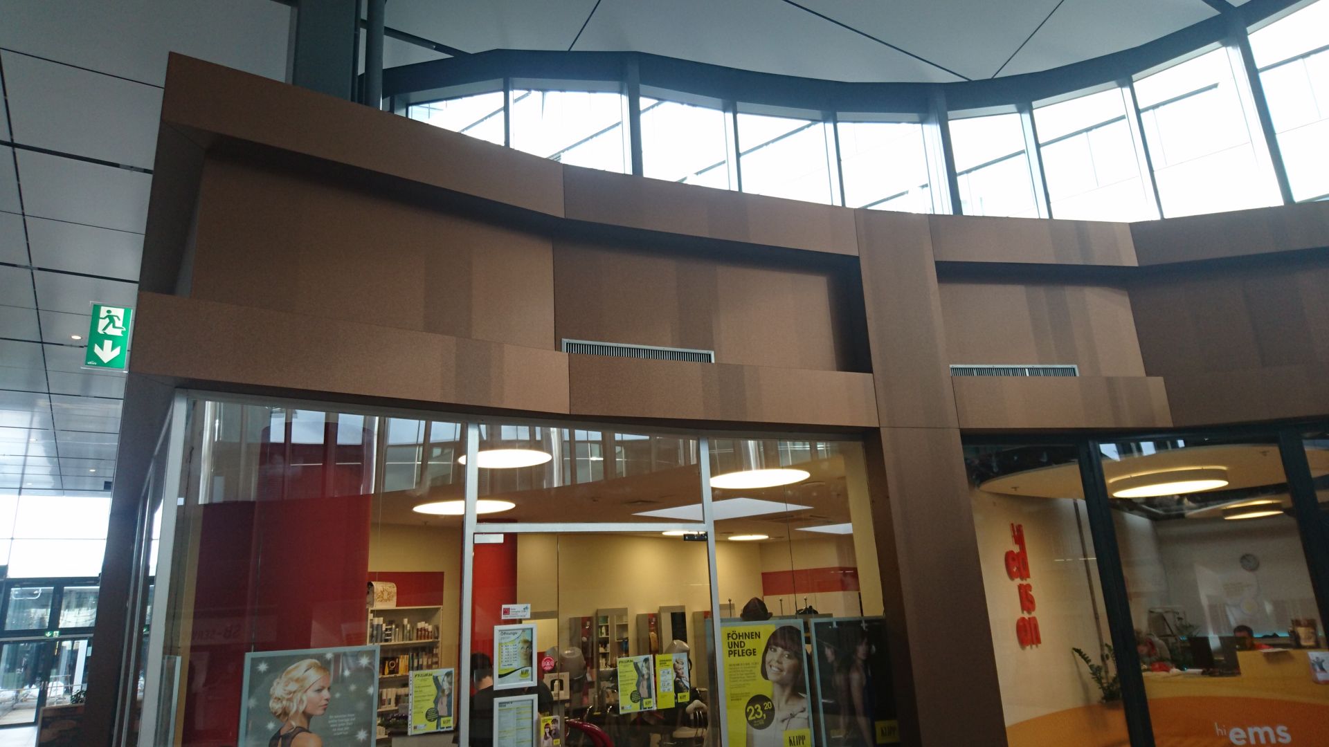 Durch die spezielle Geometrie der elliptischen Mall musste jede Alucobondplatte in diesem Bereich vor Ort angepasst werden und auf die von uns vorbereitete Aluunterkonstruktion geklebt werden. Da die Geschäfte aber immer in Vollbetrieb waren, wurde hauptsächlich in der Nacht an den Verkleidungen gebaut um keine Passanten zu stören.